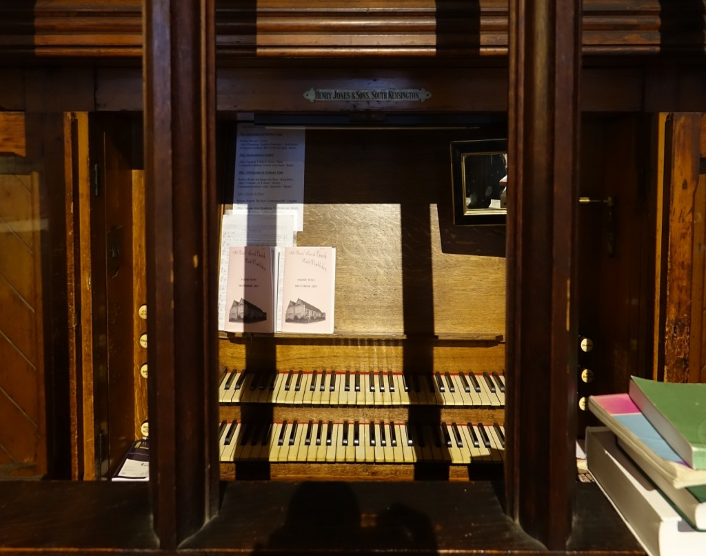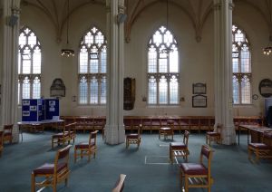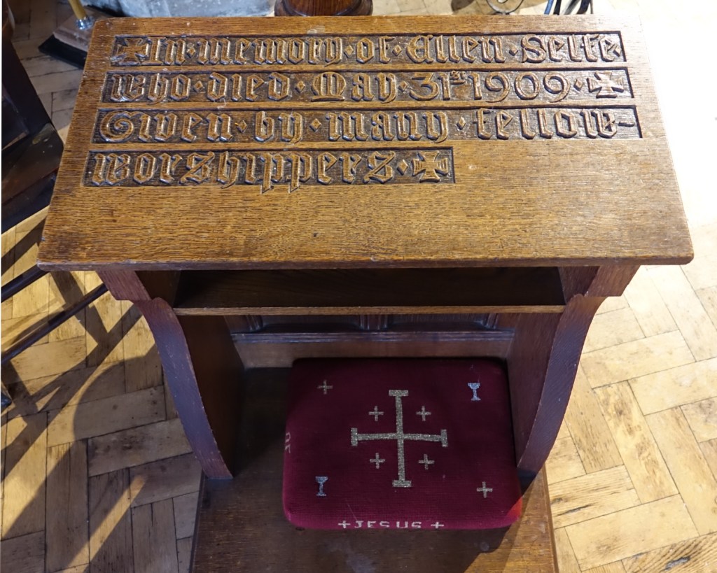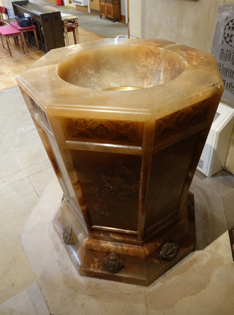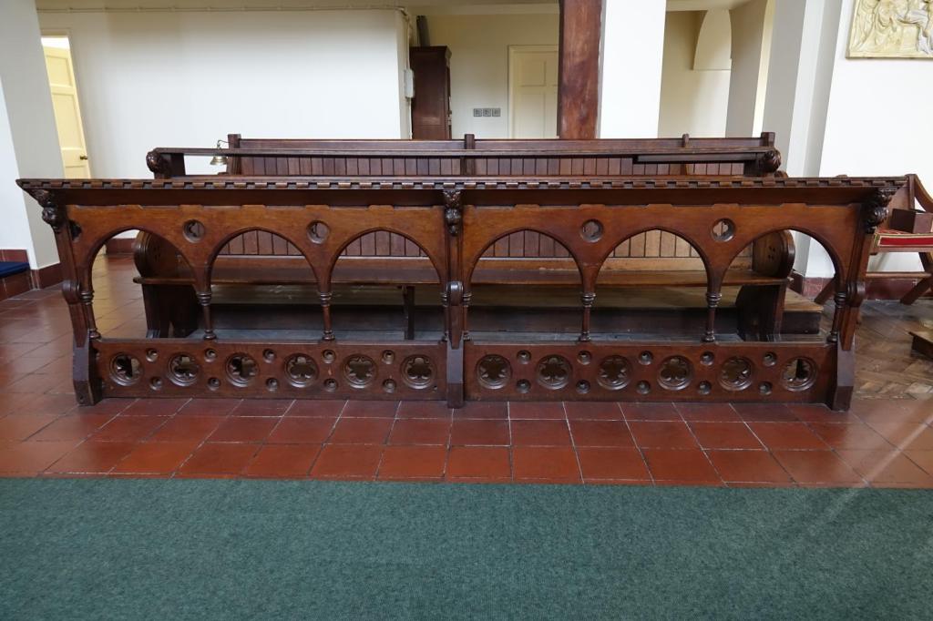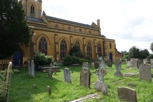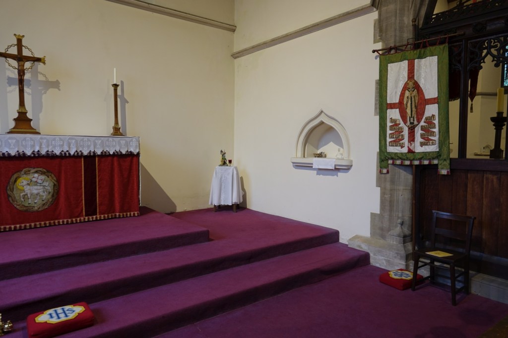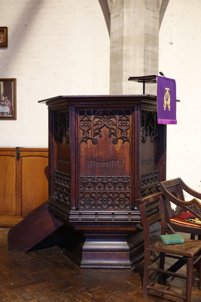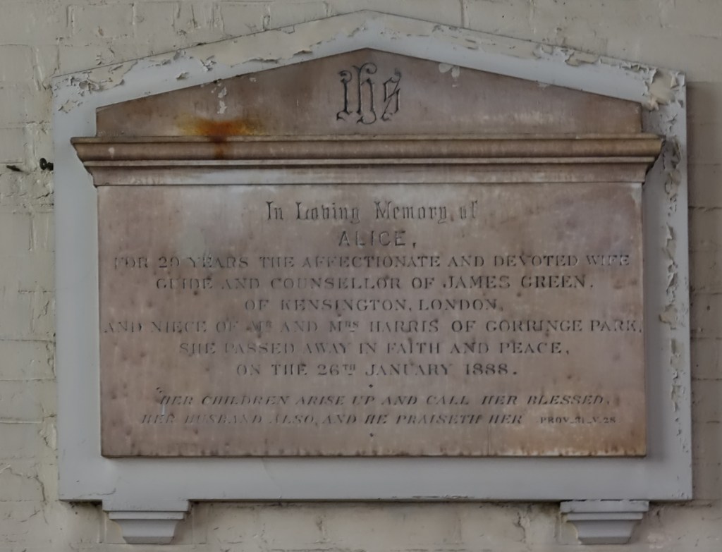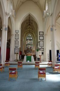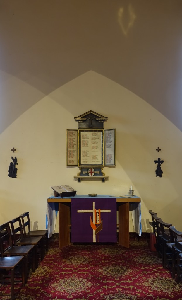 Facing Mitcham Green, this is a small church of 1888 by F.A. Walters. The font now sits outside in the garden at the east end.