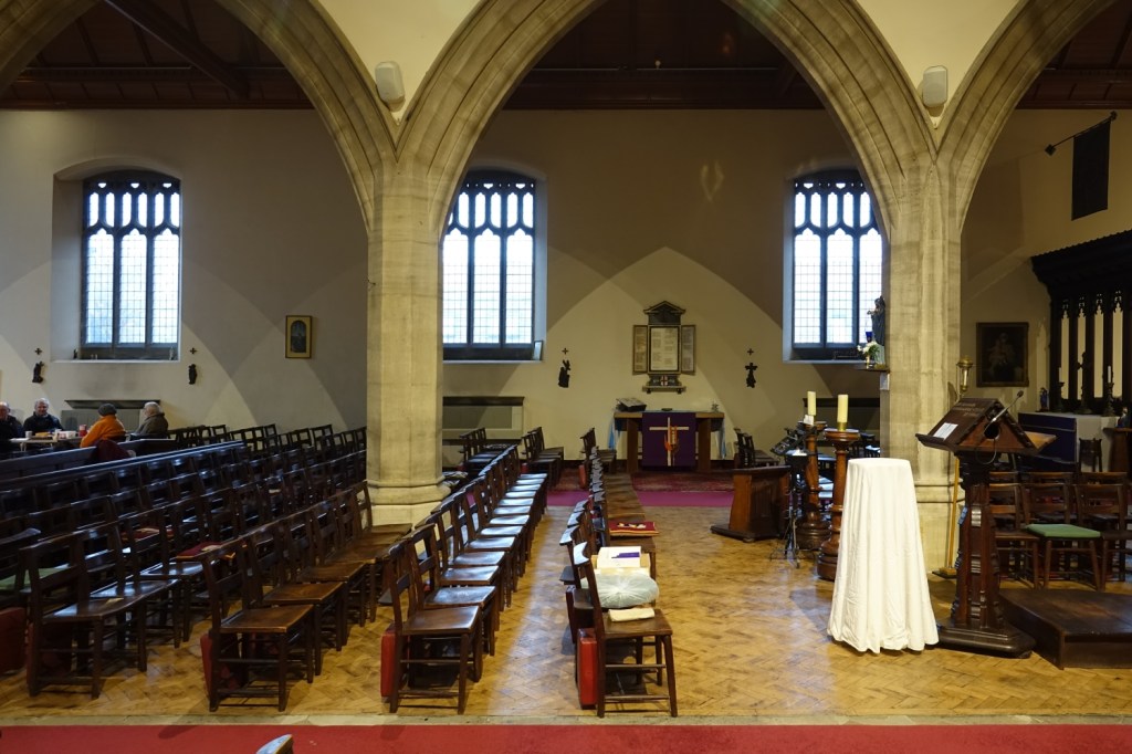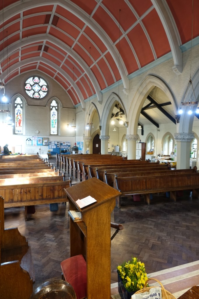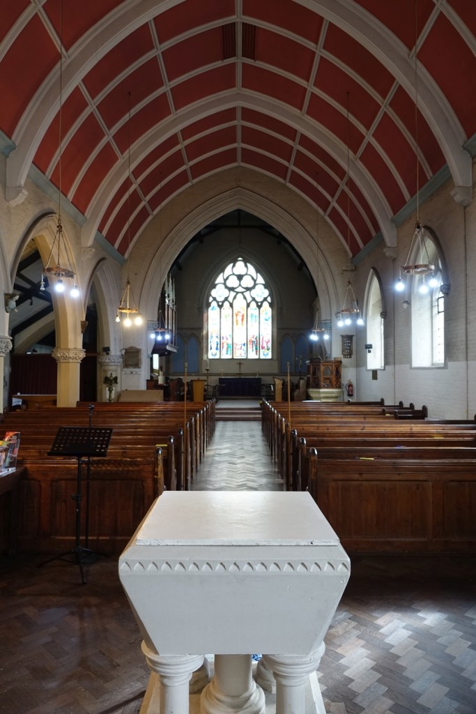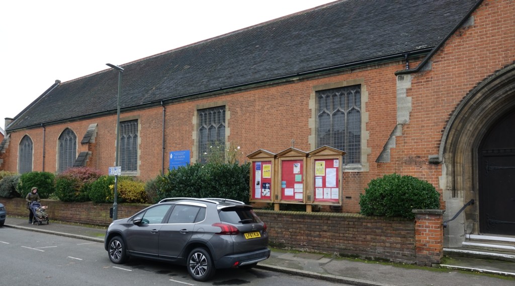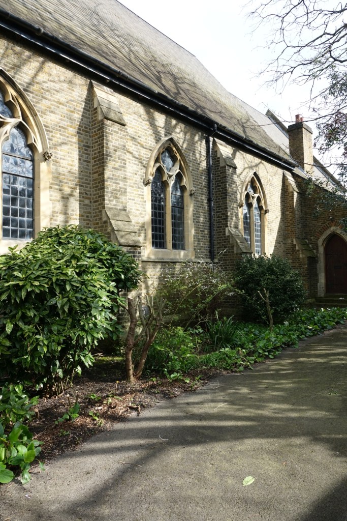 A short way south of Colliers Wood tube station. It’s a church of 1875 by F. & H. Francis. The post war glass is by Miles & Rachel de Montmorency.