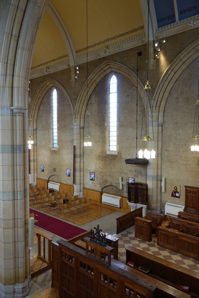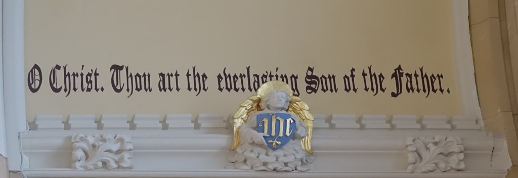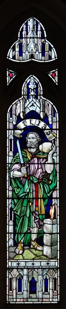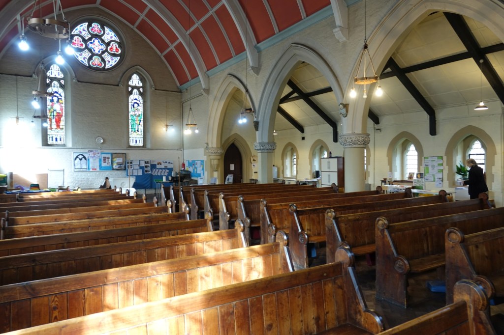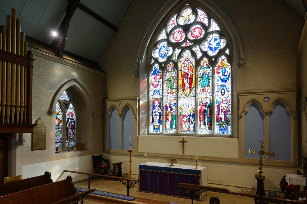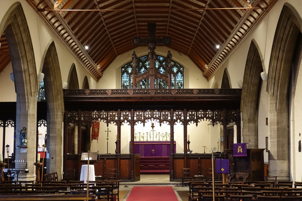 A short way south of Colliers Wood tube station. It’s a church of 1875 by F. & H. Francis. The post war glass is by Miles & Rachel de Montmorency.