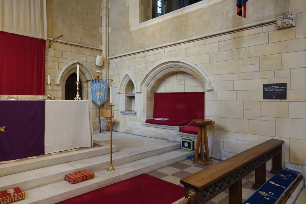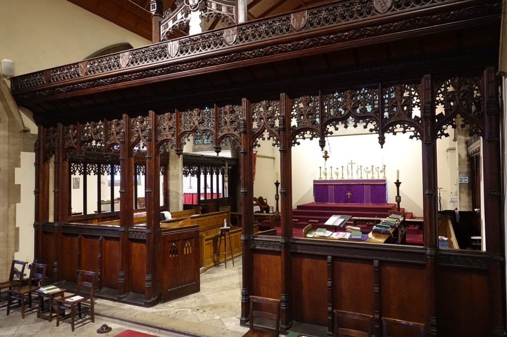 Away from main roads. The church is by J.T. Micklethwaite and Somers-Clarke and dates from 1891-93.