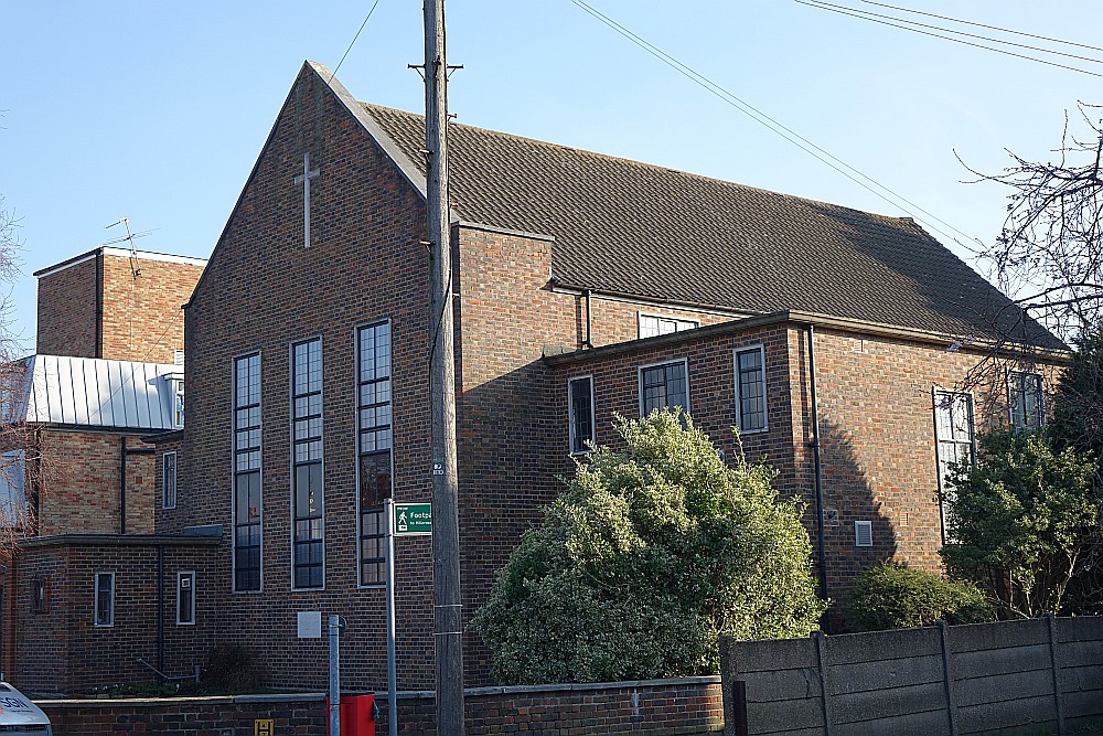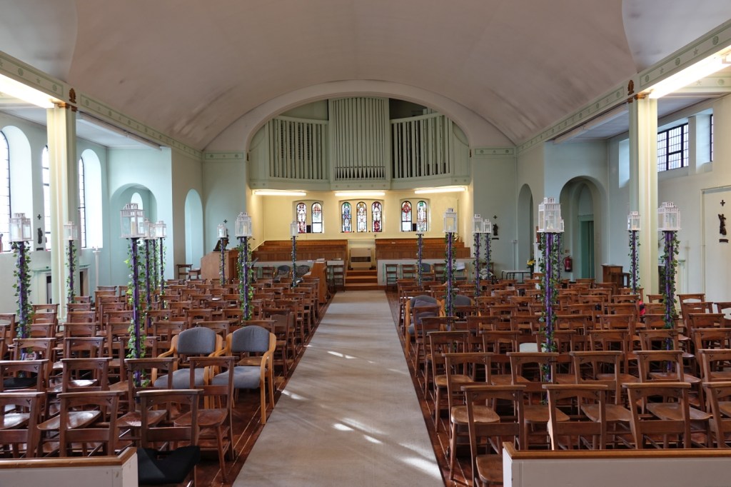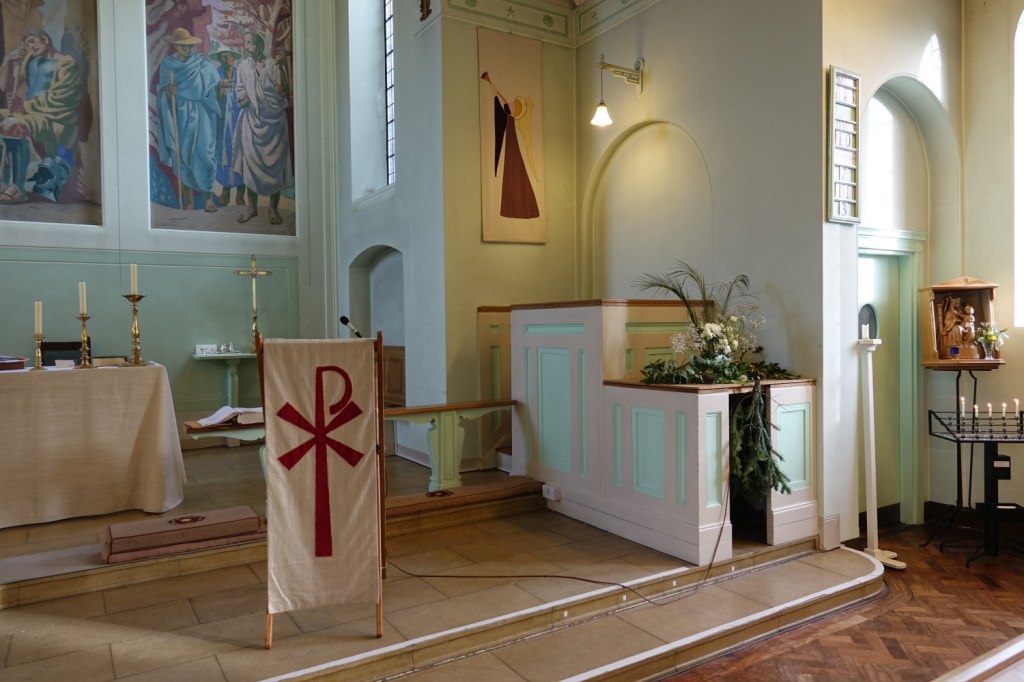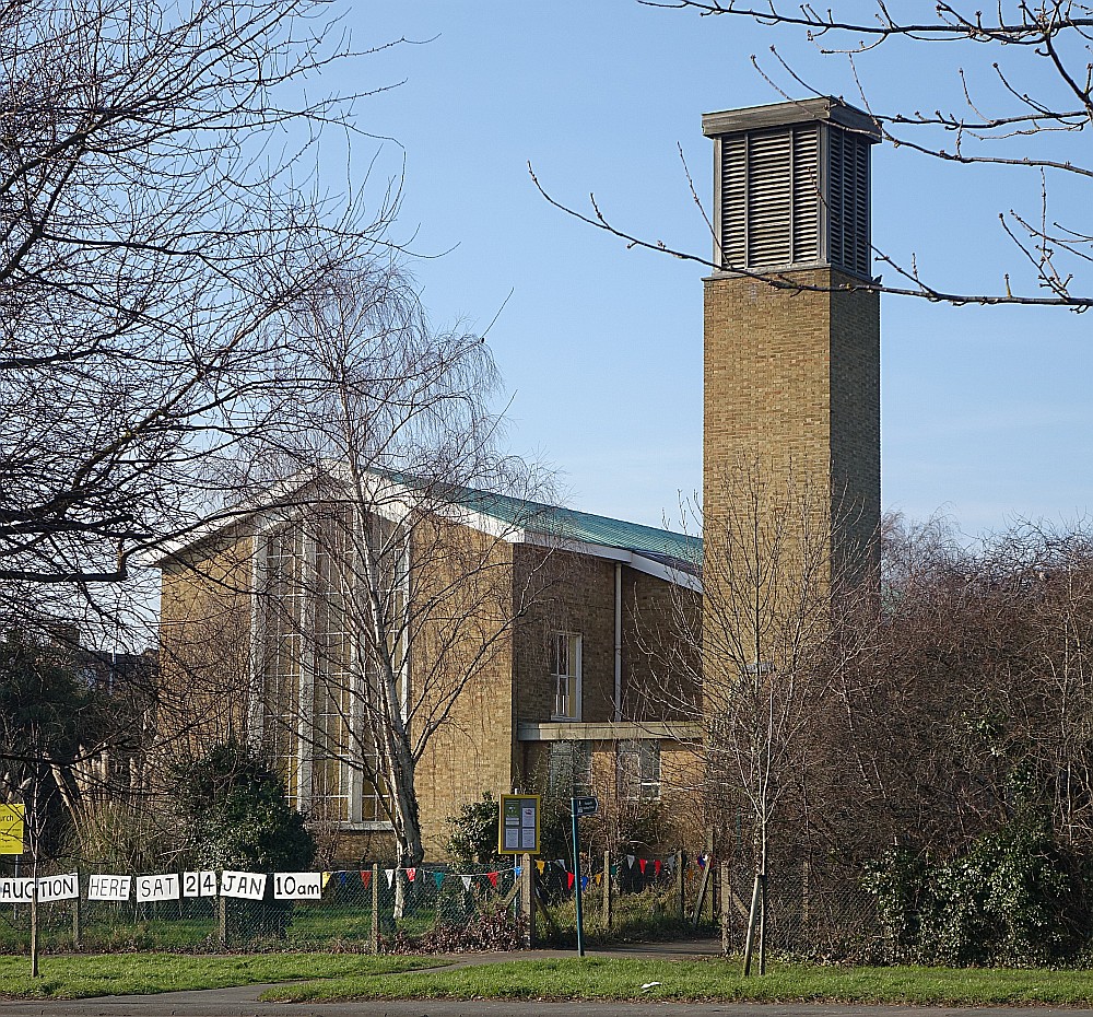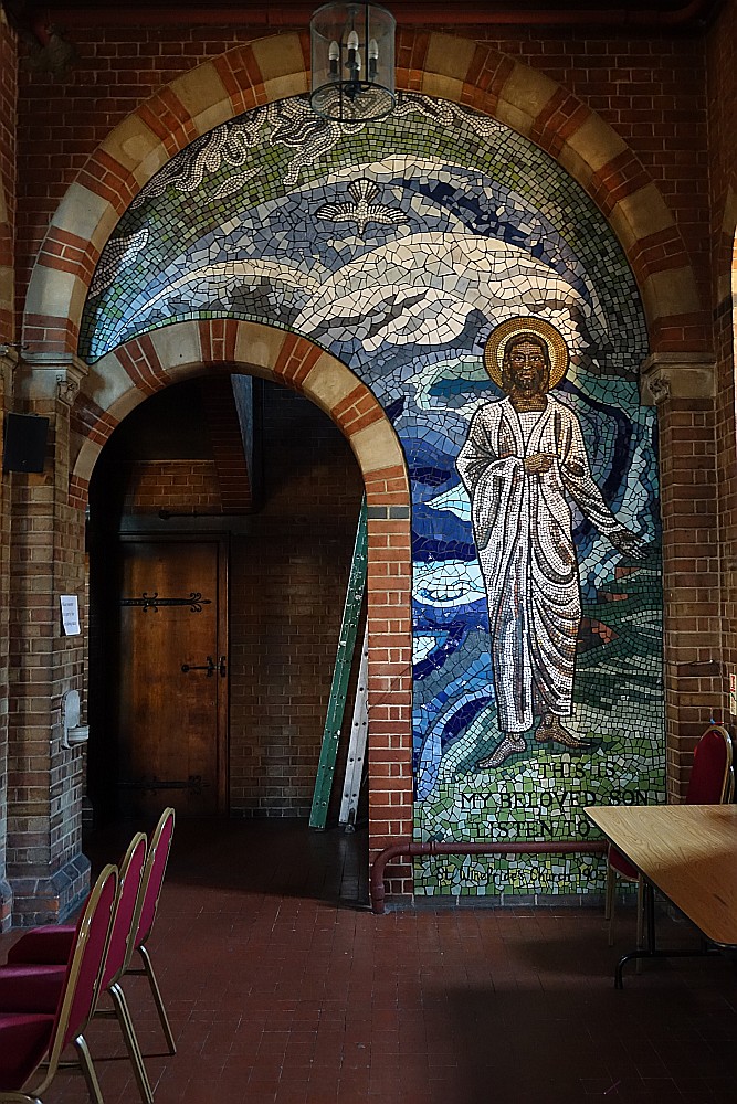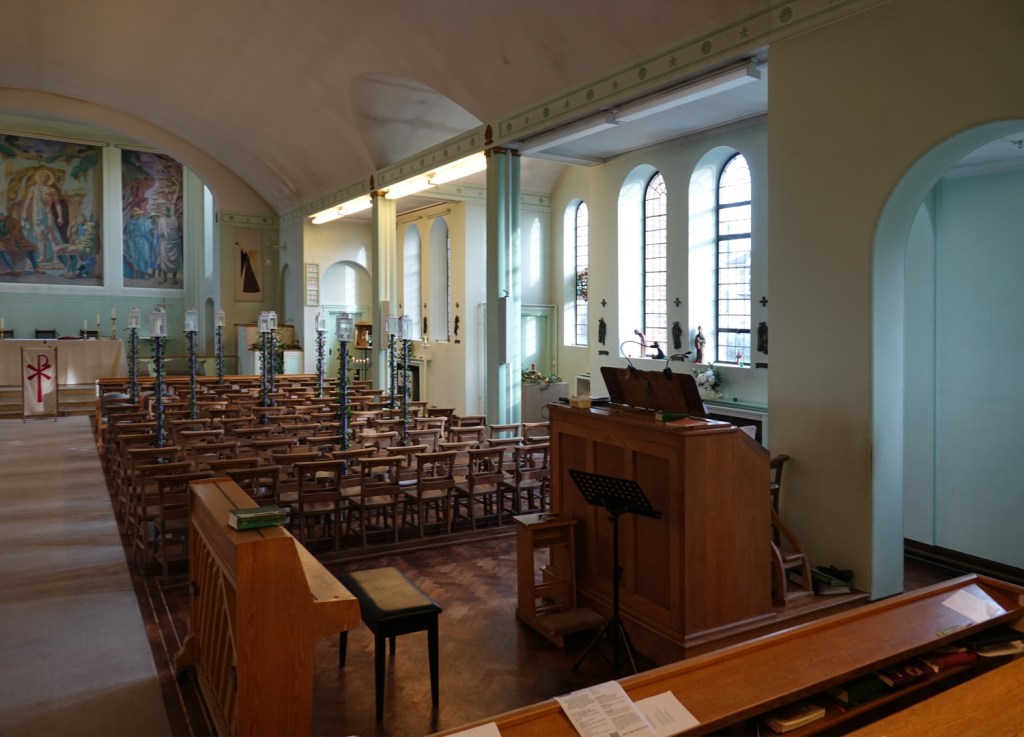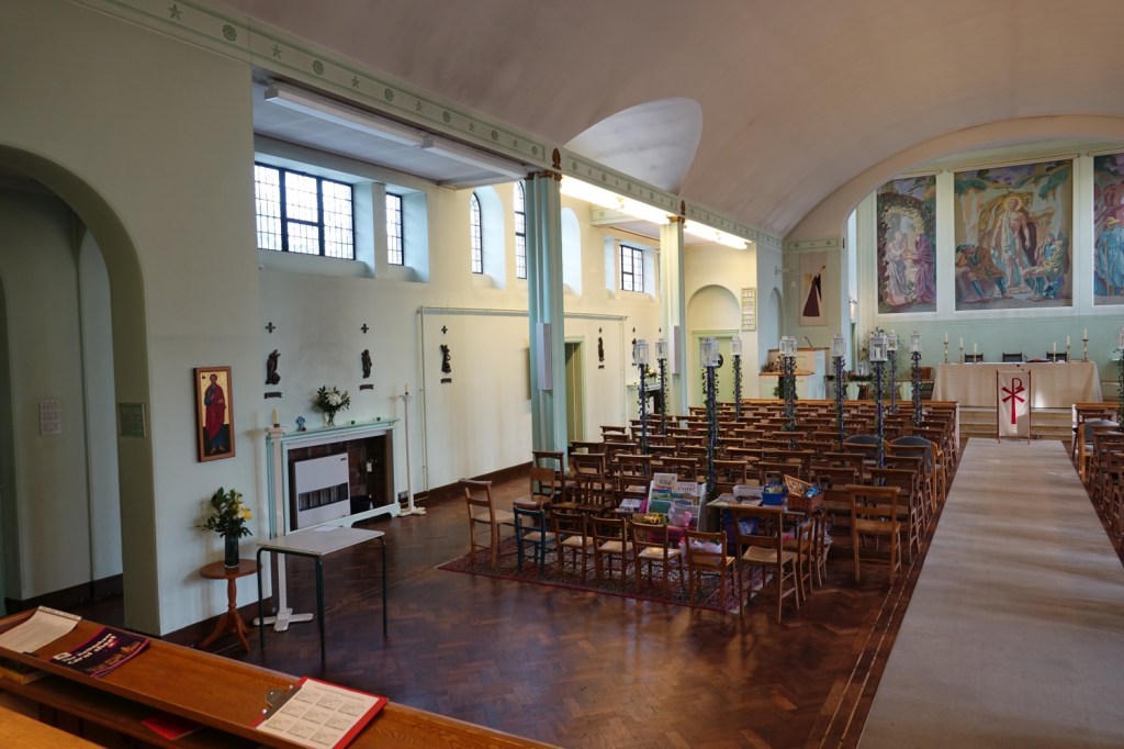 Two churches at right angles to each other. The older one was built in 1934 as a hall and church and became a hall when the newer one facing the street was built in 1956-57. Both are by T.F. Ford. The current church features murals by Hans Feibusch and glass by John Hayward. The older building is shown at the end of the images. There is a separate Lady Chapel off the lobby linking the hall and church.