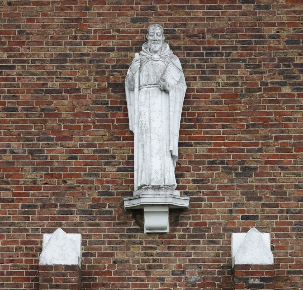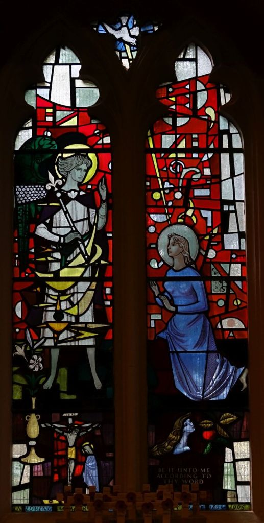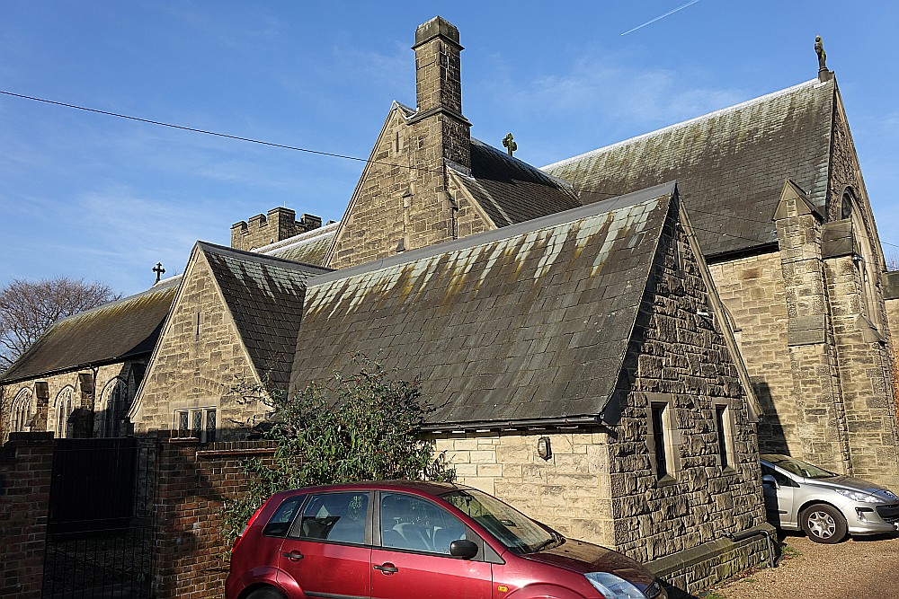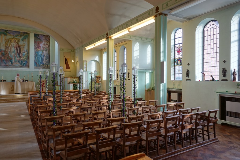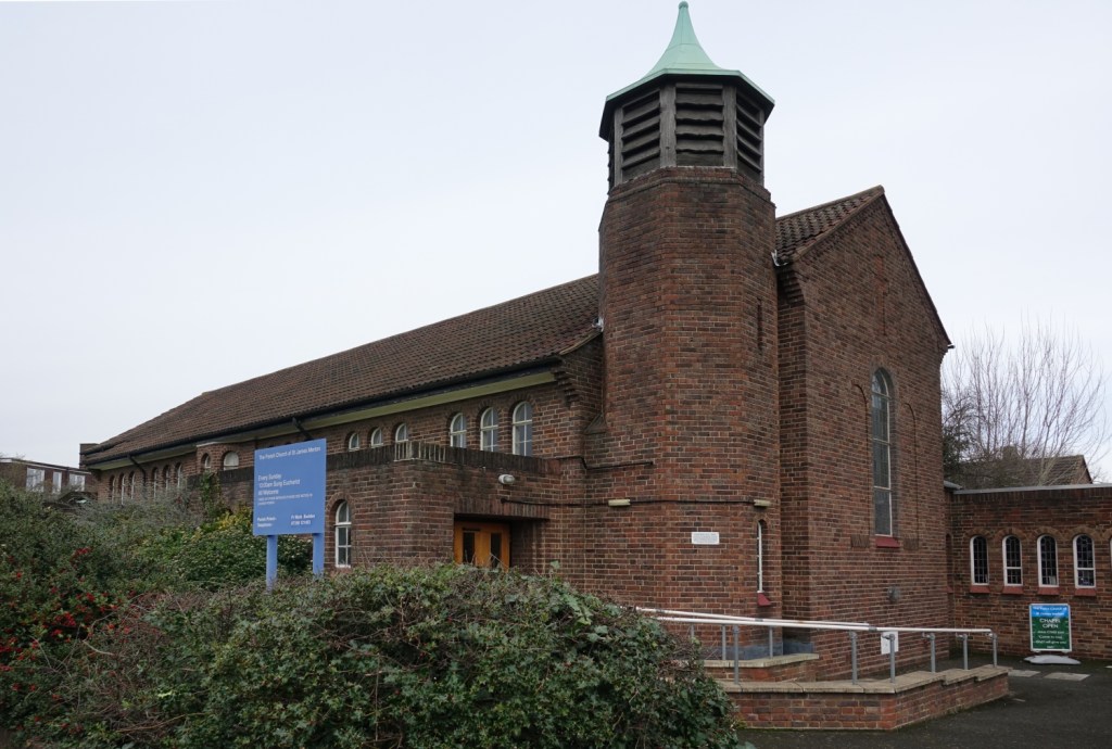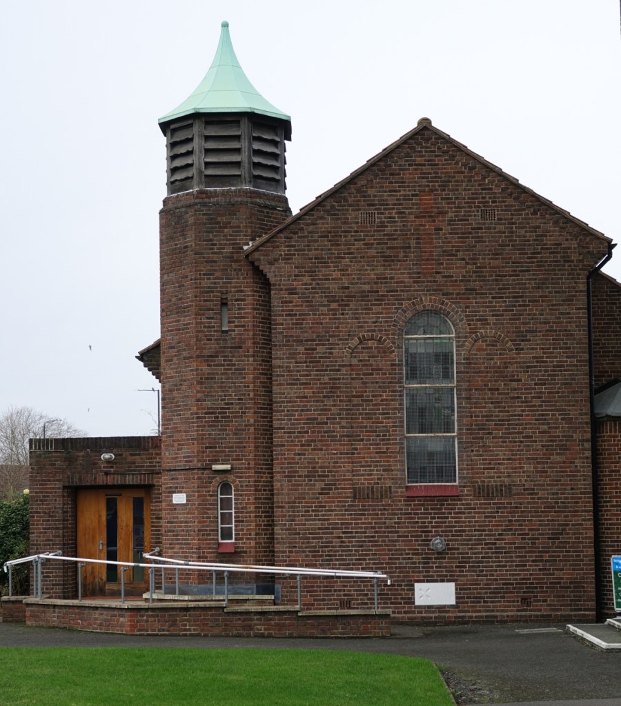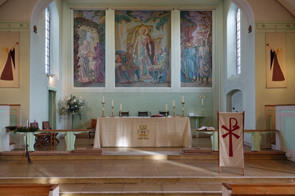 Two churches at right angles to each other. The older one was built in 1934 as a hall and church and became a hall when the newer one facing the street was built in 1956-57. Both are by T.F. Ford. The current church features murals by Hans Feibusch and glass by John Hayward. The older building is shown at the end of the images. There is a separate Lady Chapel off the lobby linking the hall and church.