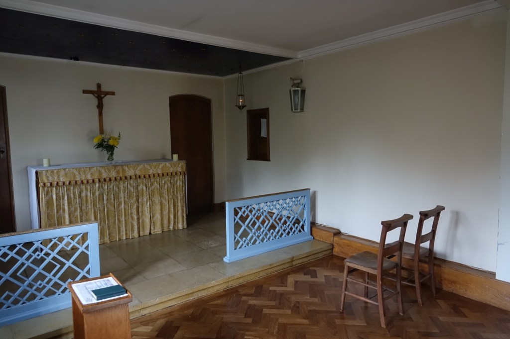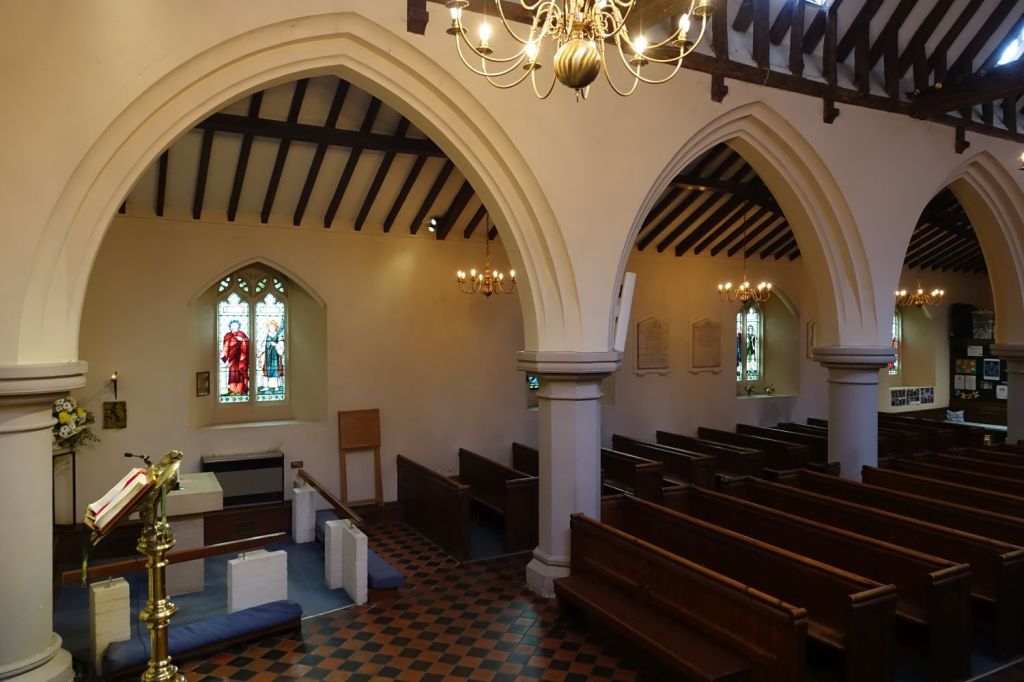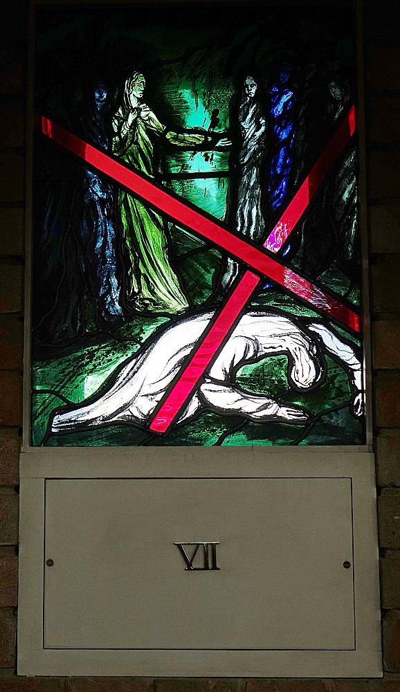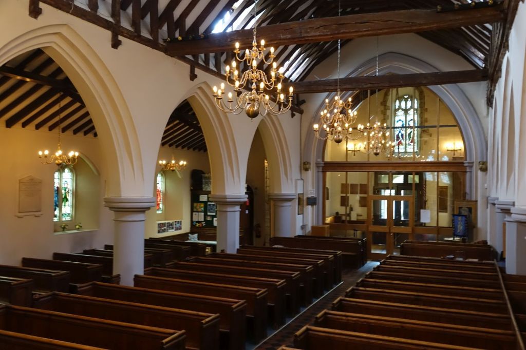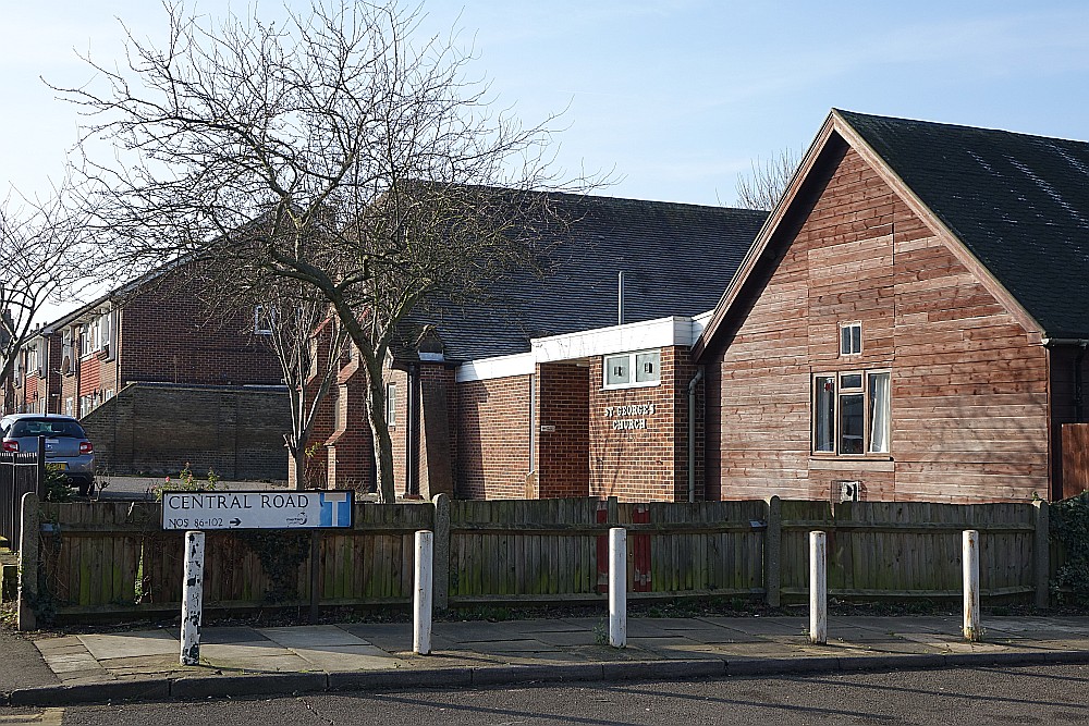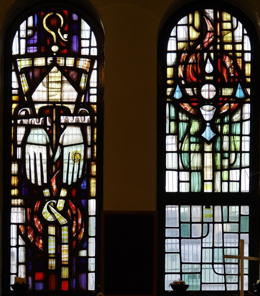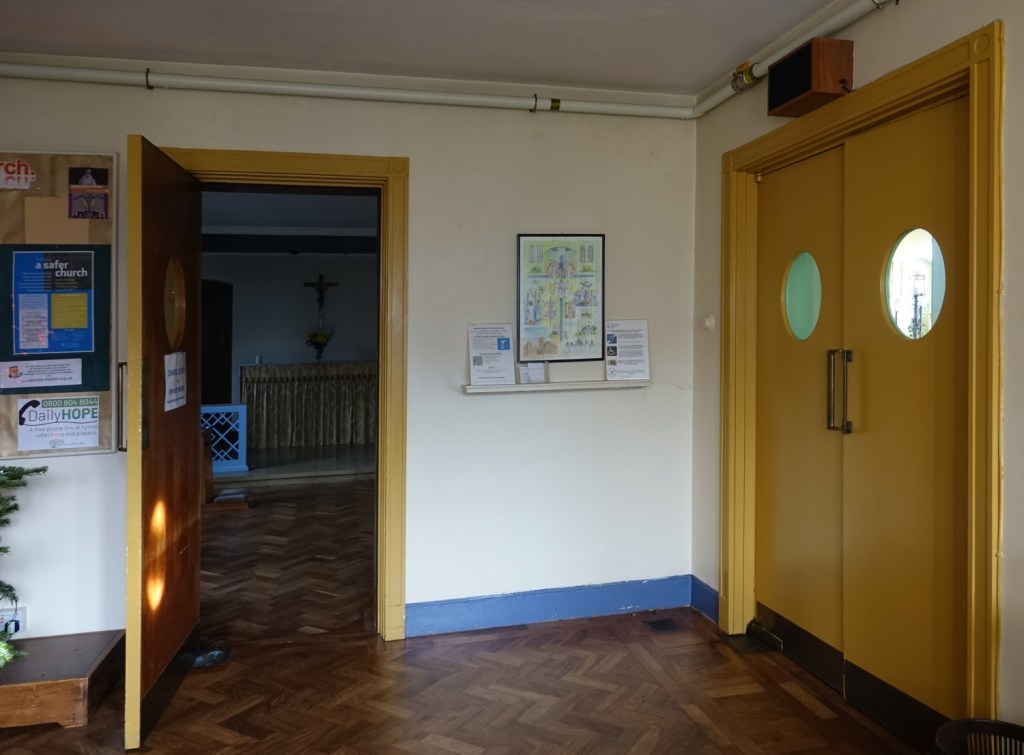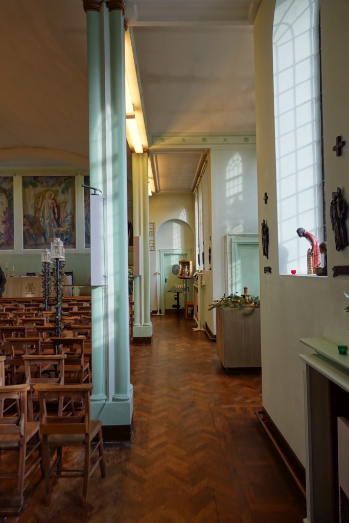 Two churches at right angles to each other. The older one was built in 1934 as a hall and church and became a hall when the newer one facing the street was built in 1956-57. Both are by T.F. Ford. The current church features murals by Hans Feibusch and glass by John Hayward. The older building is shown at the end of the images. There is a separate Lady Chapel off the lobby linking the hall and church.