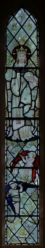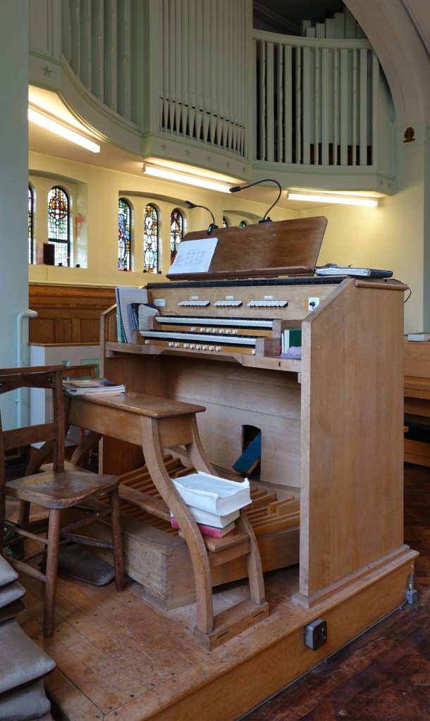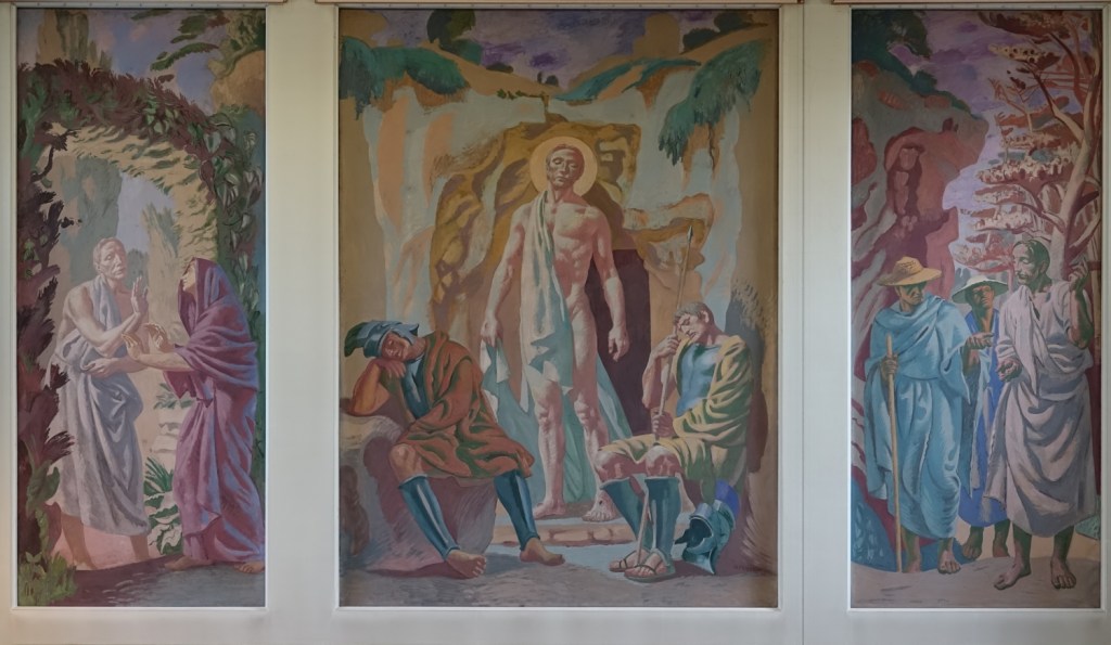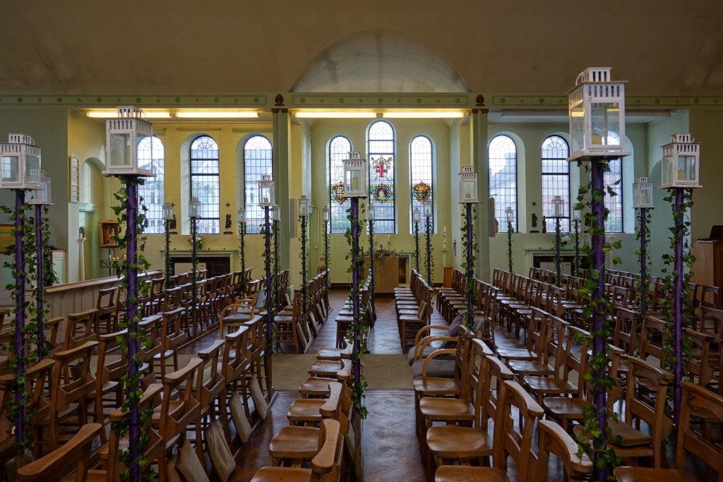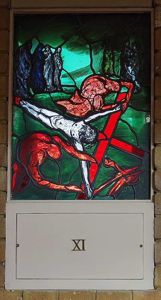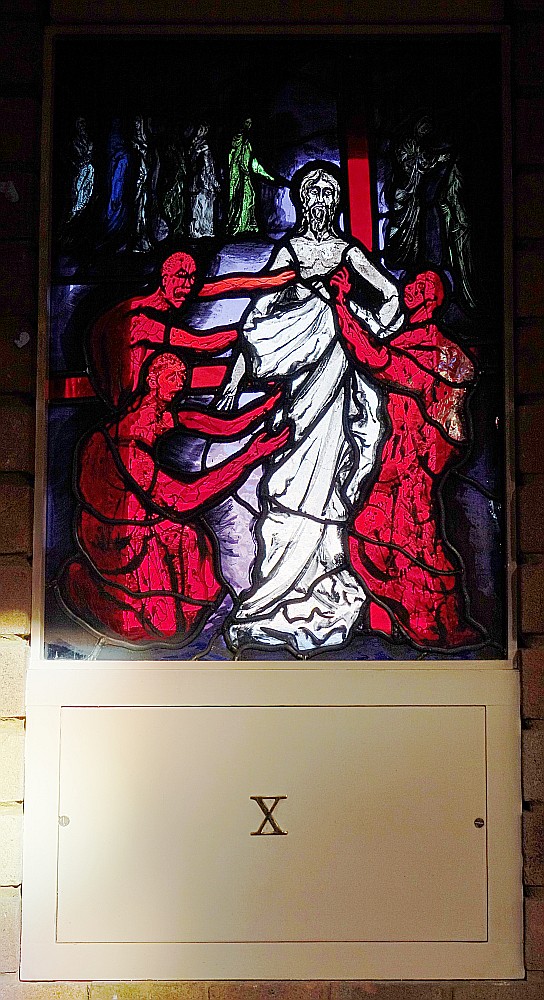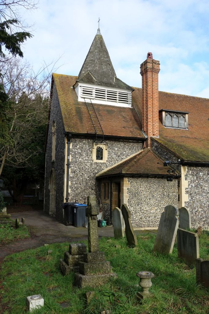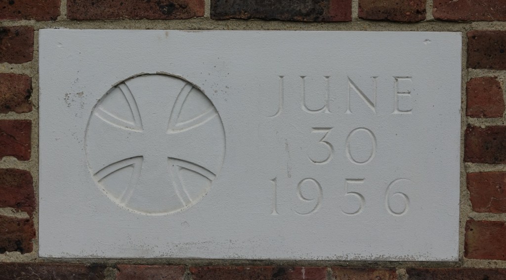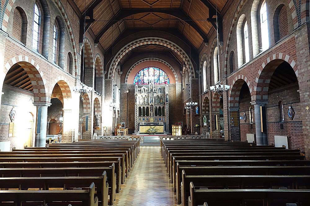 Two churches at right angles to each other. The older one was built in 1934 as a hall and church and became a hall when the newer one facing the street was built in 1956-57. Both are by T.F. Ford. The current church features murals by Hans Feibusch and glass by John Hayward. The older building is shown at the end of the images. There is a separate Lady Chapel off the lobby linking the hall and church.