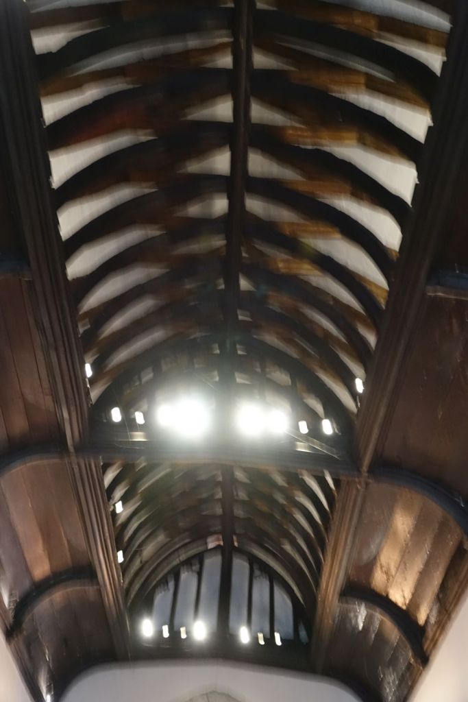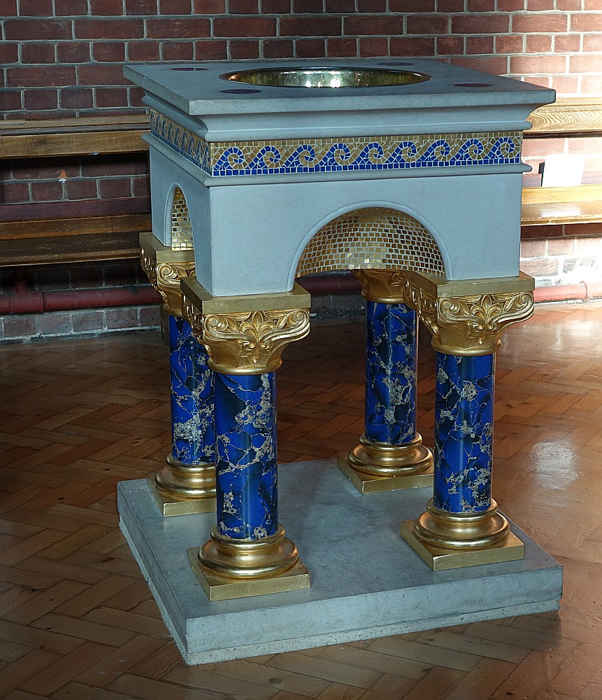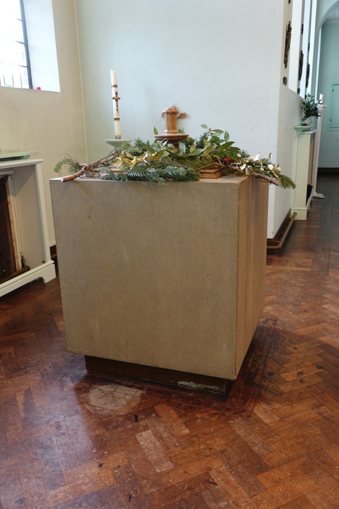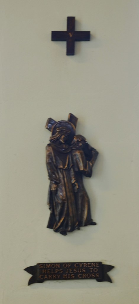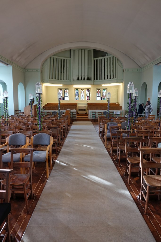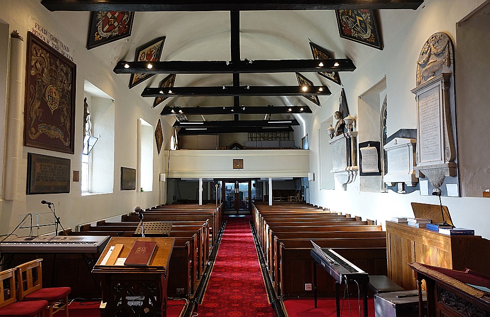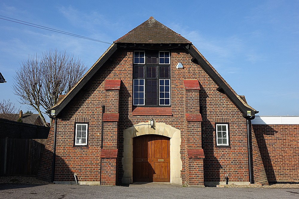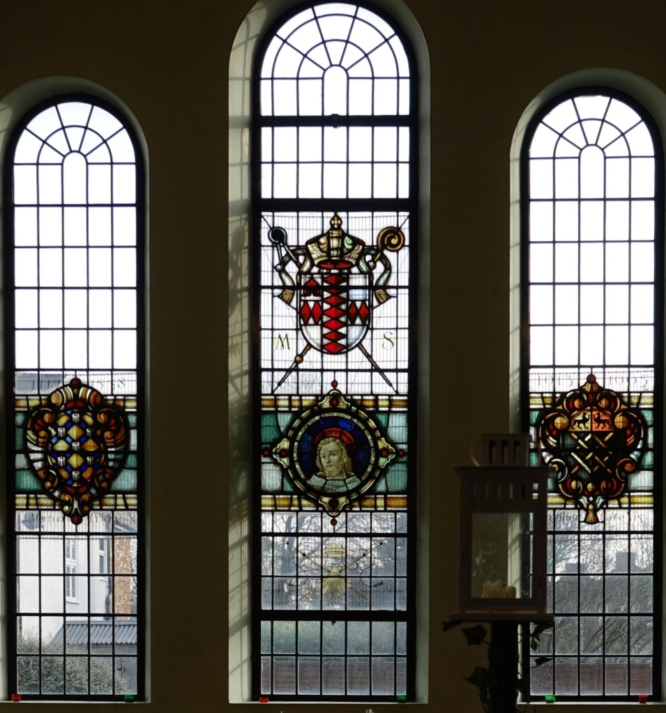 Two churches at right angles to each other. The older one was built in 1934 as a hall and church and became a hall when the newer one facing the street was built in 1956-57. Both are by T.F. Ford. The current church features murals by Hans Feibusch and glass by John Hayward. The older building is shown at the end of the images. There is a separate Lady Chapel off the lobby linking the hall and church.
