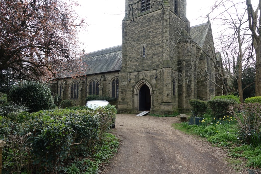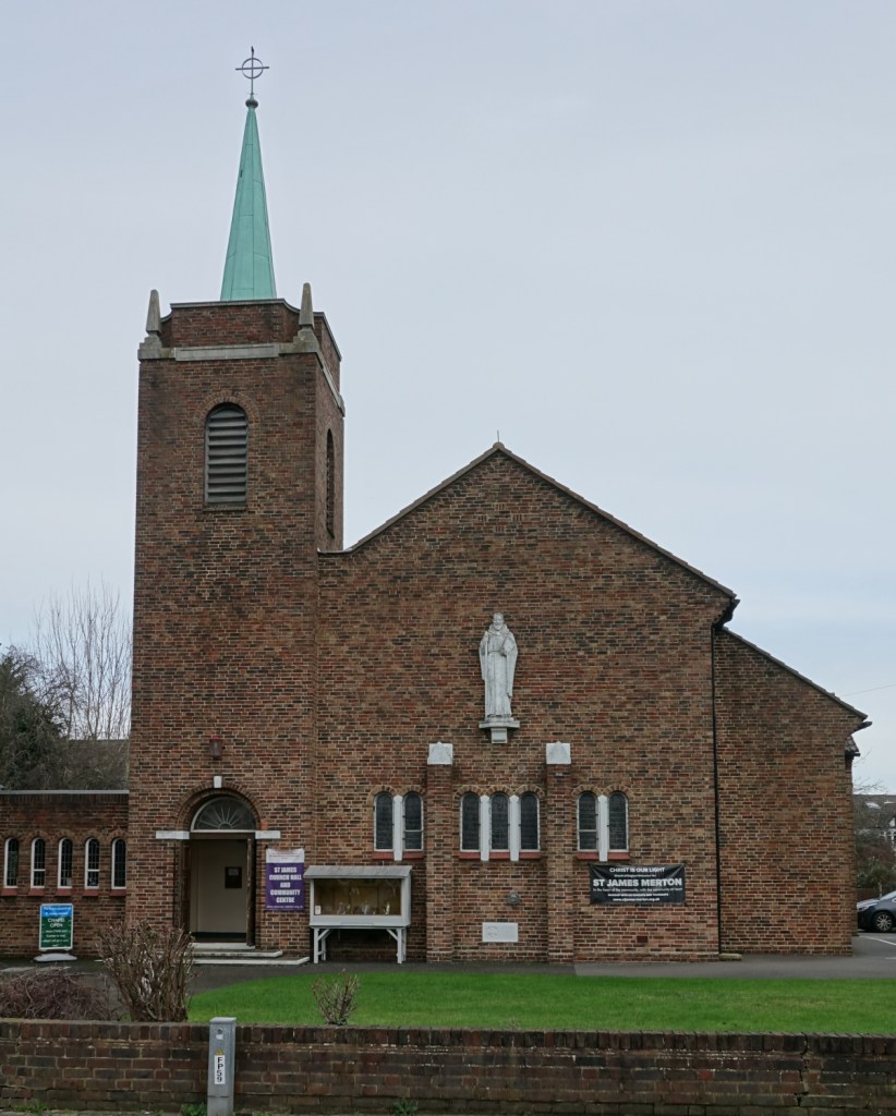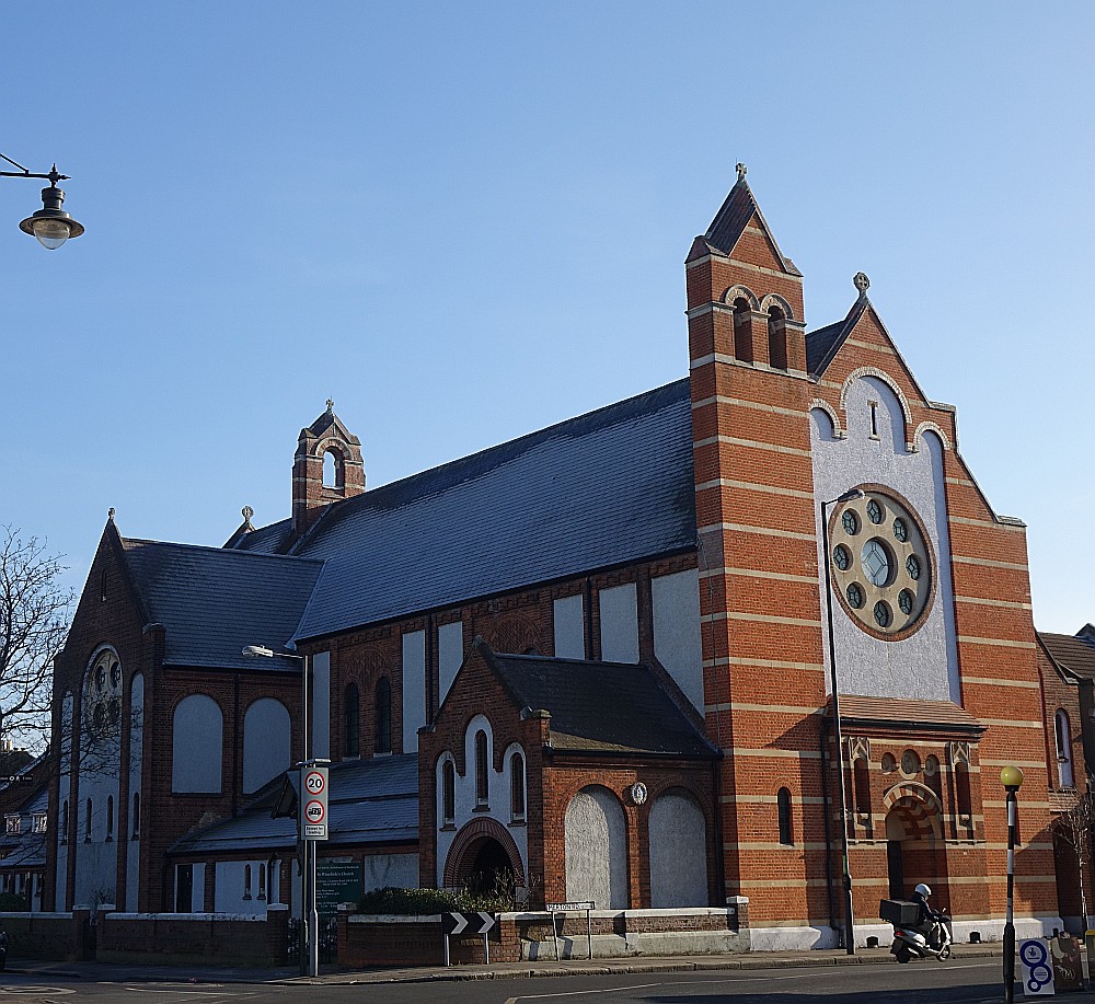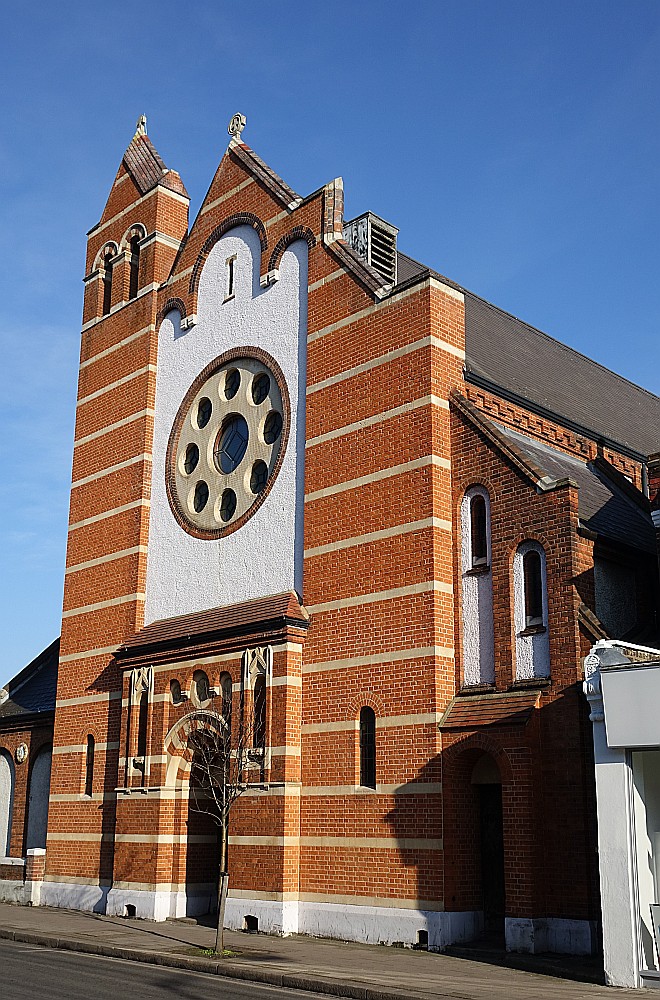Near South Wimbledon Station. On a cramped site, a church by C.H. Gage of 1914.