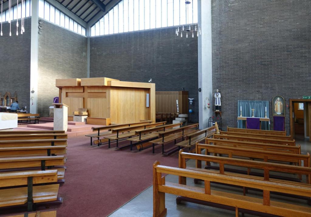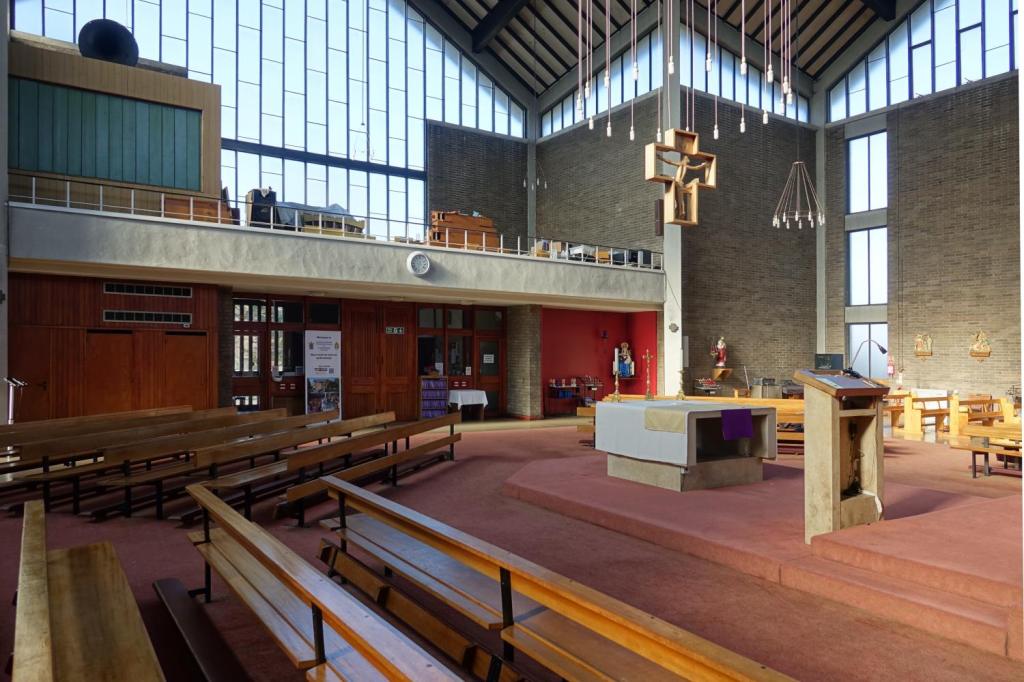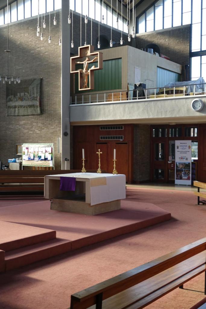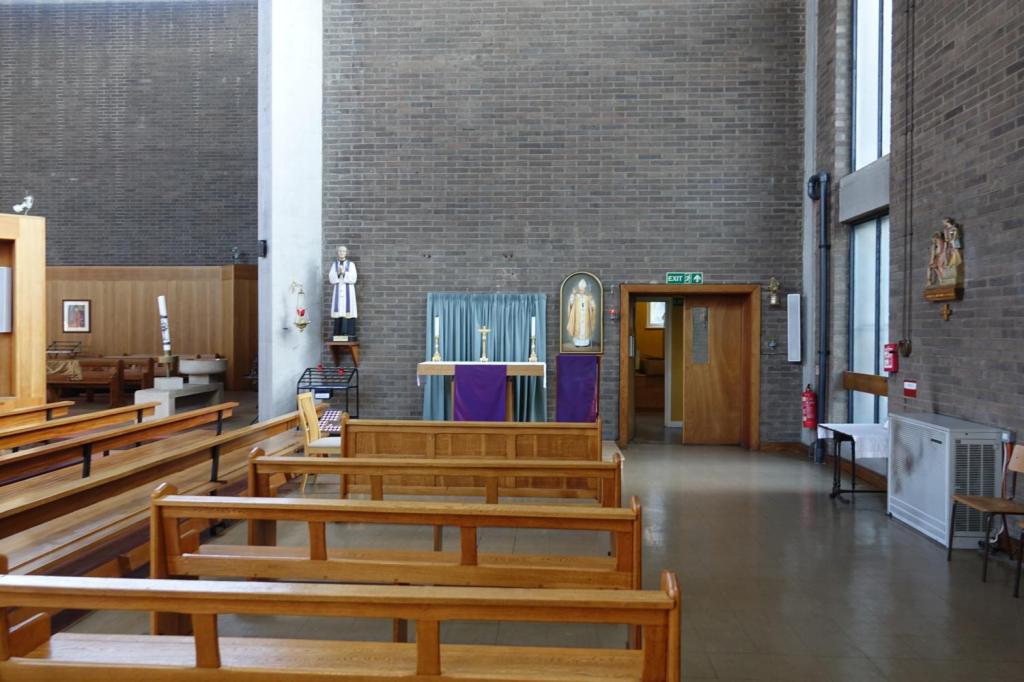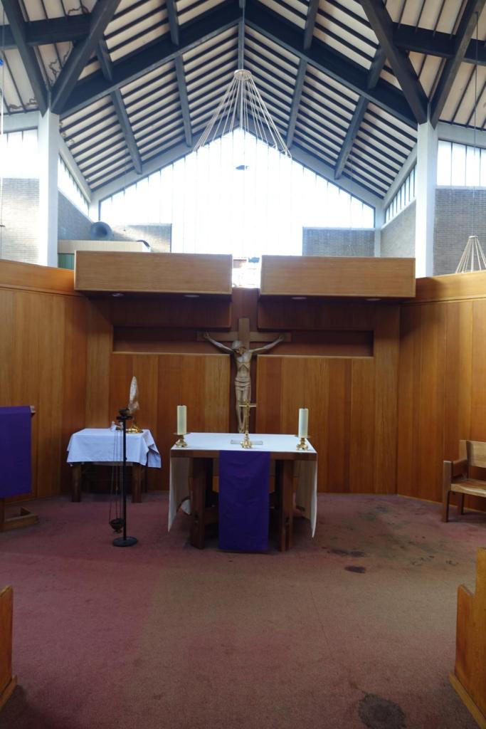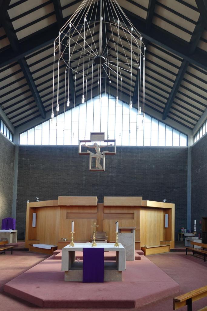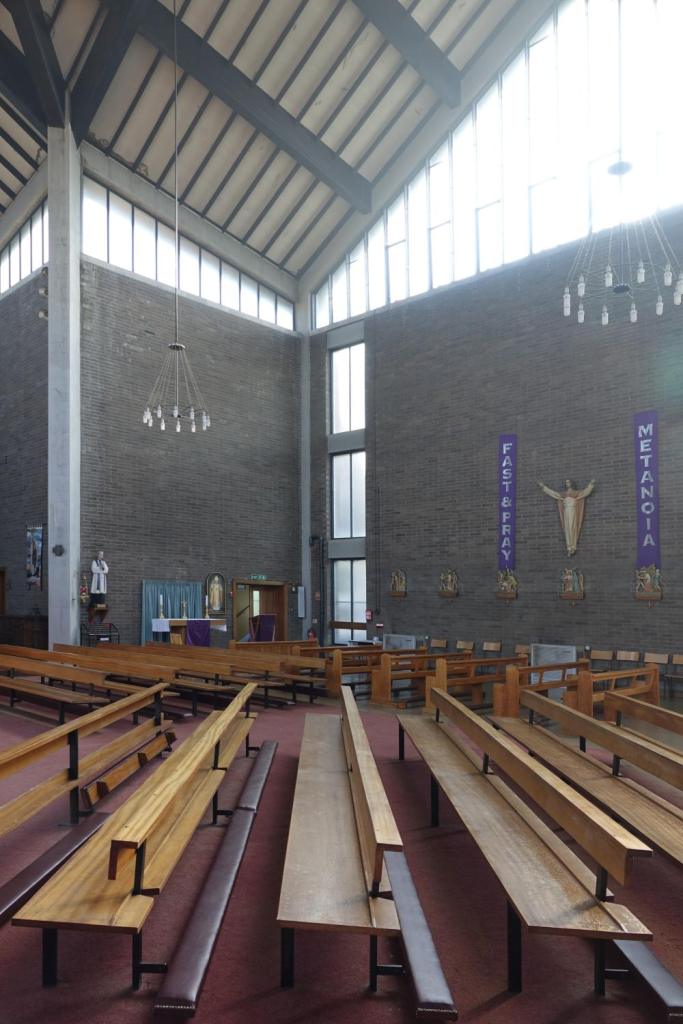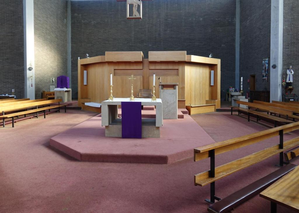 Dating from 1966 by Donald Plaskett Marshall. Following consecration reordering by Austin Winkley in 1983 brought the main altar forward in front of a large wooden screen, the old chancel became a chapel facing an altar on the rear of that screen.