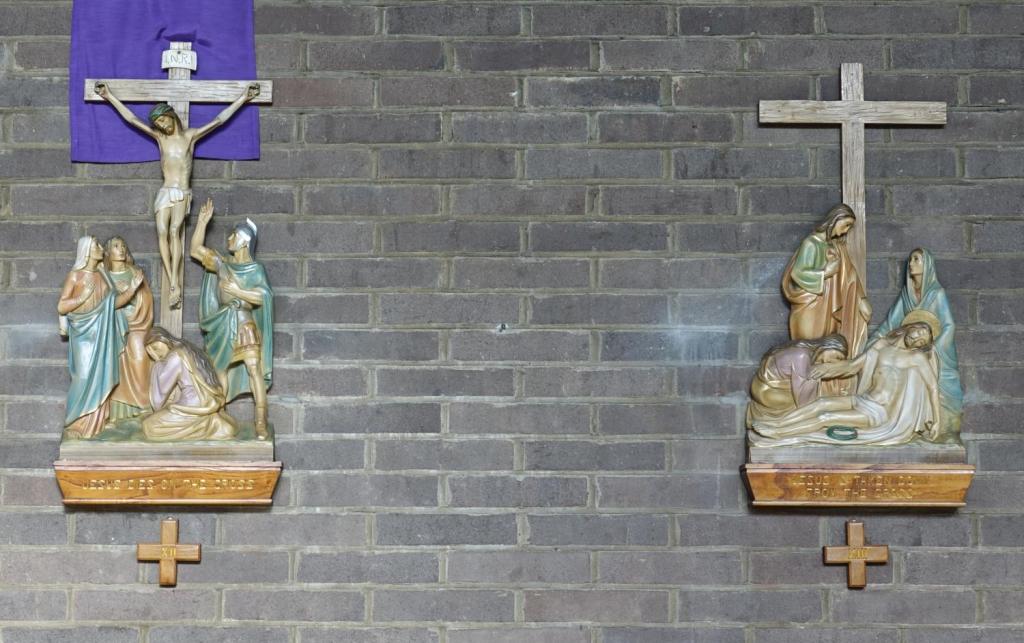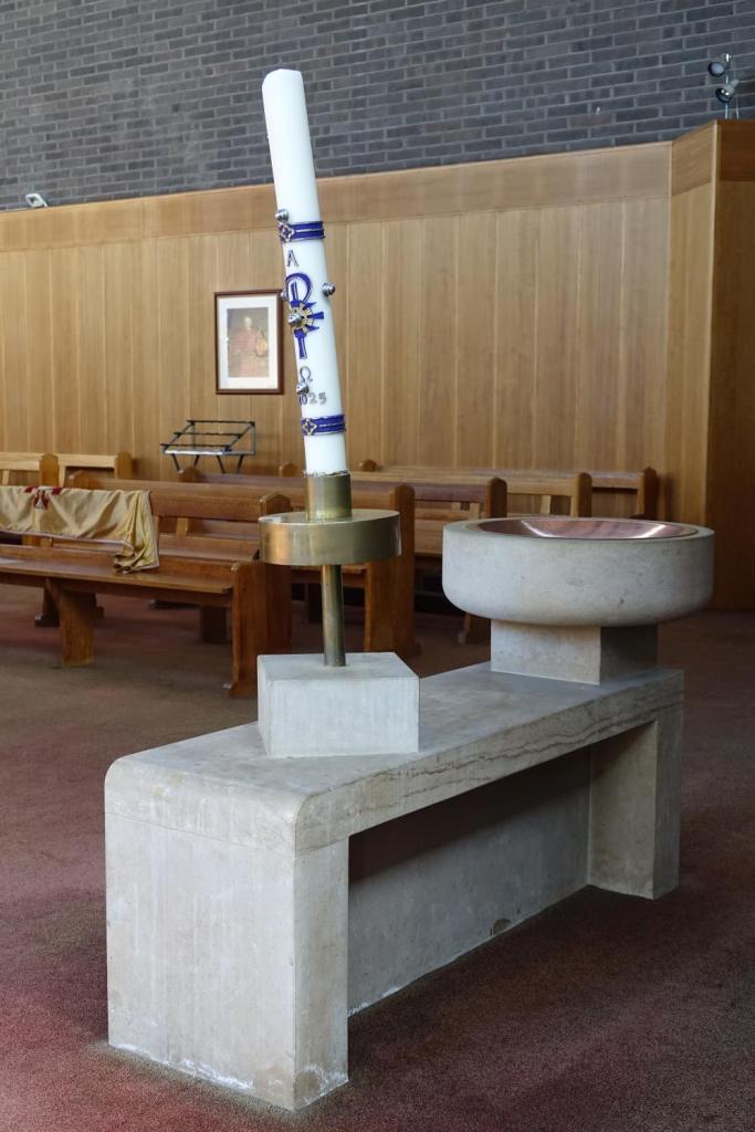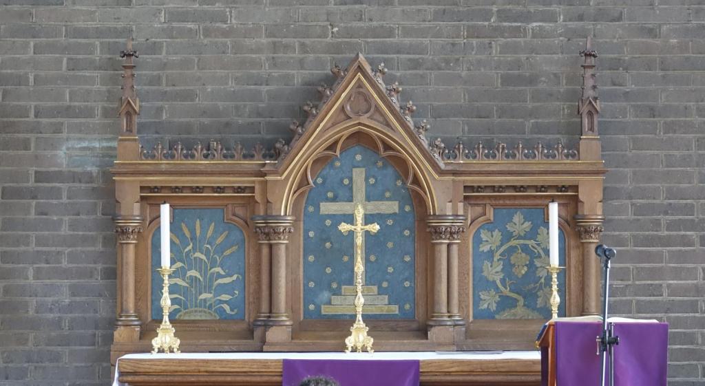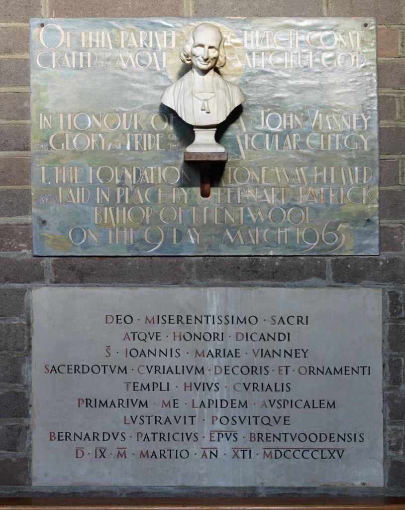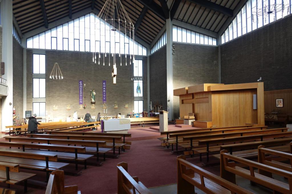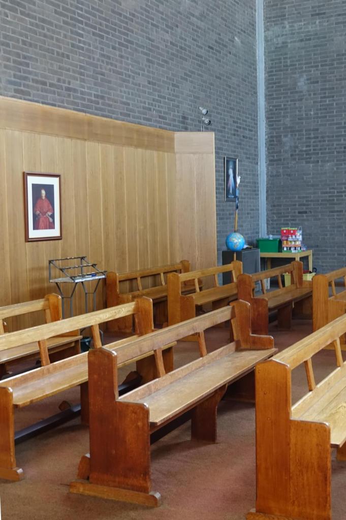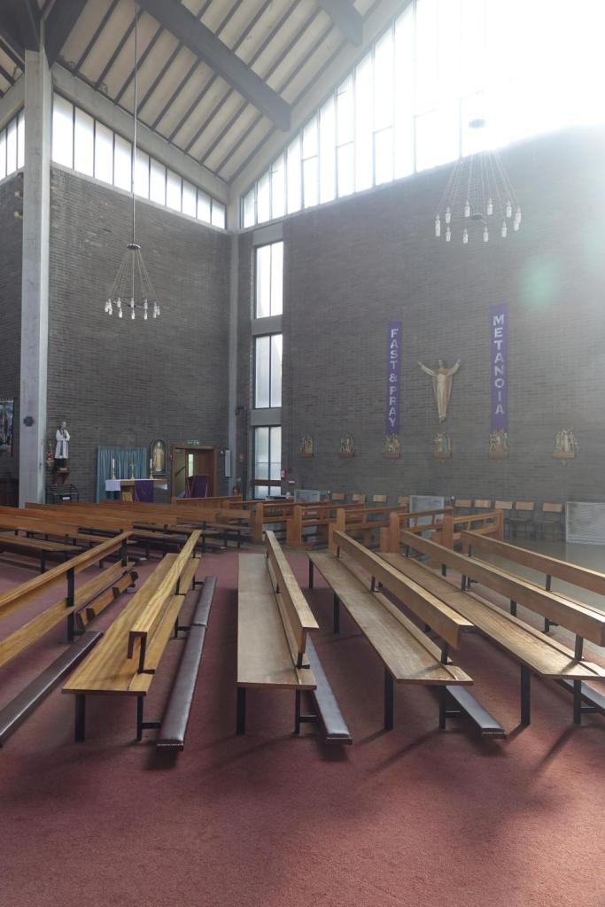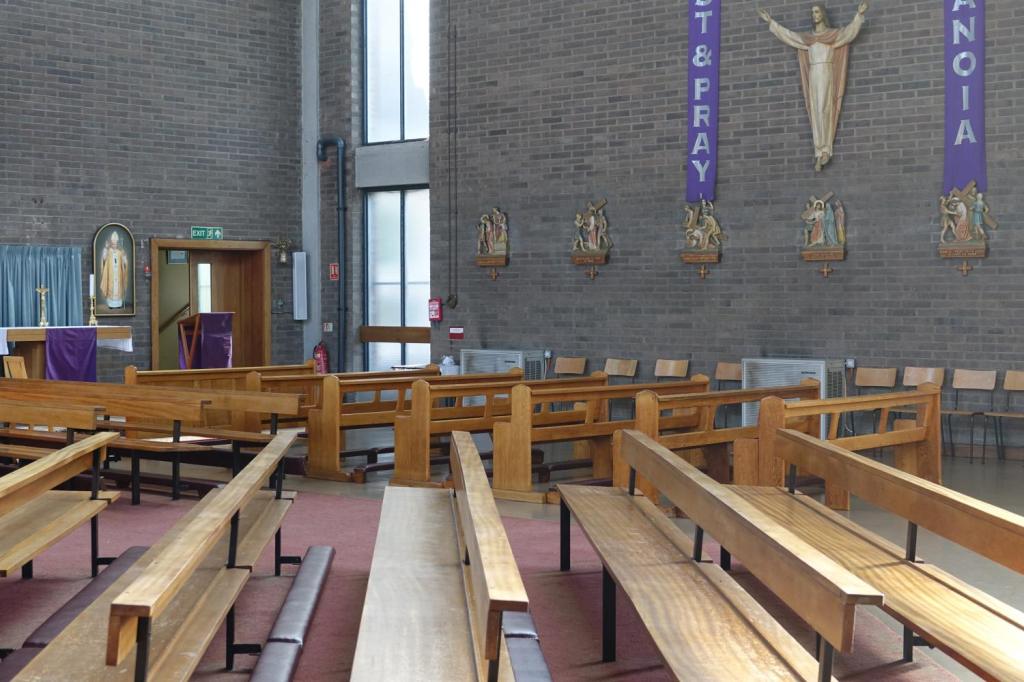 Dating from 1966 by Donald Plaskett Marshall. Following consecration reordering by Austin Winkley in 1983 brought the main altar forward in front of a large wooden screen, the old chancel became a chapel facing an altar on the rear of that screen.