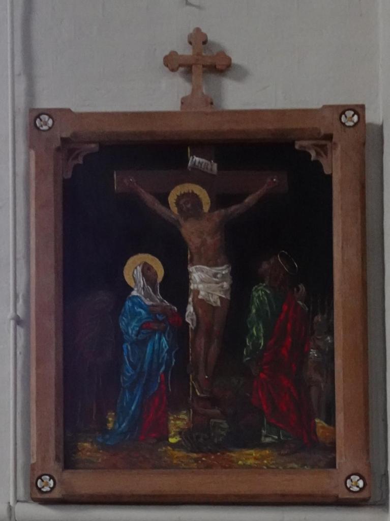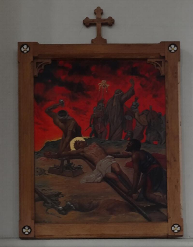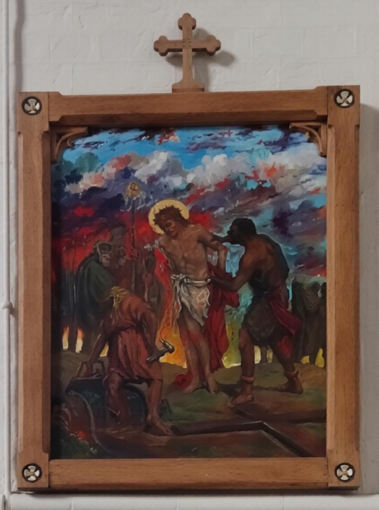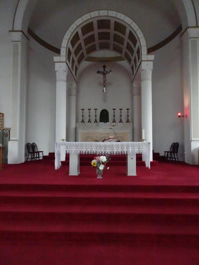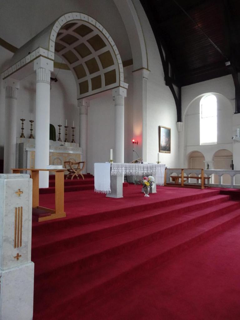 At the eastern end of Rotherhithe near the City Farm. It is a replacement for a war-damaged early 19th-century building. It dates from 1960 and is by Thomas F. Ford. The east end features a mural of the risen Christ by Hans Feibusch. My visit in mid-November coincided with remedial work on some of the concrete pillars so part of the church was screened off, the organ encased and the Lady Chapel used as a furniture store, Views from May2019 show the building in its true state.