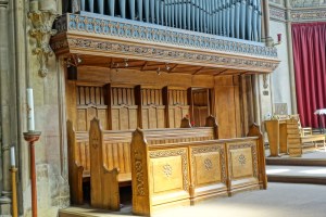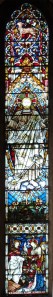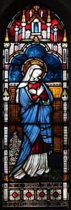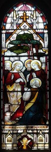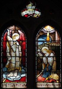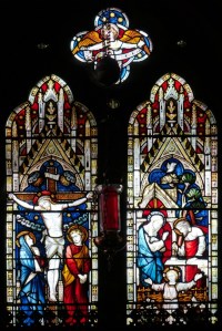 In backstreets south of the town centre, a large red brick church by W.D. Caroe 1902-03. The tin tabernacle from 1900 called Stafford Hall is just down the road past Caroe’s contemporary vicarage. One of the baptistry windows has a rare bell signature for Clayton & Bell. The side altar with figures on its reredos comes from the demolished Cutts church St James.