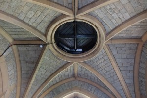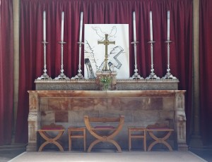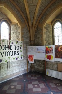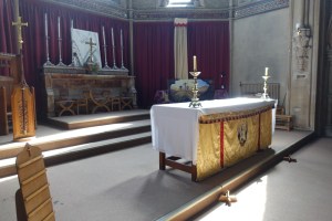 Hidden away in modern low-rise housing. It was designed by Gerard Goalen in 1973 and replaced two 19th-century churches demolished in the early 1970s. The side chapel has stained glass from the former St Augustine, Haggerston. The outside is almost windowless at street level and rather forbidding, but inside there is natural light from above. The floor slopes slightly from the rear down to the chancel. There are some unusual Stations of the Cross, which are awkward to picture well, owing to their reflective picture frames