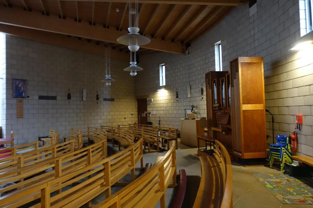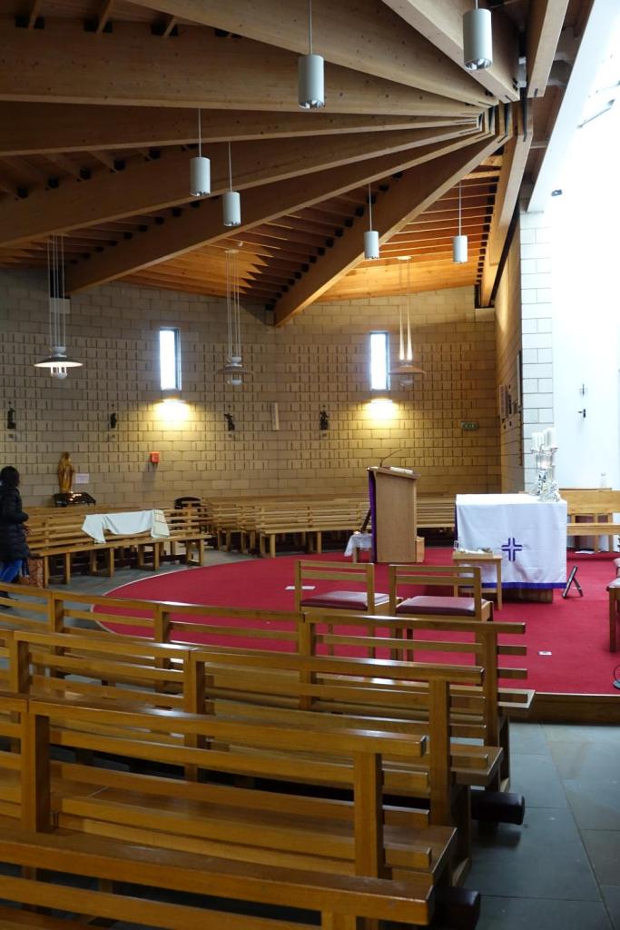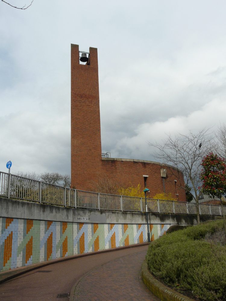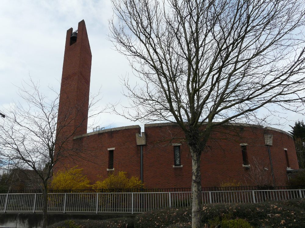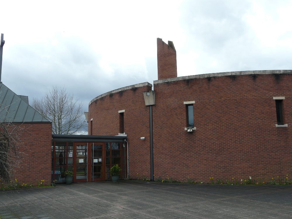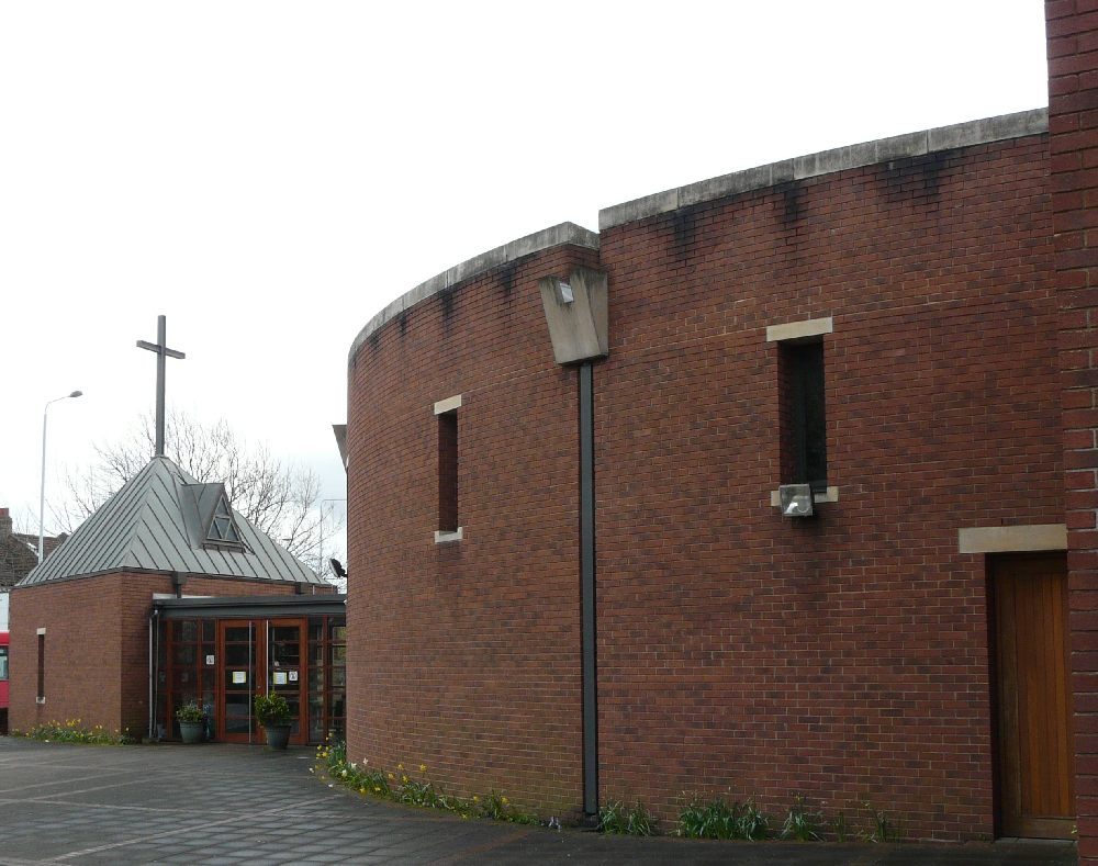 By a fearsome road junction near the old Walthamstow Greyhound Stadium. It was designed in 1996 by Scott Tallon Walker. The main church is semi-circular, with a small chapel on the opposite side of the entrance area.