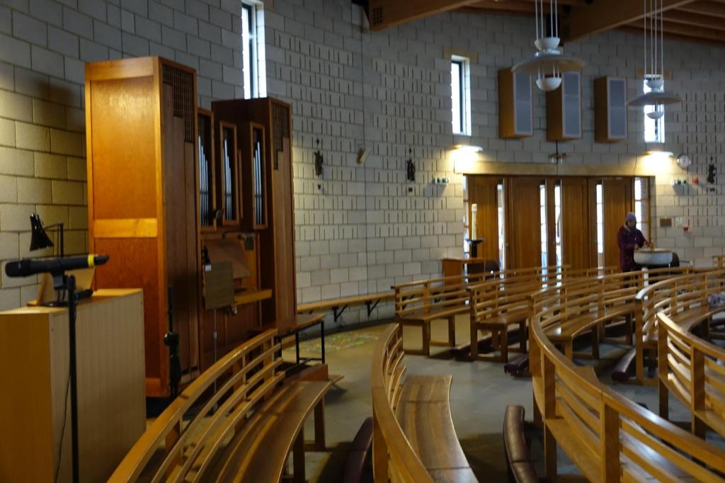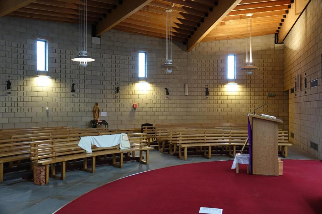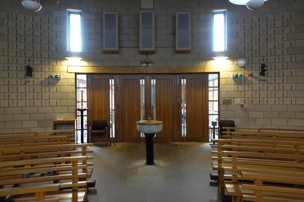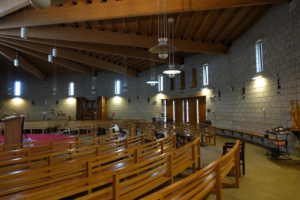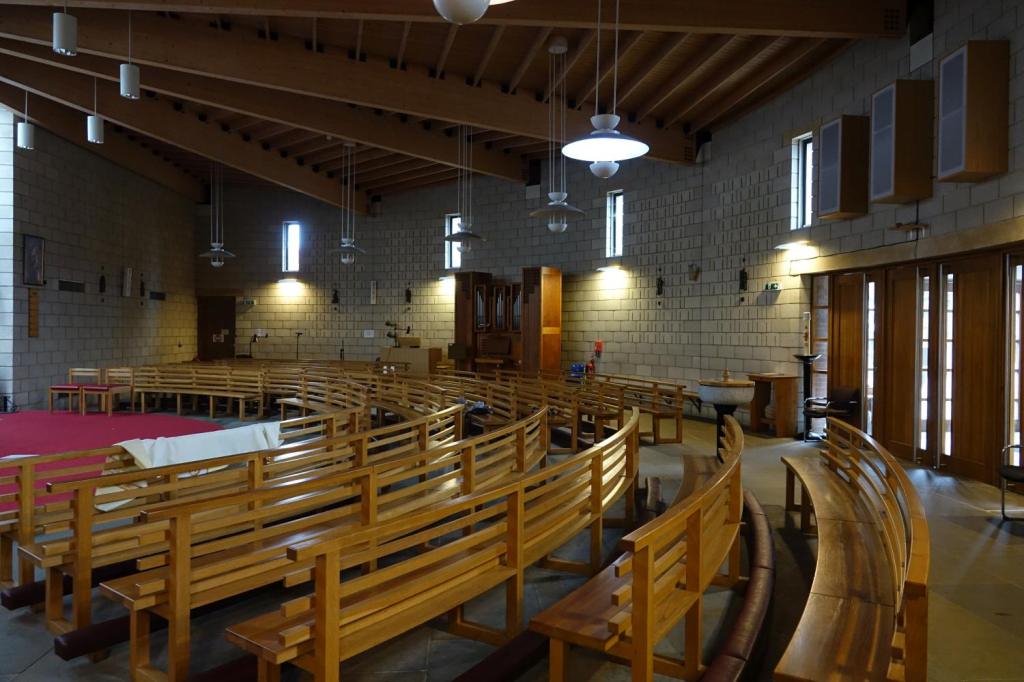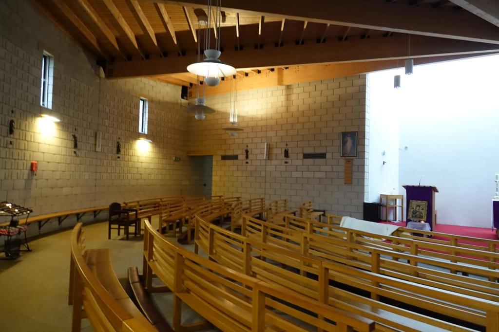 By a fearsome road junction near the old Walthamstow Greyhound Stadium. It was designed in 1996 by Scott Tallon Walker. The main church is semi-circular, with a small chapel on the opposite side of the entrance area.
