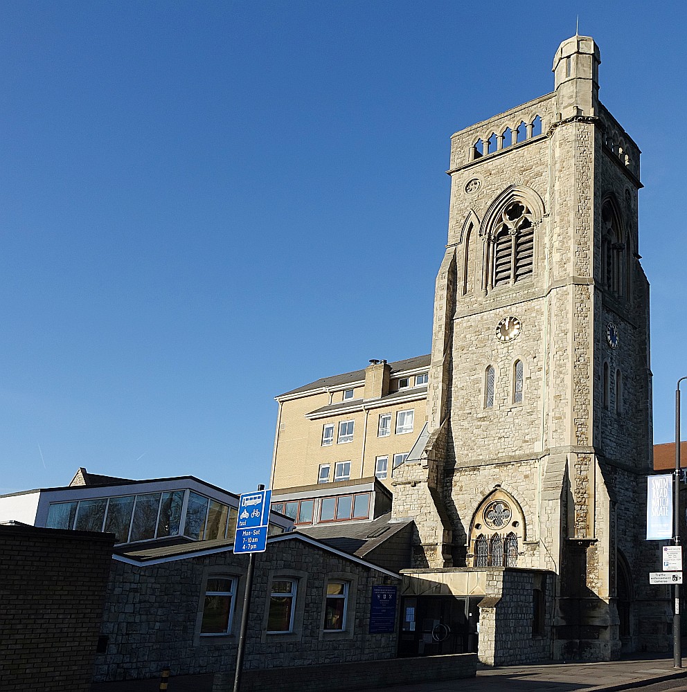 The tower remains from a Benjamin Ferrey church of 1864, but the current worship area replaced the rest in 1989, its architect was Nigel Melluish. The street frontage is an earlier church hall.