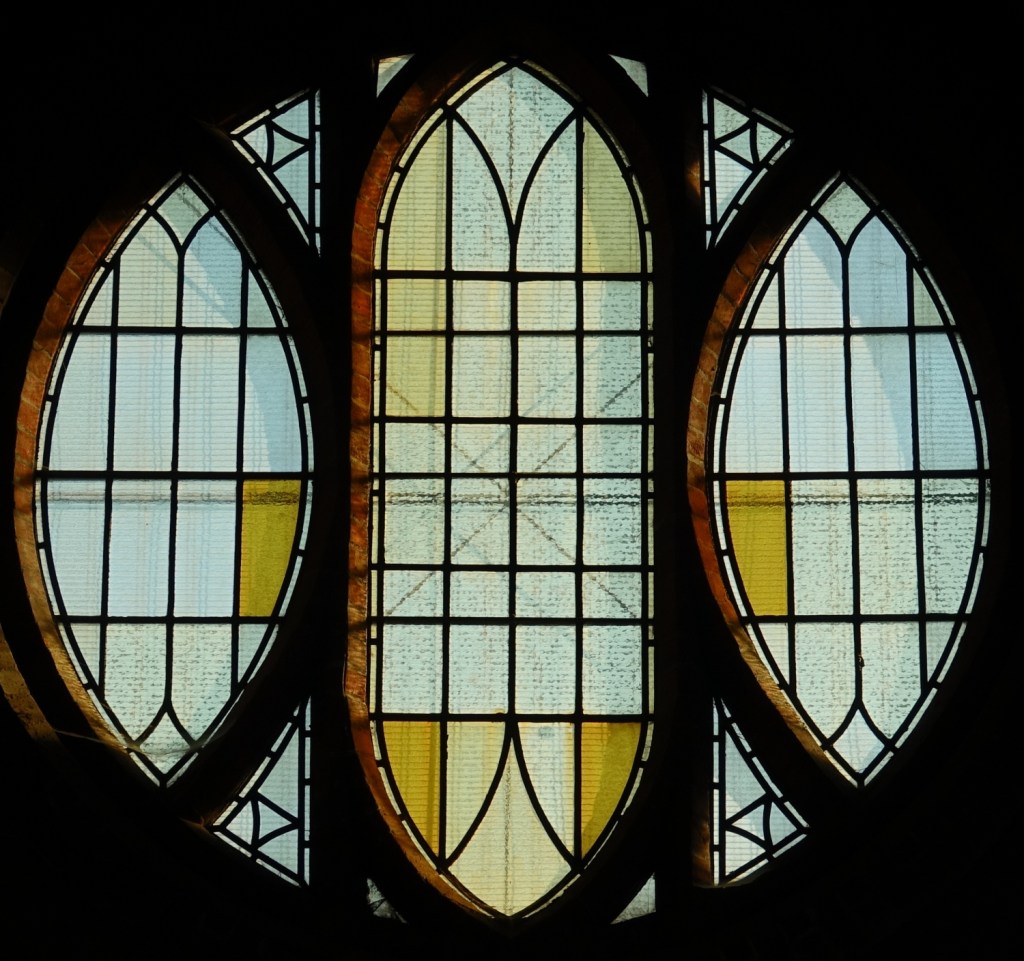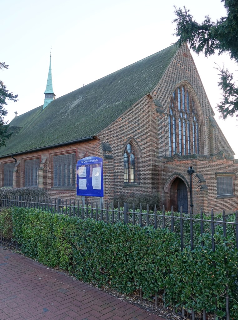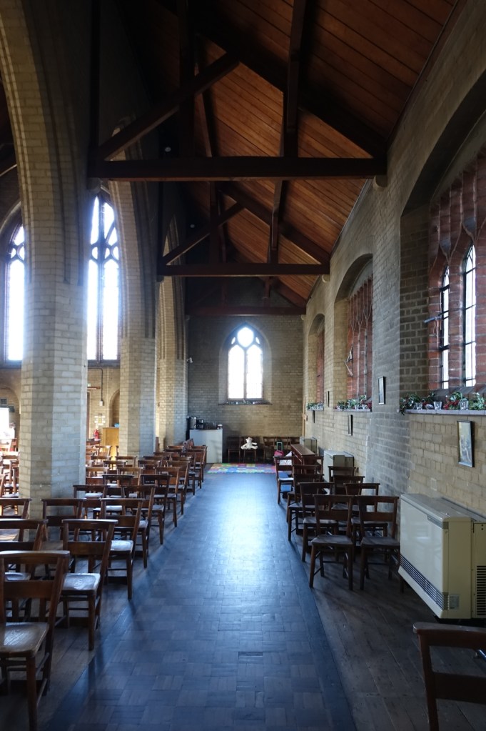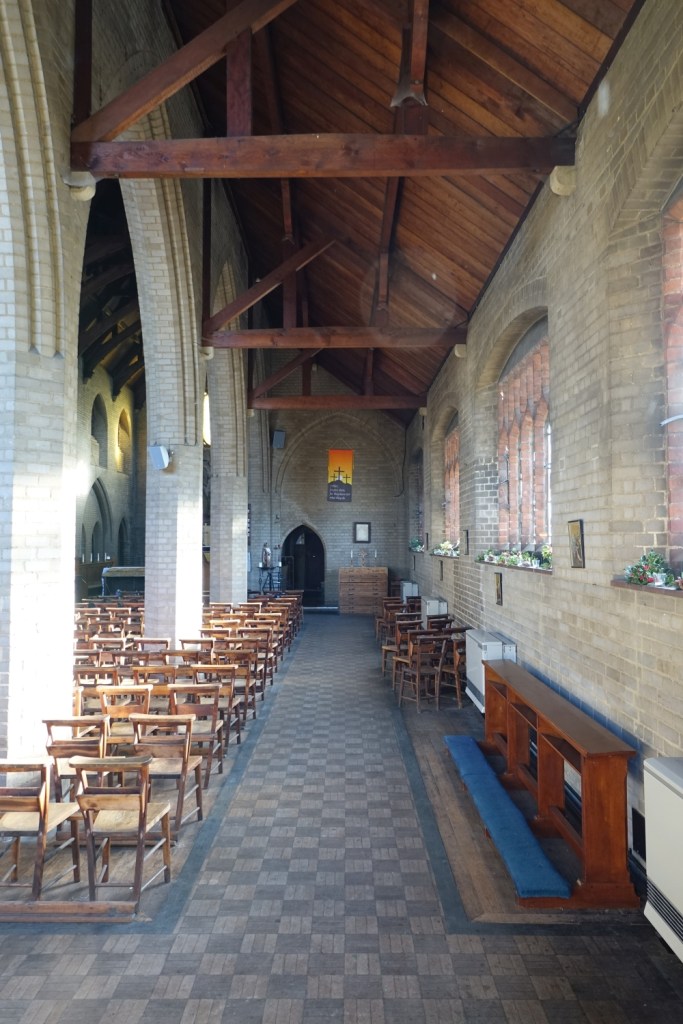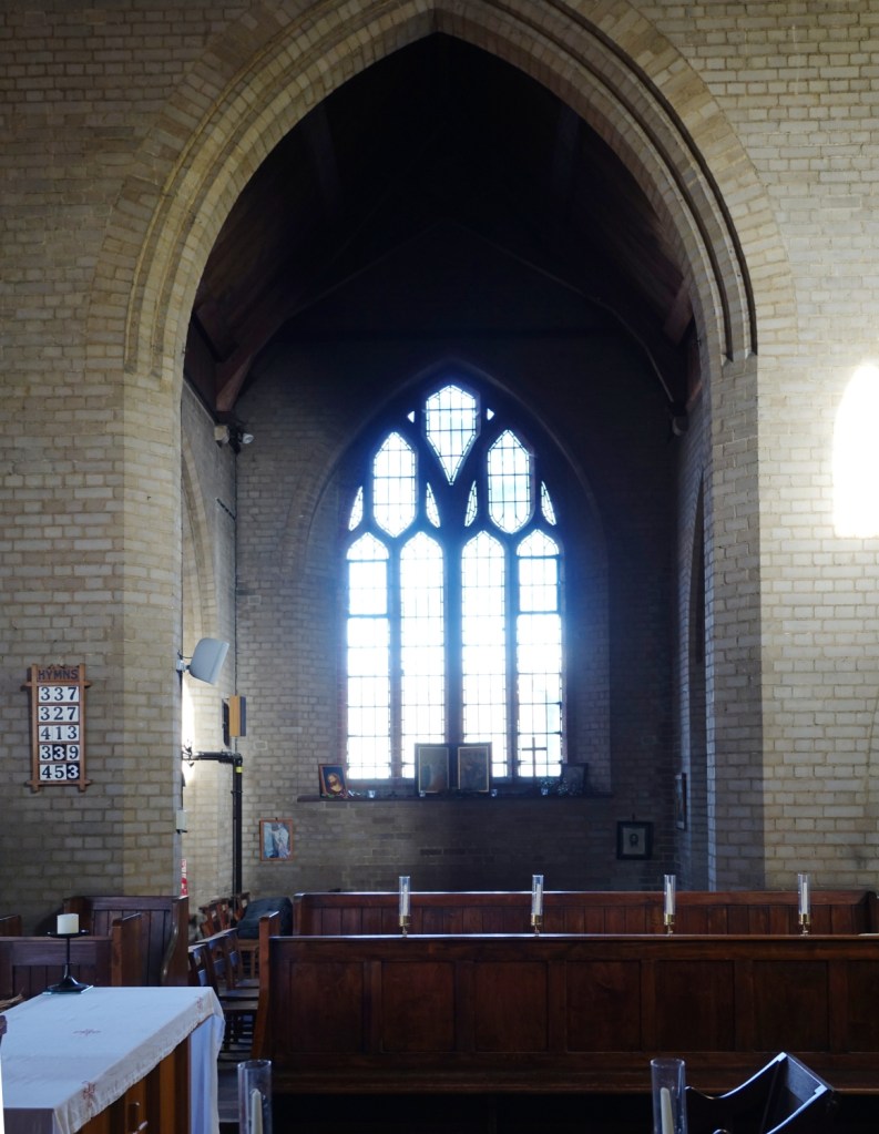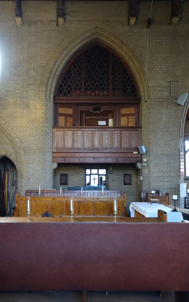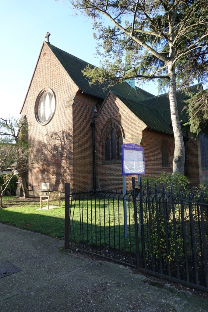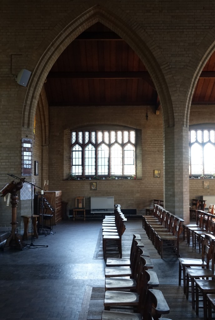 High up above the town centre of Coulsdon this church was built between 1911 and 1914 and designed by F.H. Greenway & J.E. Newberry but was incomplete until 1962 when a permanent west end was added by John Stammers. The screen between the entrance and the church has some large panes of engraved glass which proved difficult to photograph. There is some post-WW2 stained glass by Ninian Comper.