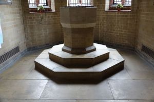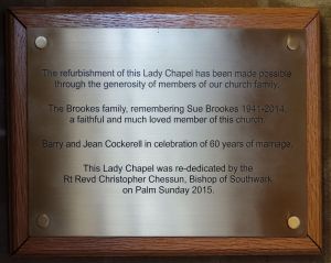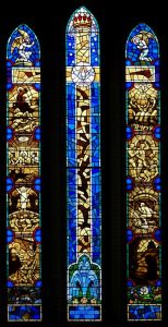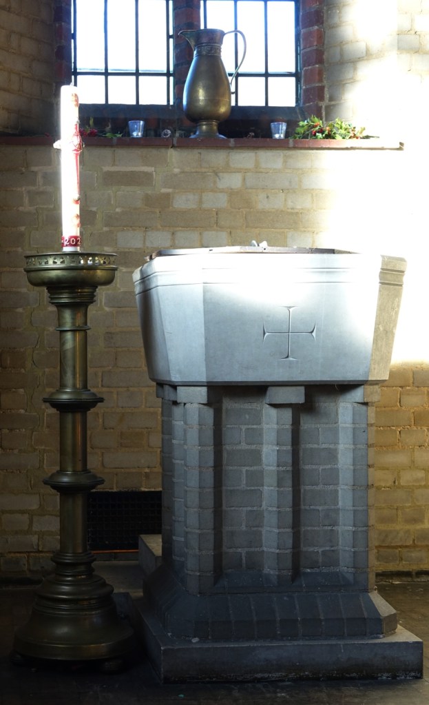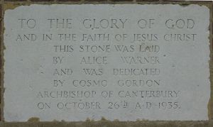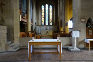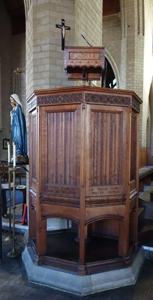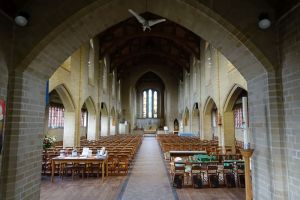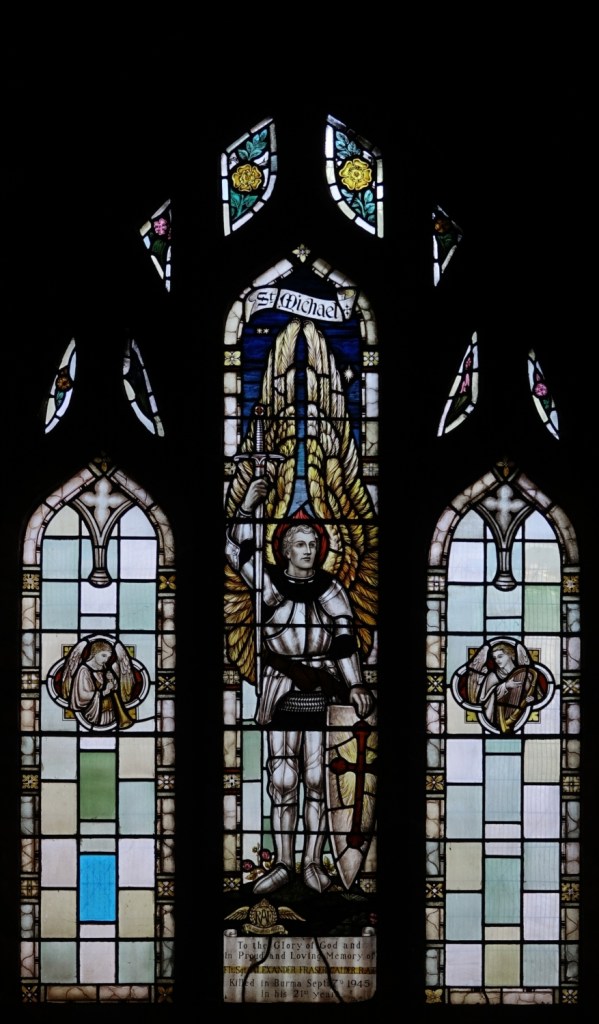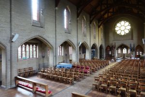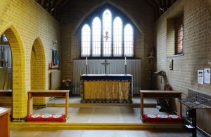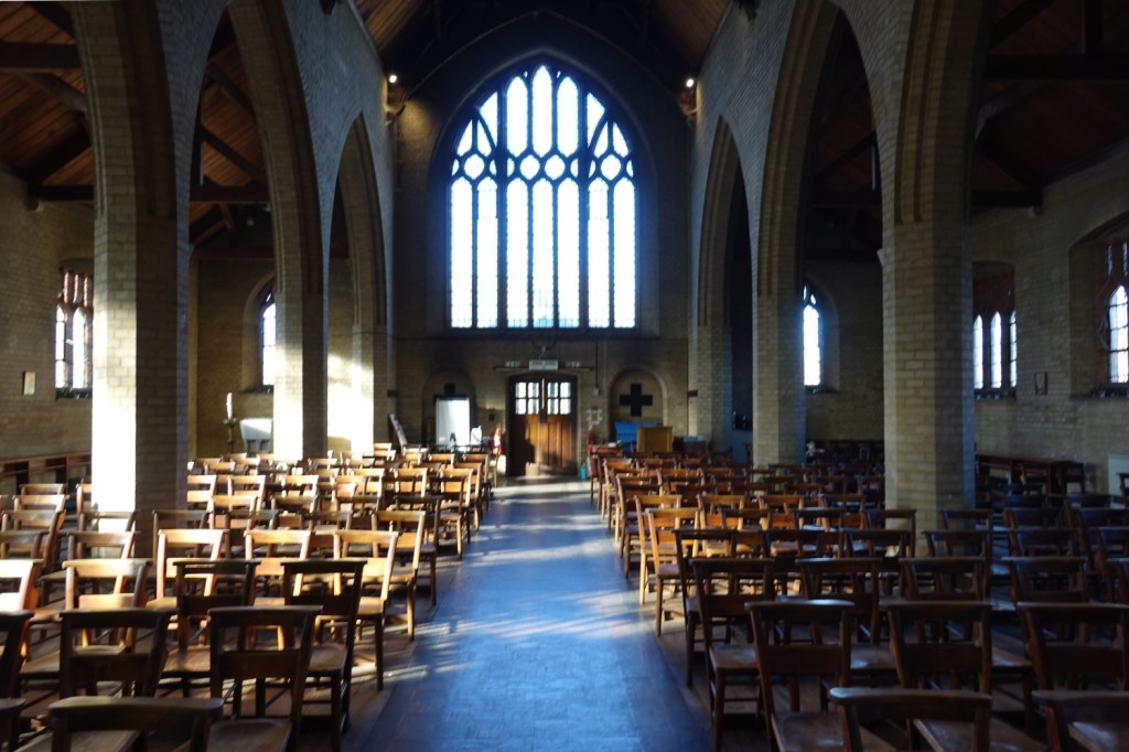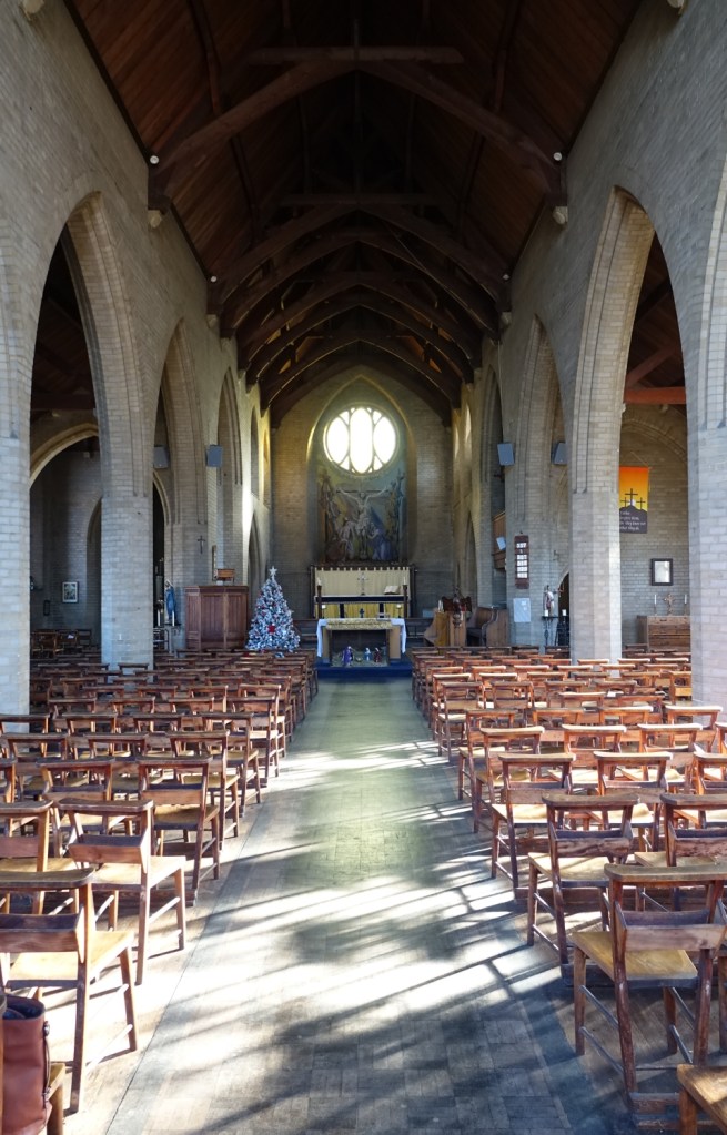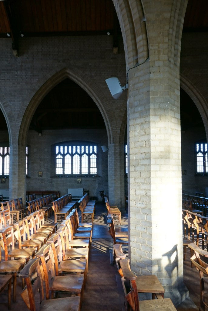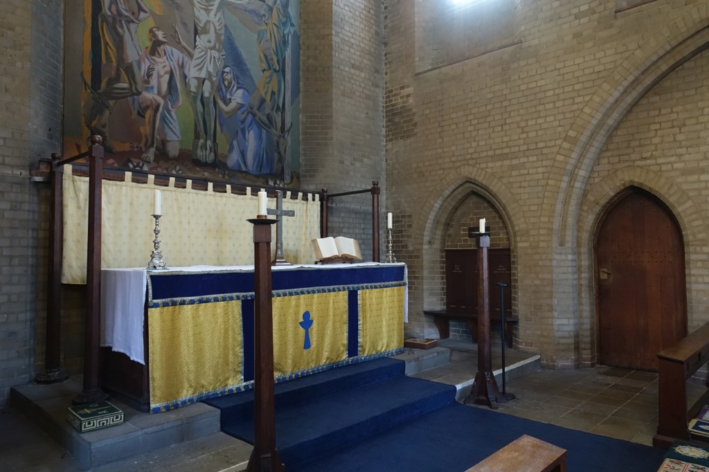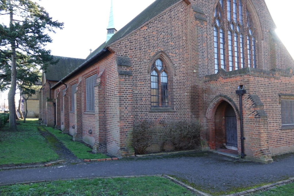 High up above the town centre of Coulsdon this church was built between 1911 and 1914 and designed by F.H. Greenway & J.E. Newberry but was incomplete until 1962 when a permanent west end was added by John Stammers. The screen between the entrance and the church has some large panes of engraved glass which proved difficult to photograph. There is some post-WW2 stained glass by Ninian Comper.