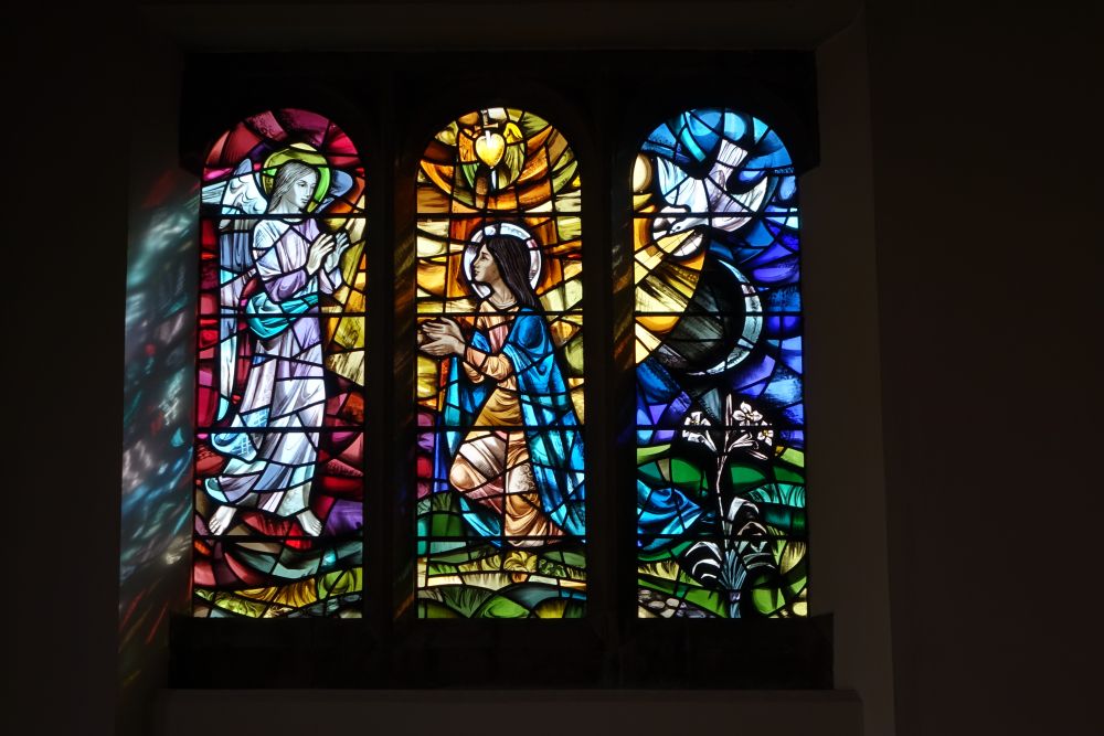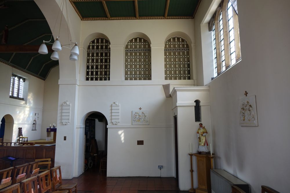 Southend is at the southern end of Catford and this church is on a spacious corner site. In fact, there are two buildings, the older is a former proprietary chapel of 1824 now used as a hall, and the newer the built part of what would have been a huge building by Sir Charles Nicholson dating from 1928. The nave was only partly built and is finished by a permanent “temporary” wall. In 1977 a corona was installed in the centre of the church and the chancel screened off as vestries. However, this change has now been reversed and a high altar restored with a traditional eastward alignment. The north chapel is a memorial chapel to the Forster family who owned the land on which the church is built. This includes a very late recumbent effigy tomb to a son killed at the end of the first world war.