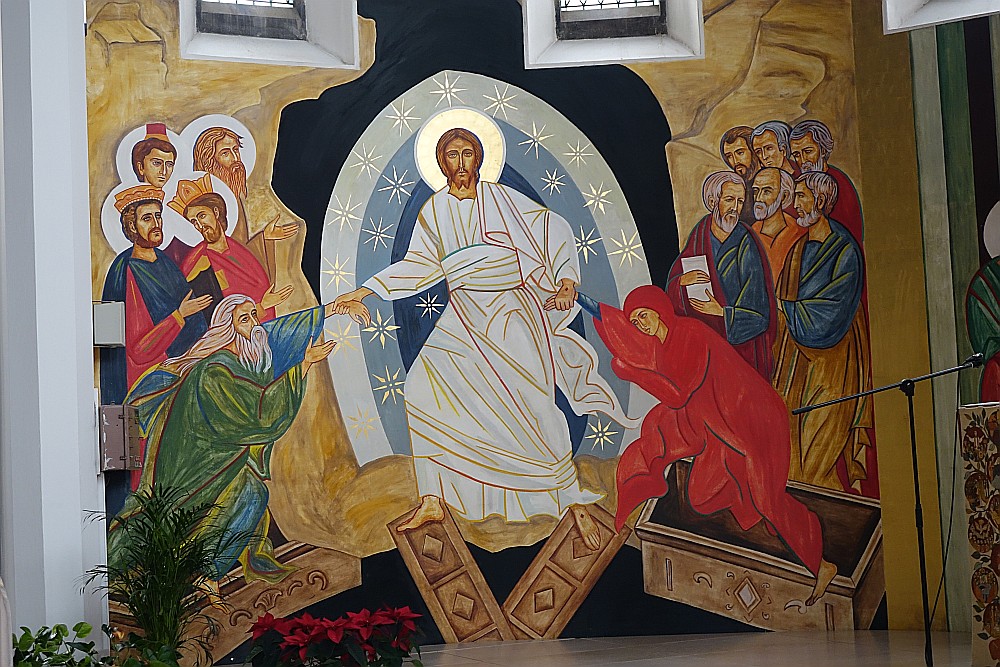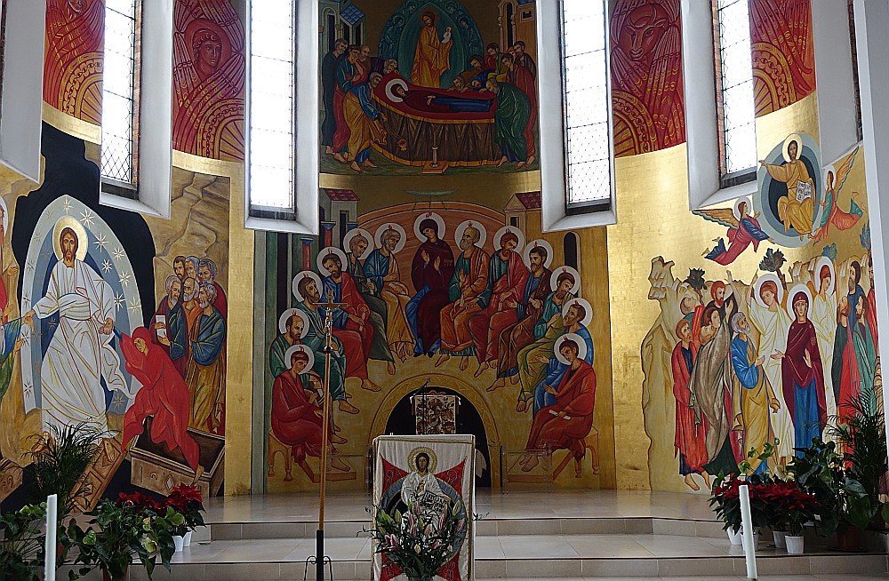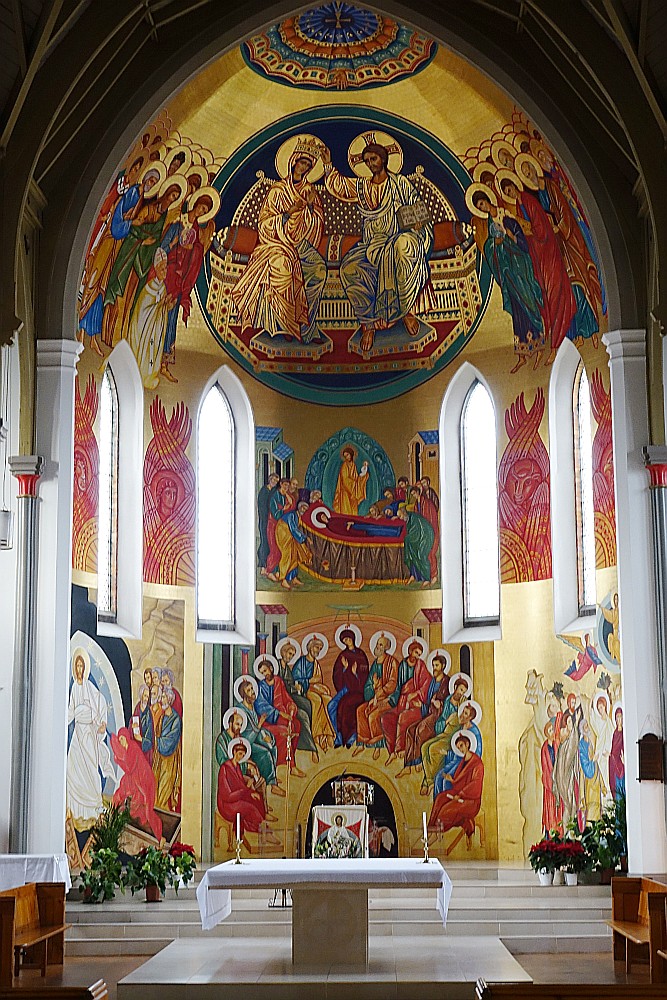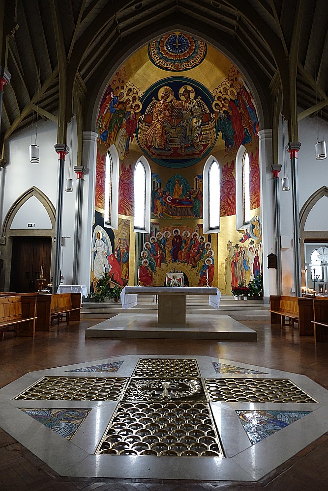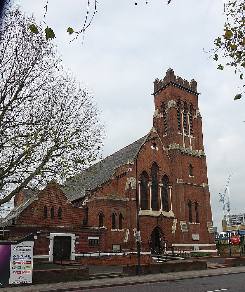 Just north of Brixton town centre. It was built in 1870, designed by Arthur J. Phelps, as Brixton Independent Church. It was damaged in WW2 and reopened as a Catholic church in 1953. The apse paintings date from 2010 by Mauritzia Lees.