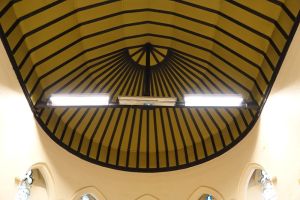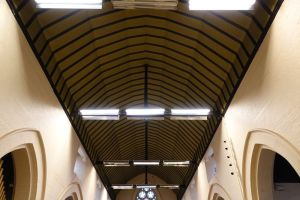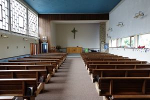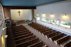 At the peak of a steep hill, this church was designed by George Lowe and Partners in 1959, it replaced a church of 1932 which still exists as a hall (and church in cold weather) hidden behind this church. The last few pictures show the interior of this building which had replaced another small early 20th century building. The lady chapel has a painting by John Hayward.