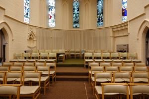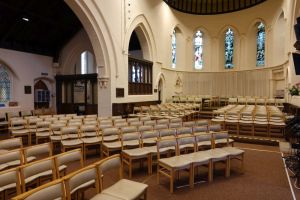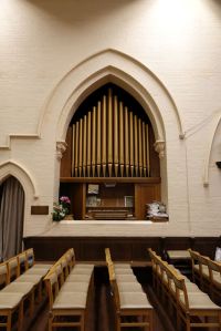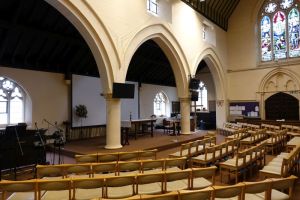 The original Purley parish church on the main road in the valley. It is by James Fowler and dates from 1877-78. In recent years a large extension of halls, offices and other rooms has been attached with the church now entered through a bay in its north aisle wall. Inside the orientation has been moved to be southwards with the chancel seated as an extension of the main worship area.