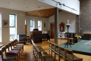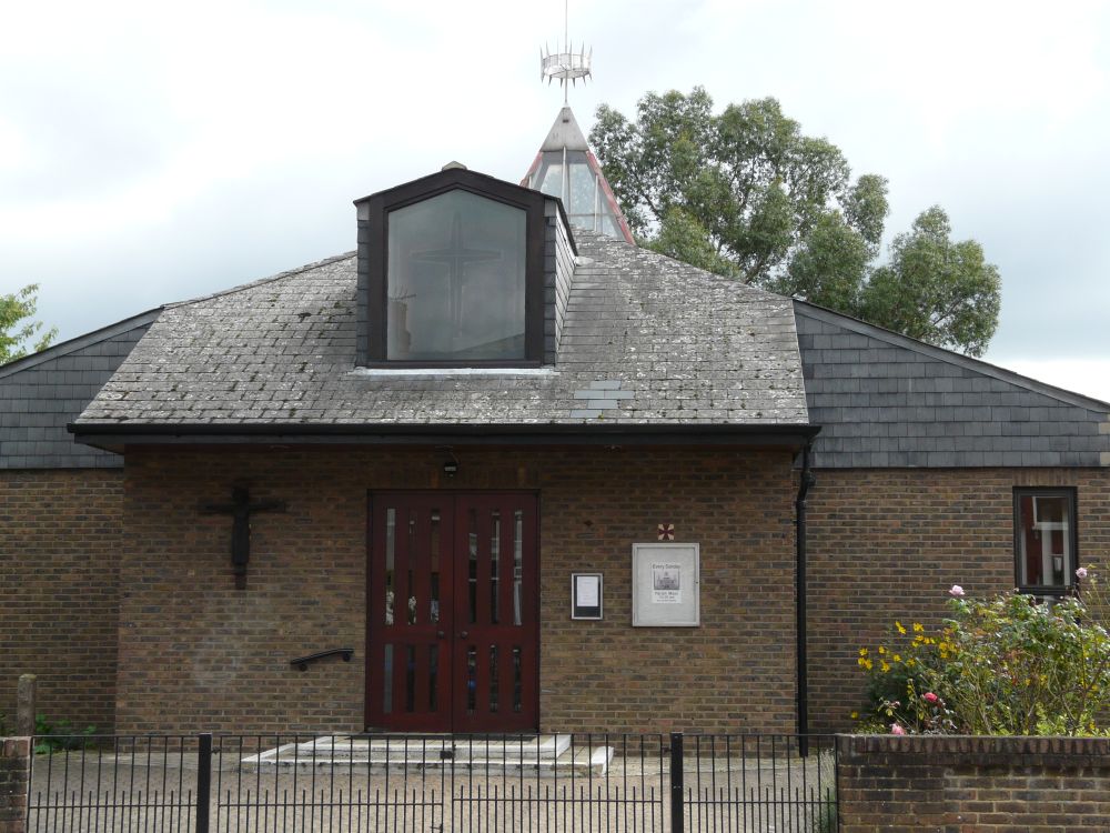 In a suburban street, a small church built in 1982 by Riley and Glanfield. Church website