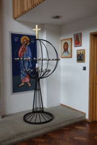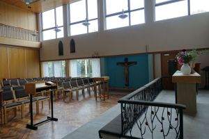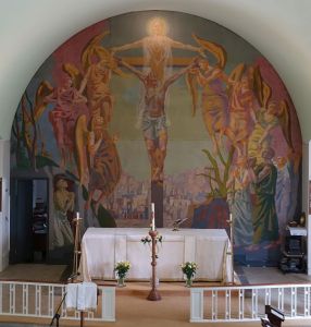 At the eastern end of Rotherhithe near the City Farm. It is a replacement for a war-damaged early 19th-century building. It dates from 1960 and is by Thomas F. Ford. The east end features a mural of the risen Christ by Hans Feibusch. My visit in mid-November coincided with remedial work on some of the concrete pillars so part of the church was screened off, the organ encased and the Lady Chapel used as a furniture store, Views from May2019 show the building in its true state.