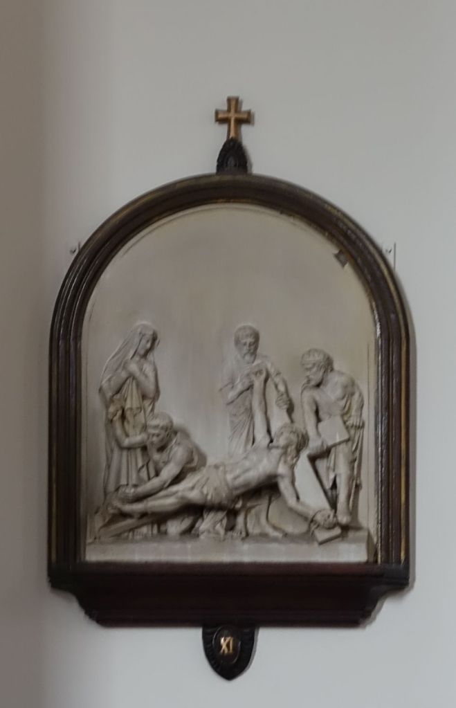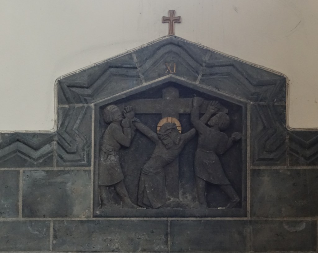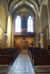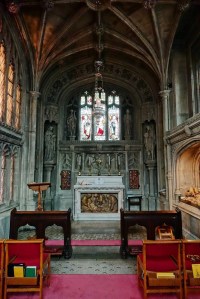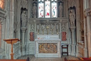 One of William Butterfield’s major works from 1856-62, it was badly war damaged and rebuilt in a simplified design, apart from the tower and west end, by Adrian Scott 1959-61. The Clergy House remains from Butterfield’s building. The huge mural and Stations of the Cross were painted by Hans Feibusch. The Mackonochie chapel at the west end was added by C.H.M. Mileham in 1890