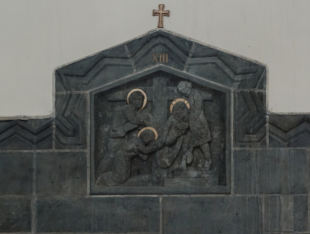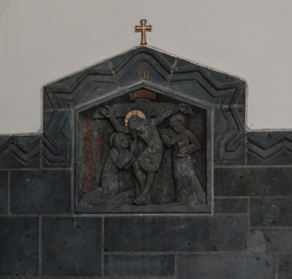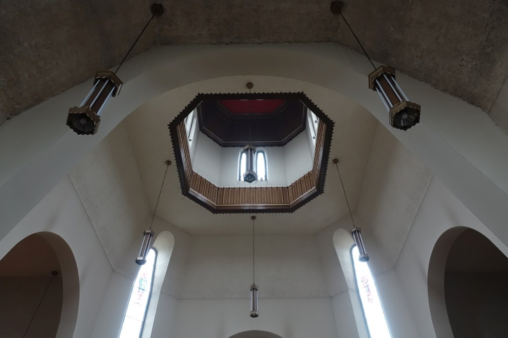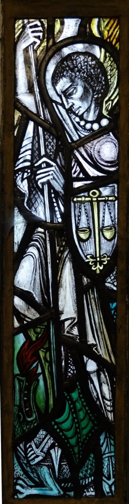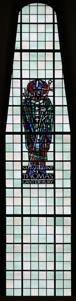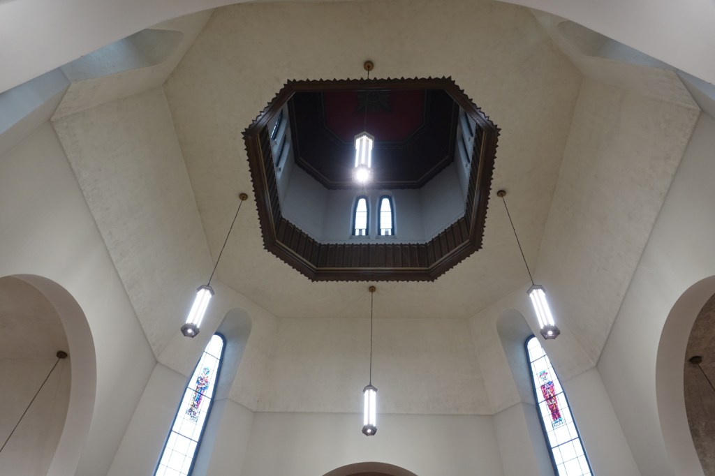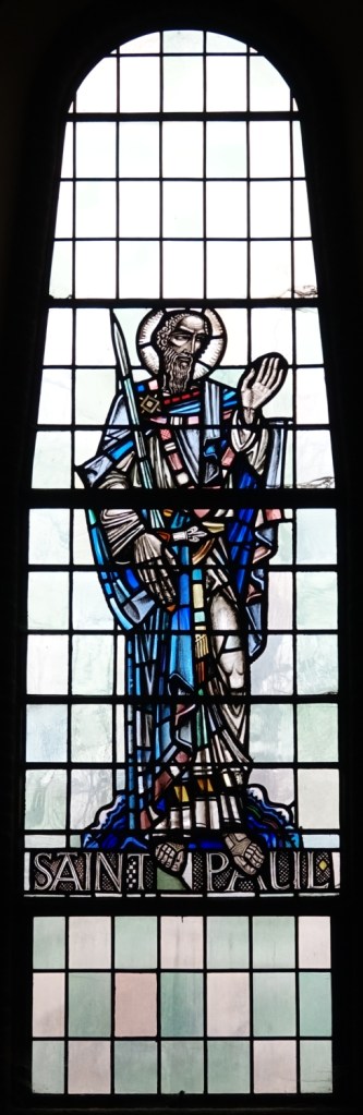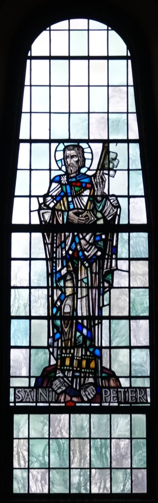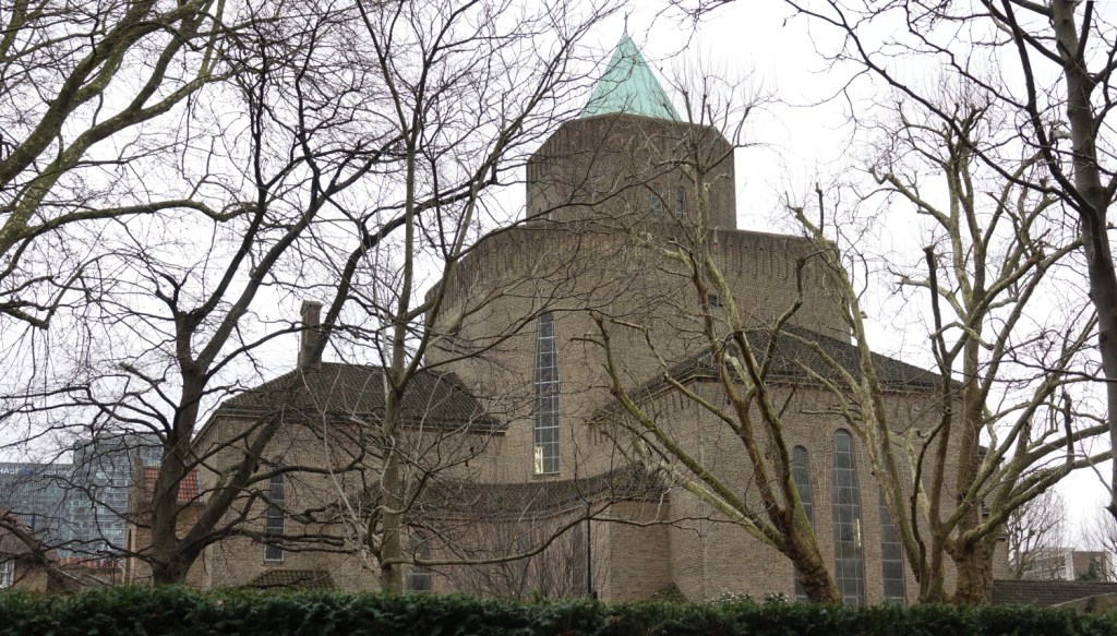 Built to replace a war damaged church. It is a bulky massive church of 1954 by Adrian Gilbert Scott. Inside there is a big central lantern and a built-in pulpit. The glass is by William Wilson and mainly from 1960.