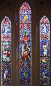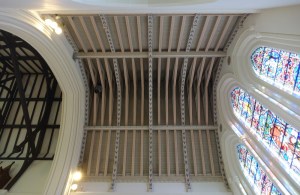 Replacing the old church, a large building of 1868-72 by George Gilbert Scott, the tower and spire added 1872-79. The church was bombed in WW2 and received a new ceiling by Romilly Craze in 1955, much of the glass by Clayton & Bell survived although the backgrounds in the aisles and clerestory have been removed.