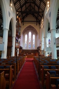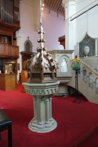 A large church by George Gilbert Scott of 1849-51, but reconstructed in much smaller form, following a fire in 1982-84 by Donald Buttress. The main remains are the tower and chancel and part of the nave. Access is restricted outside services to the tower and some extensions on the side of the church which house an altarpiece and some of the Stations of the Cross.