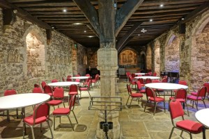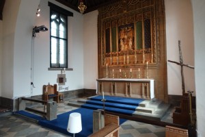 A 13th century chapel restored in 1874-79 by J Young and 1935 by Giles Gilbert Scott. Prior to its purchase by a Roman catholic Order in 1873 it had been used as a Welsh chapel. The crypt was repaired in 1968-70 by Charles Blakeman. The east window is by Joseph Nuttgens, 1952, the rest by Charles Blakeman 1952-58 (side windows) and 1964 (west window).