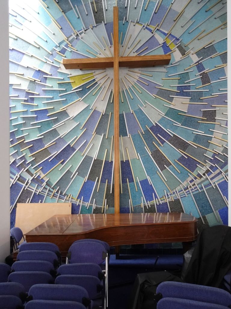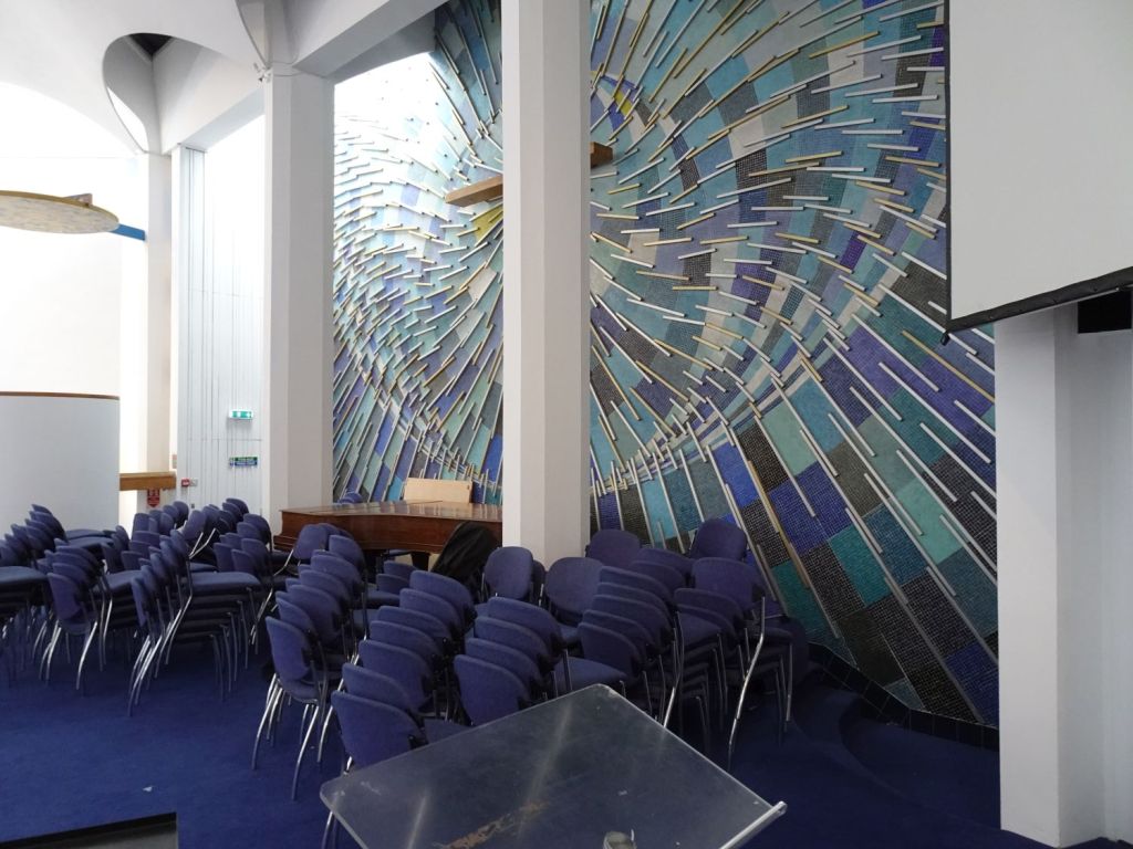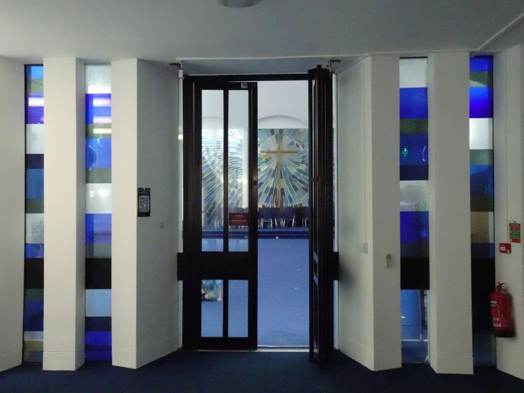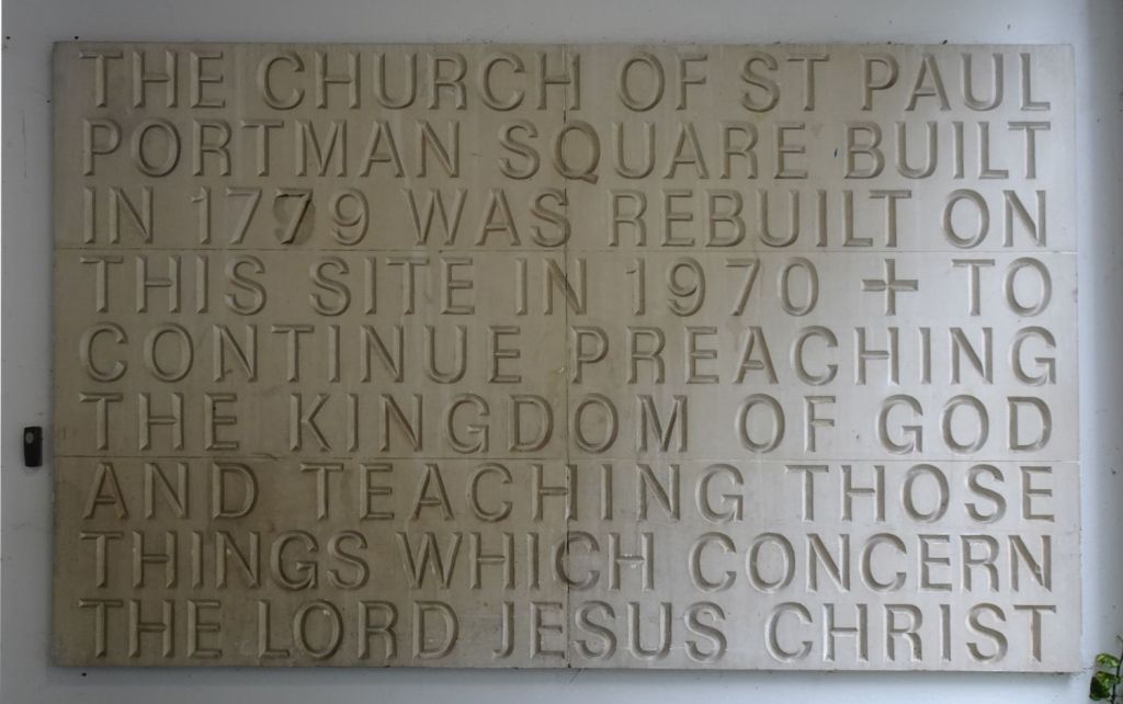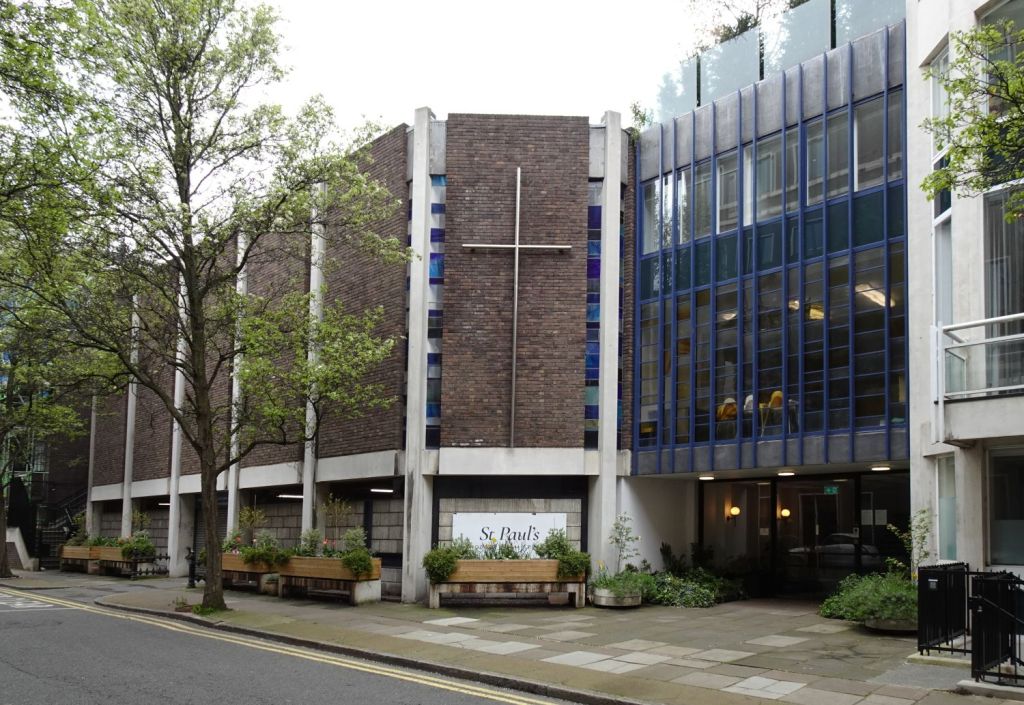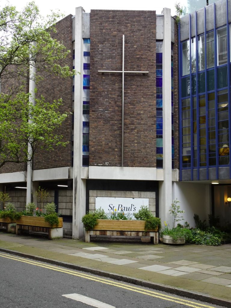 Built in 1970 by Green Lloyd & Adams to replace St Paul, Portman Square. The church area and its hall and foyer are at first floor level. It has not been used actively as a church for some time. Its current use is as a hall for All Souls Langham Place. The three exteriors at the bottom show it in April 2016, the top set date from April 2026.