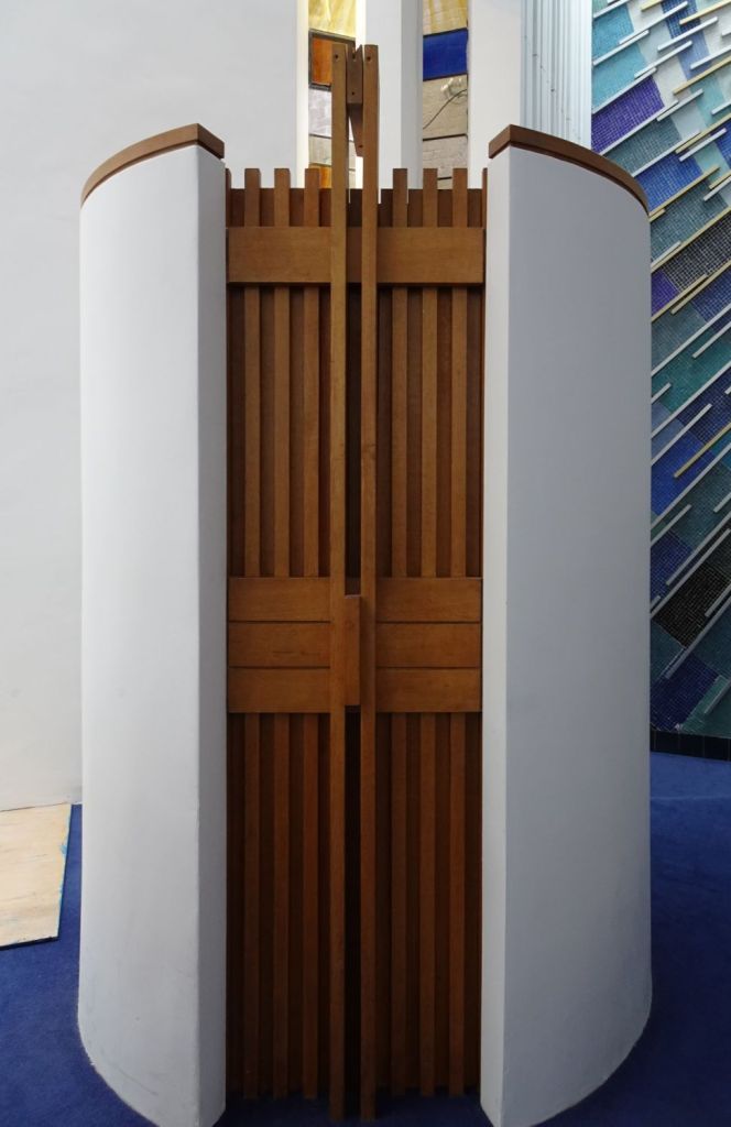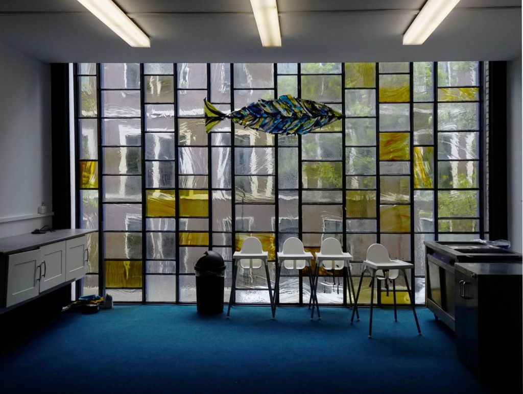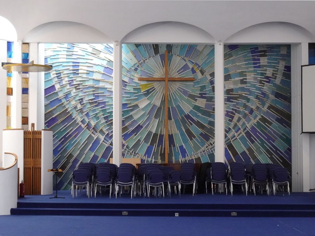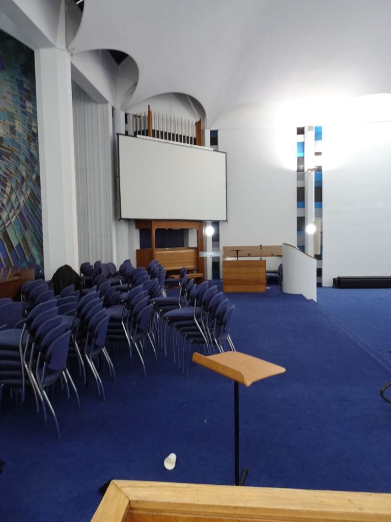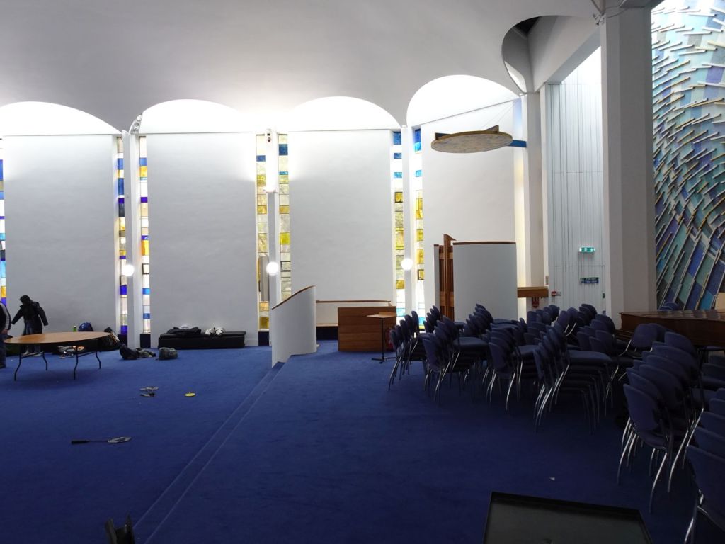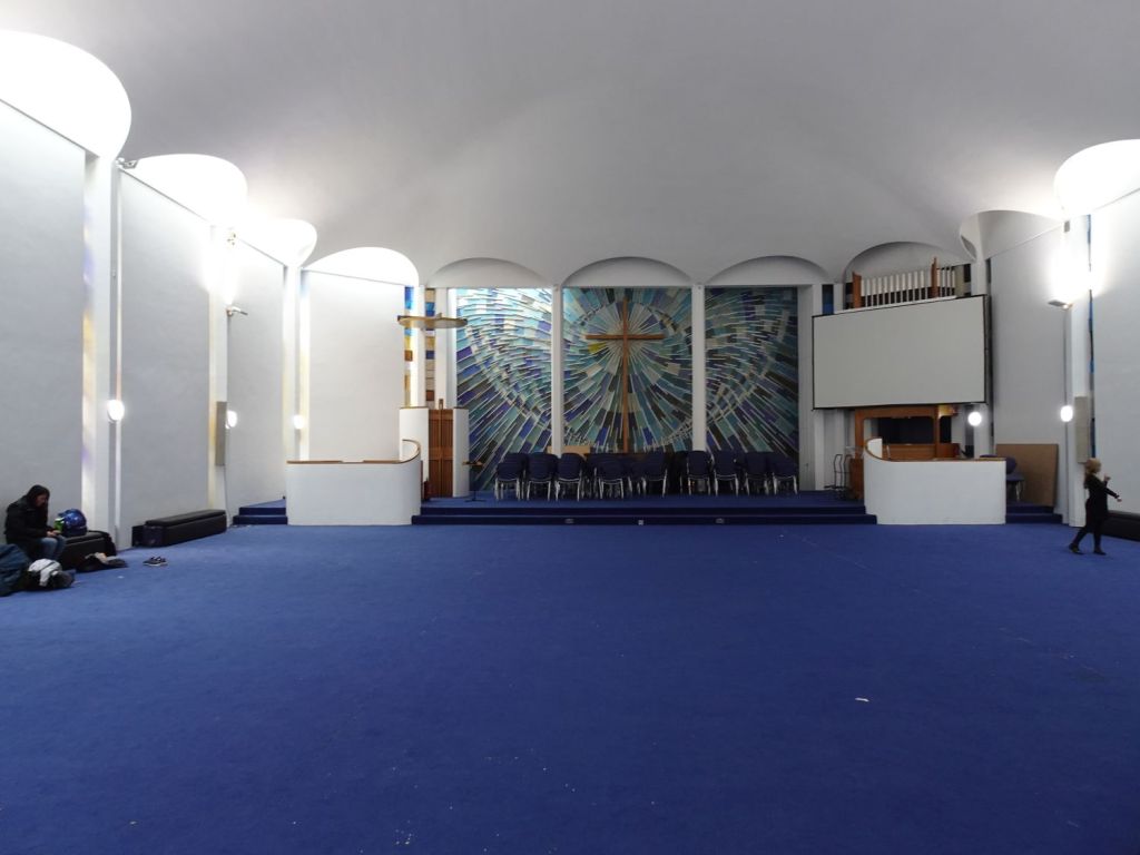Built in 1970 by Green Lloyd & Adams to replace St Paul, Portman Square. The church area and its hall and foyer are at first floor level. It has not been used actively as a church for some time. Its current use is as a hall for All Souls Langham Place. The three exteriors at the bottom show it in April 2016, the top set date from April 2026.
