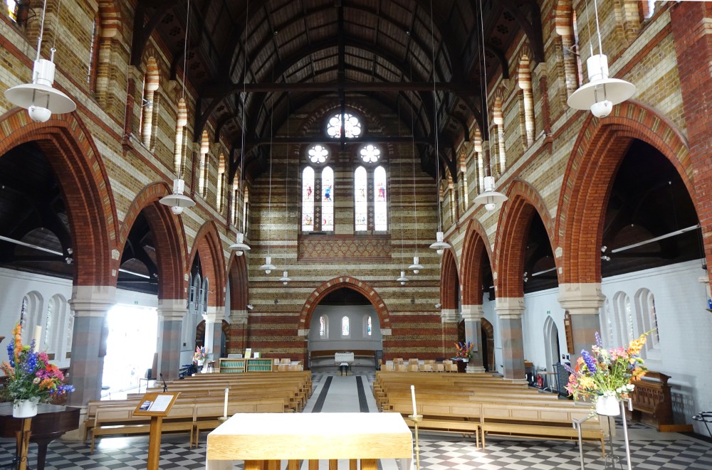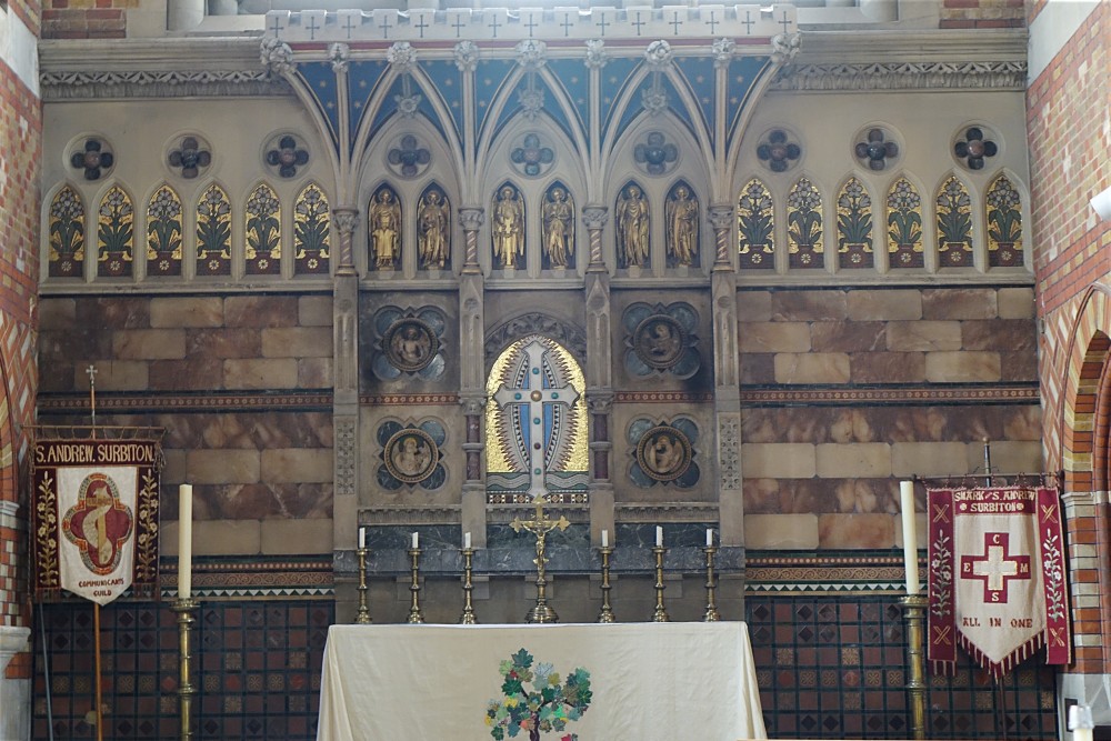 A landmark on the approach from the South to Surbiton. It is a design by C.L. Luck from 1874-75. The aisles were partitioned off in 1976. The east windows are by Hugh Easton, the former baptistry by Louis Davis and the south transept by W. Carter Shapland.