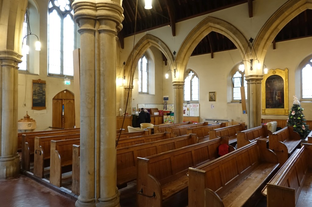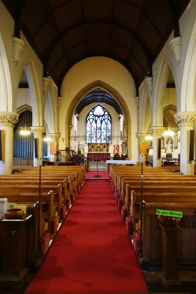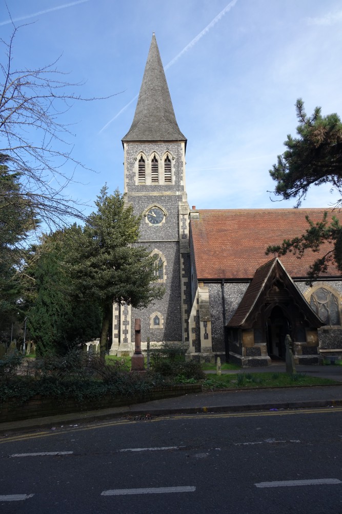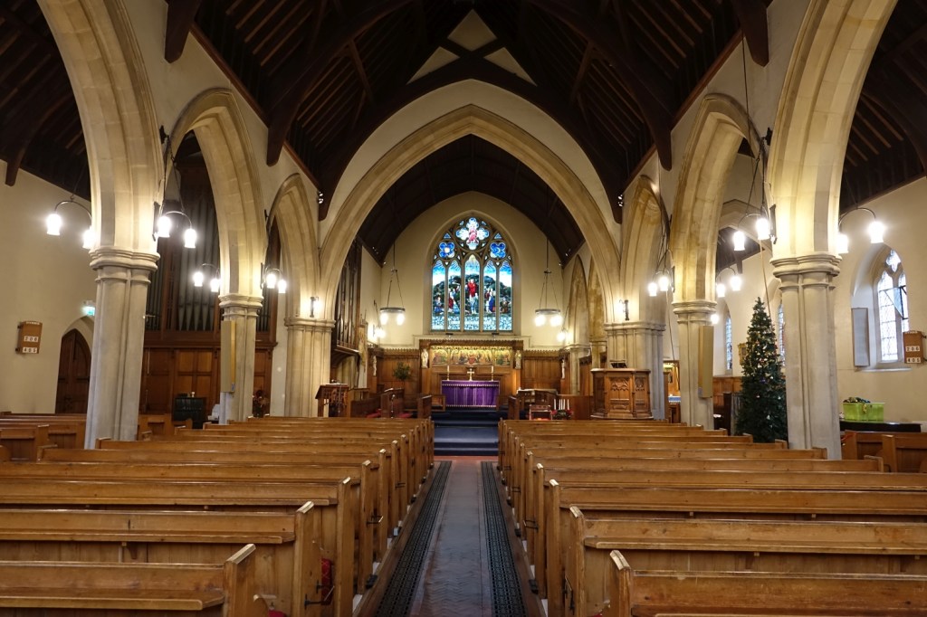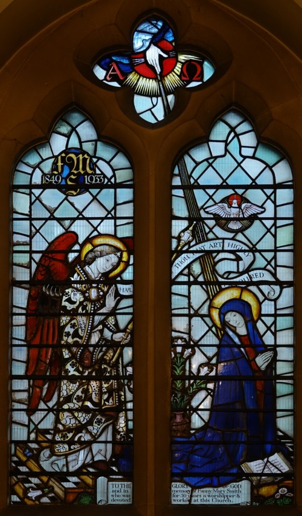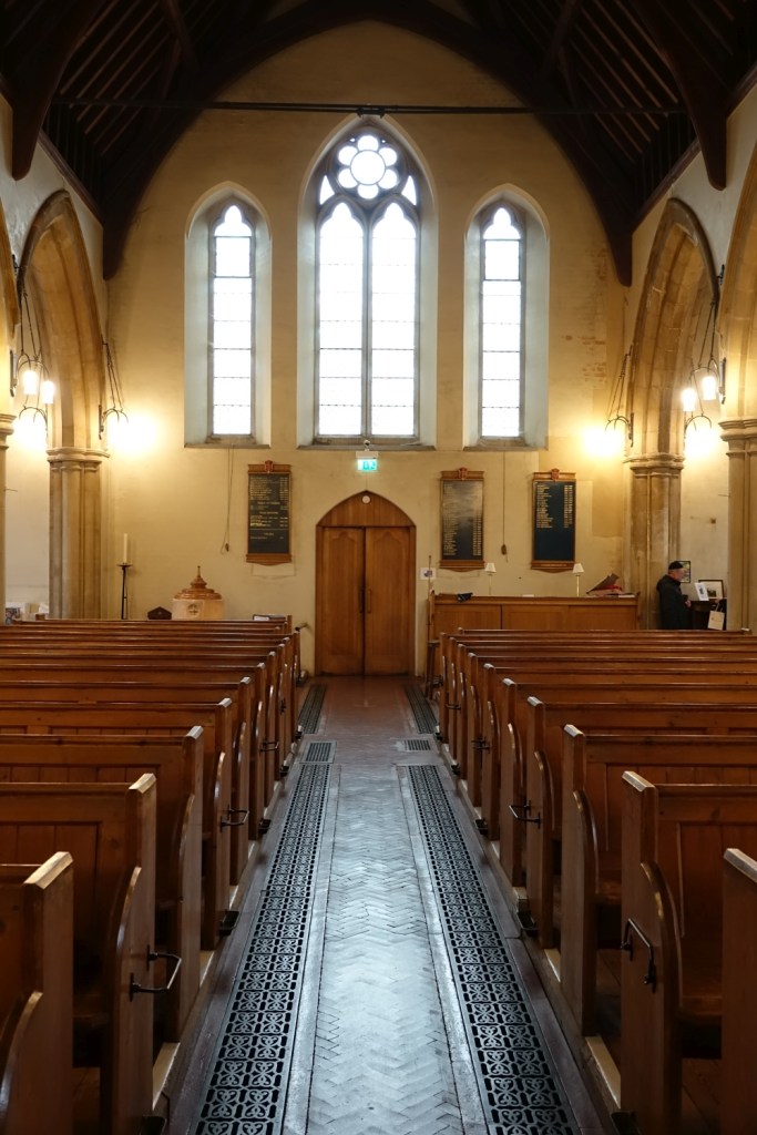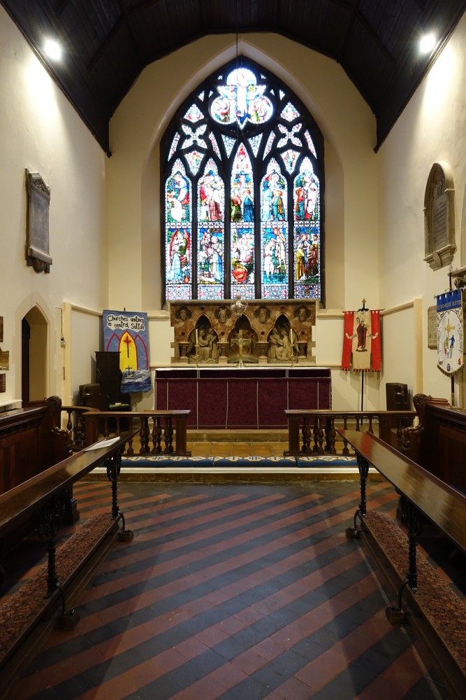 In the “New Town” east of the town centre, this is a church of 1884-91 by Carpenter & Ingelow. The east window is late Morris & Co.