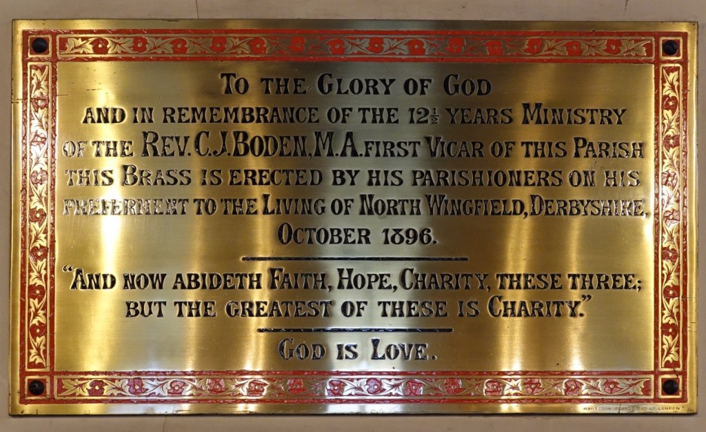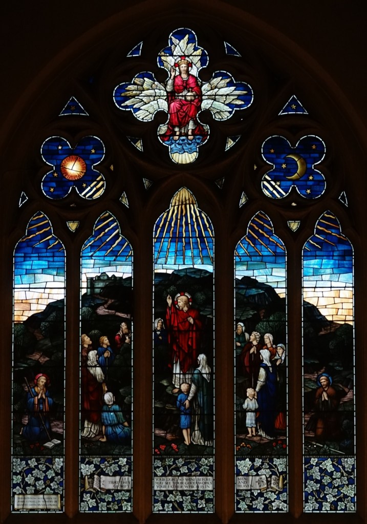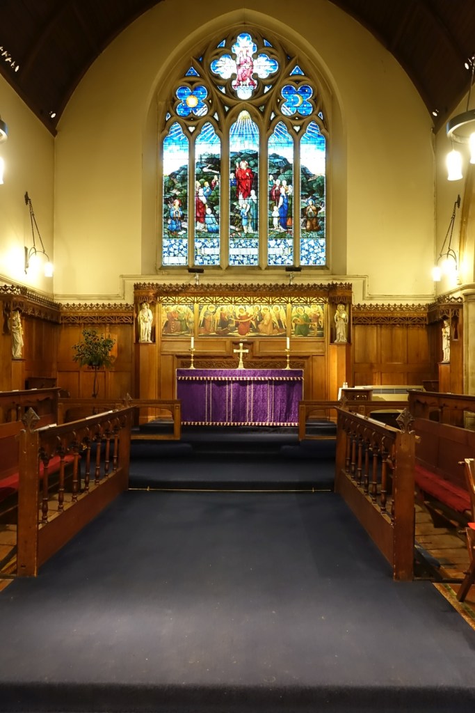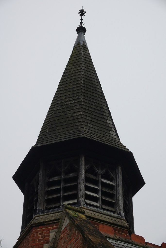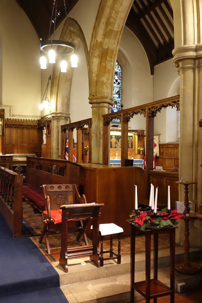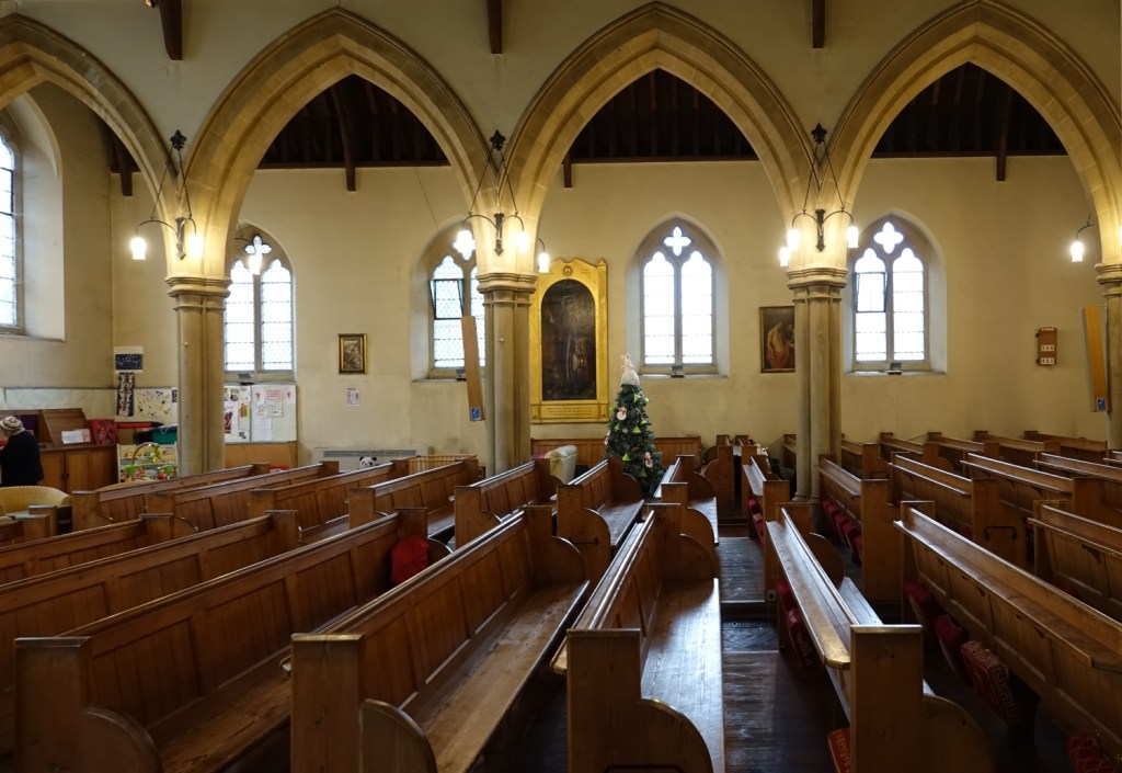 In the “New Town” east of the town centre, this is a church of 1884-91 by Carpenter & Ingelow. The east window is late Morris & Co.