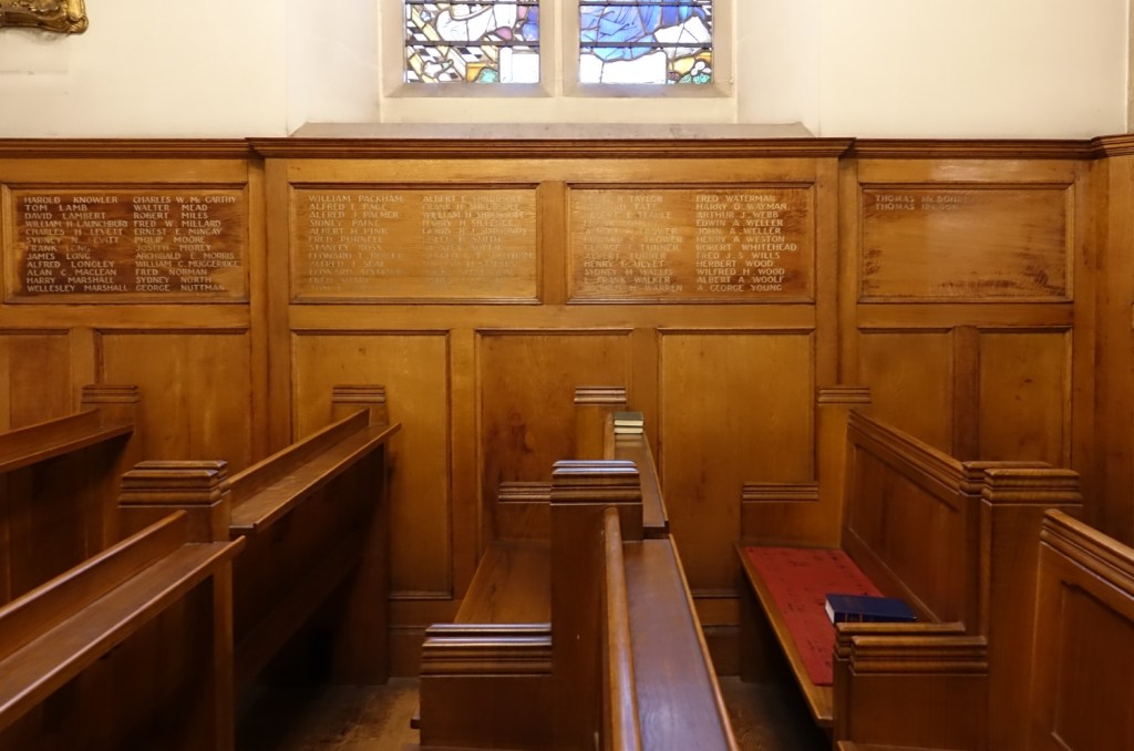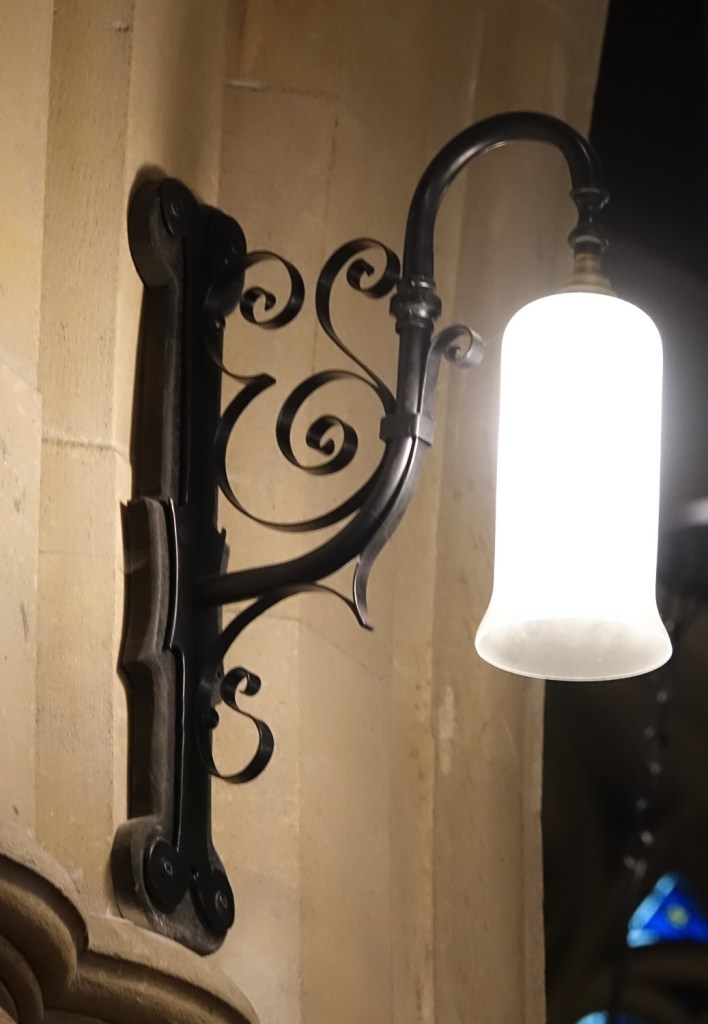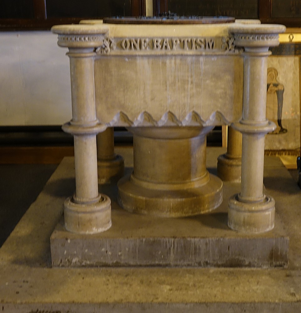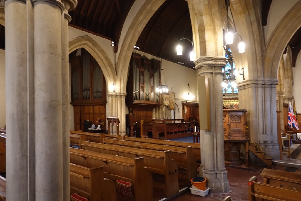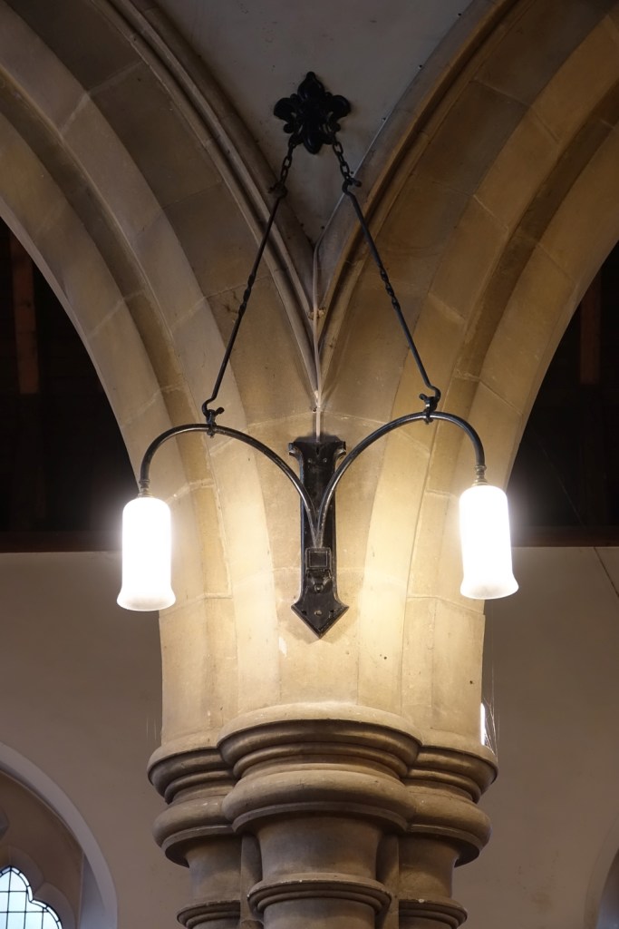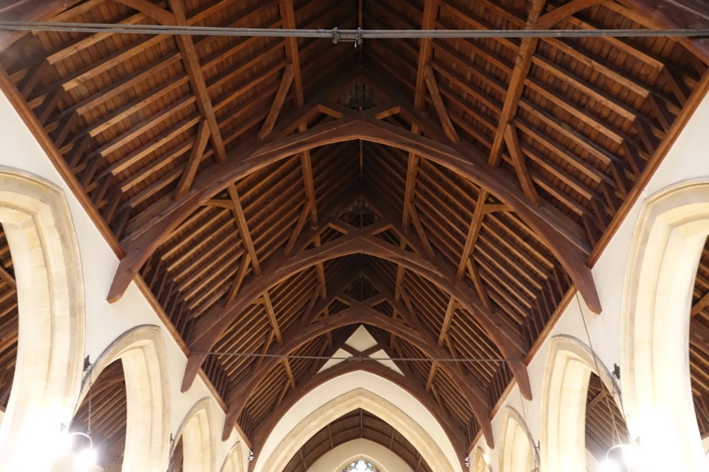 In the “New Town” east of the town centre, this is a church of 1884-91 by Carpenter & Ingelow. The east window is late Morris & Co.
