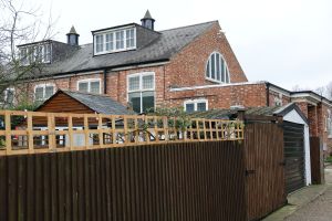 Down a driveway between houses, this is a former church hall of 1925 by E.C. Christmas. It replaced a demolished church in 1982.