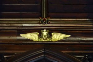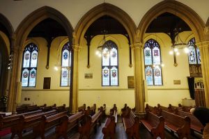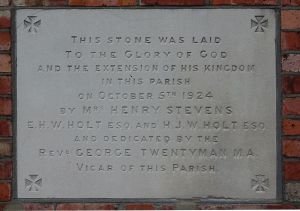 This building of 1982 by Nigel Melhuish replaces a previous church of 1864-1867. The worship area is extendable into a hall and an intermediate space between them. The calvary and war memorial triptych are from the previous building.