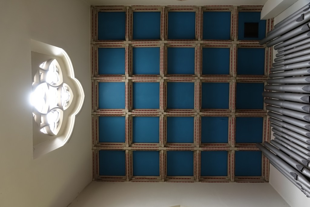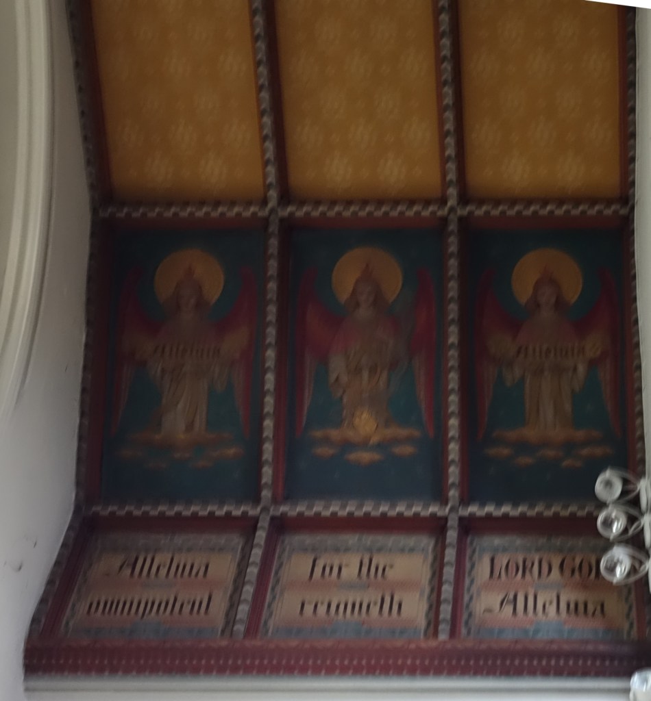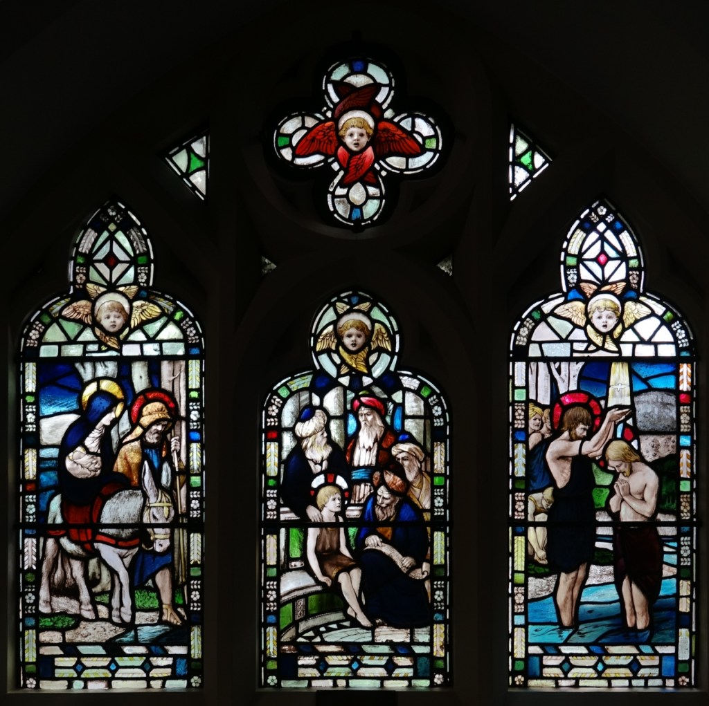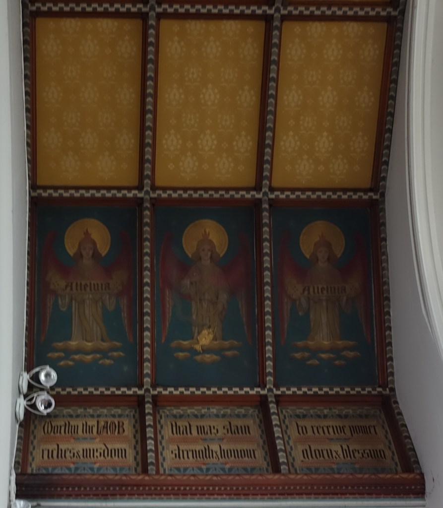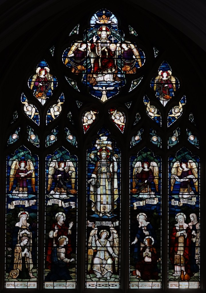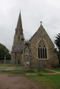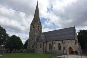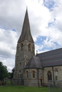 Ealing parish church but now a good mile south of the modern town centre. It is a church of 1735-40 by J. Horne but reimagined by S.S. Teulon 1866-74 in a byzantine manner. The interior is a tour de force of polychrome brickwork, painted ironwork, an elaborate roof structure and glass designed by Thomas Boddington (the treasurer of Teulon’s restoration) and made by Heaton, Butler & Bayne. The yellowish baptistery windows are by Lavers & Barraud. The interior was restored 2002-2003.