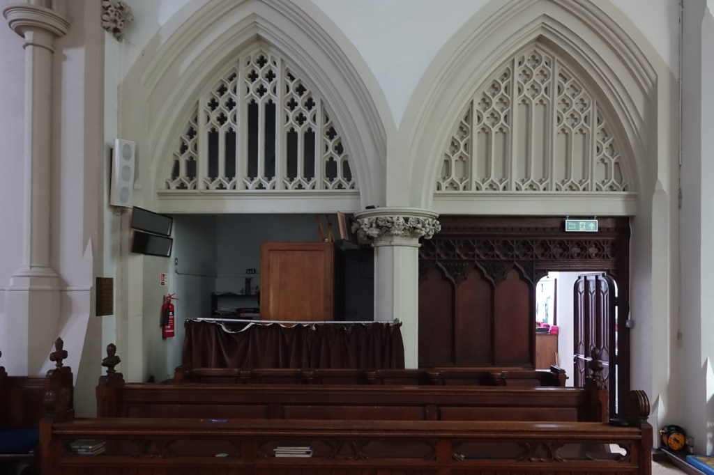 One of S.S.Teulon’s major buildings dating from 1860-62, standing almost alone normally, but currently partly surrounded by a crossrail construction site. As at St Stephen’s, Rosslyn Hill the church stood disused and vandalized, before being restored as Brick Lane Music Hall between 1984-89 by Julian Harrap.