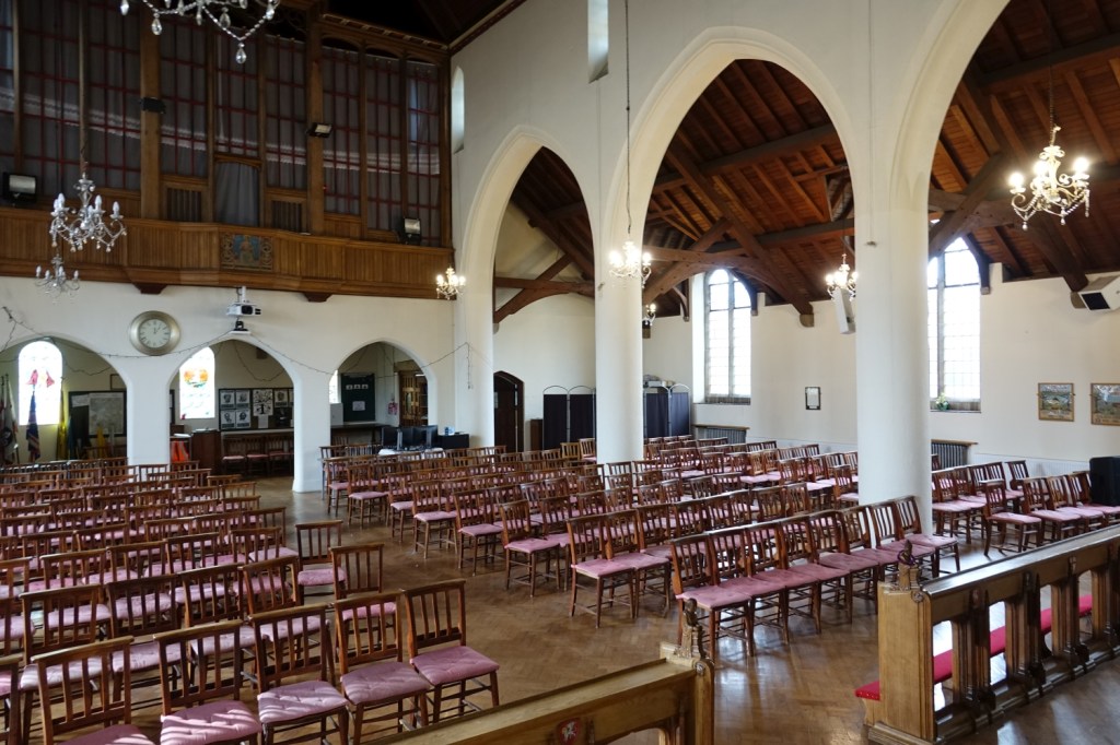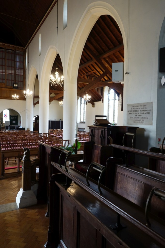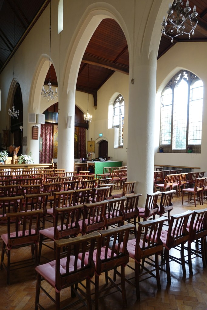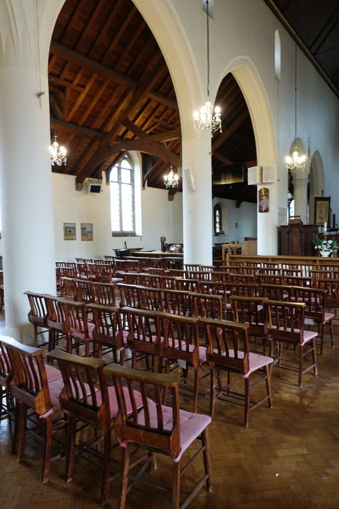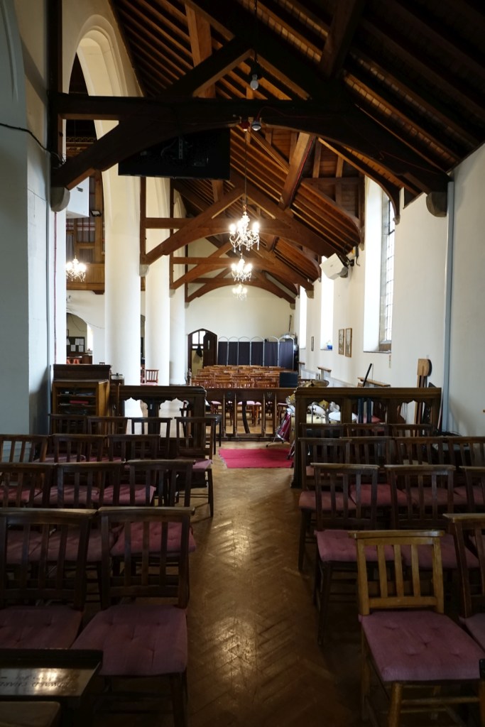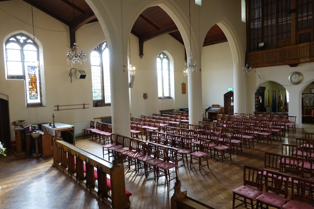 Built in two campaigns – 1871 and 1900 and ascribed by the diocesan website to Richard Norman Shaw. The church is now divided with the nave being used as a hall (though it can be opened out into the eastern parts) and the eastern parts as a church. The aisles are also divided off into other ancillary rooms, several stained glass windows are in toilets and the kitchen.