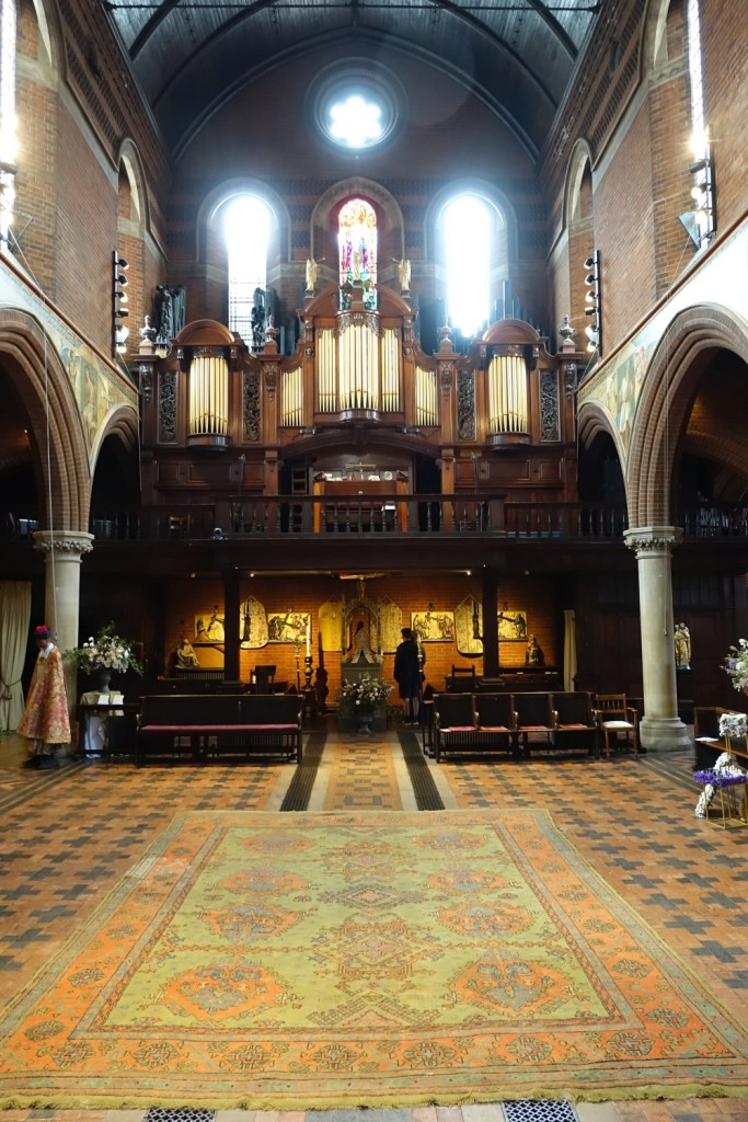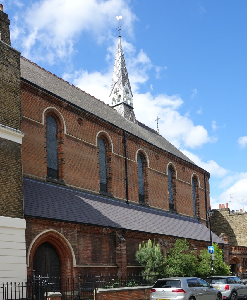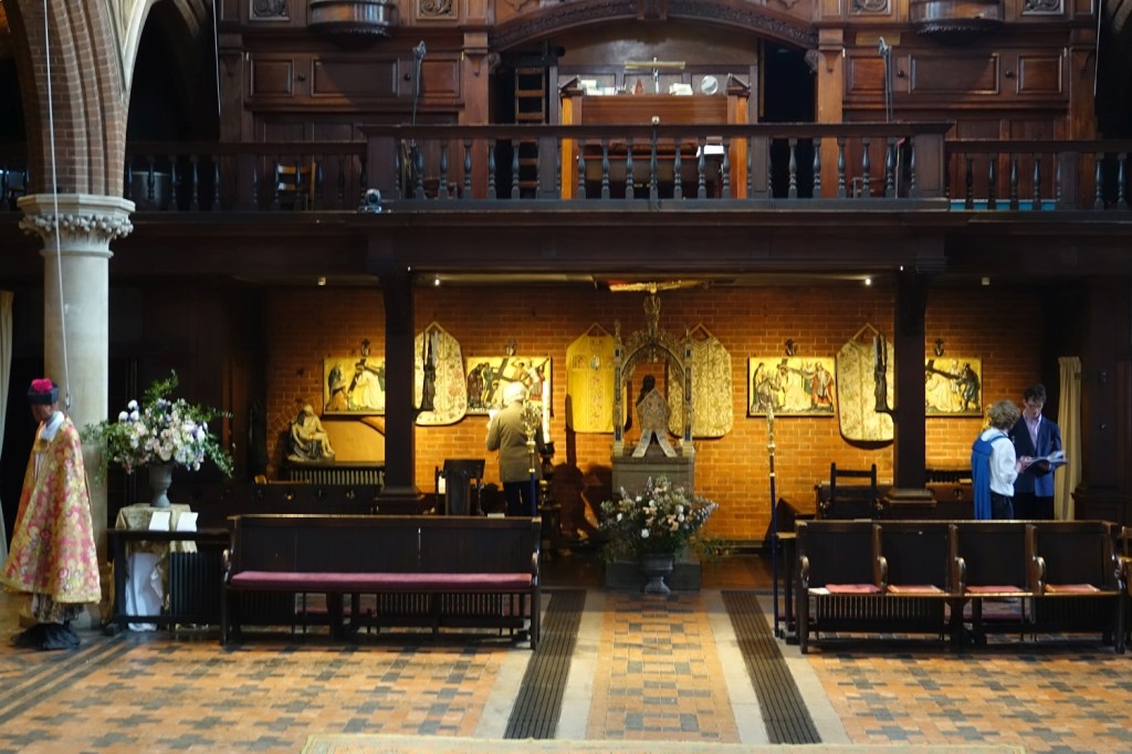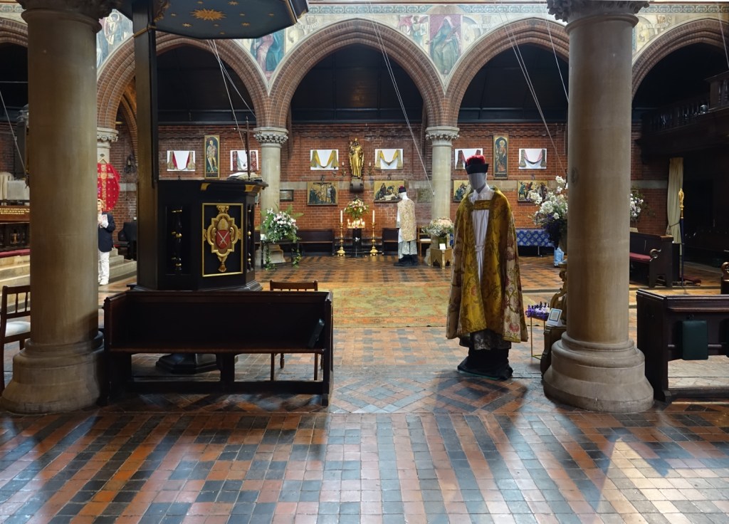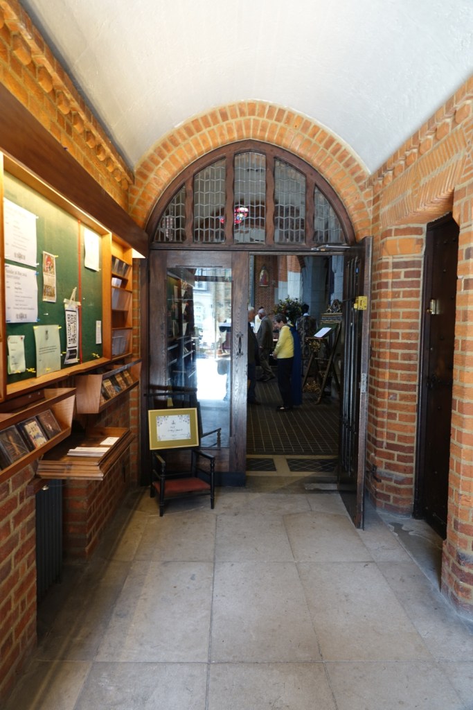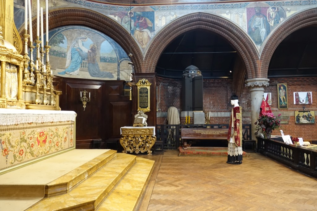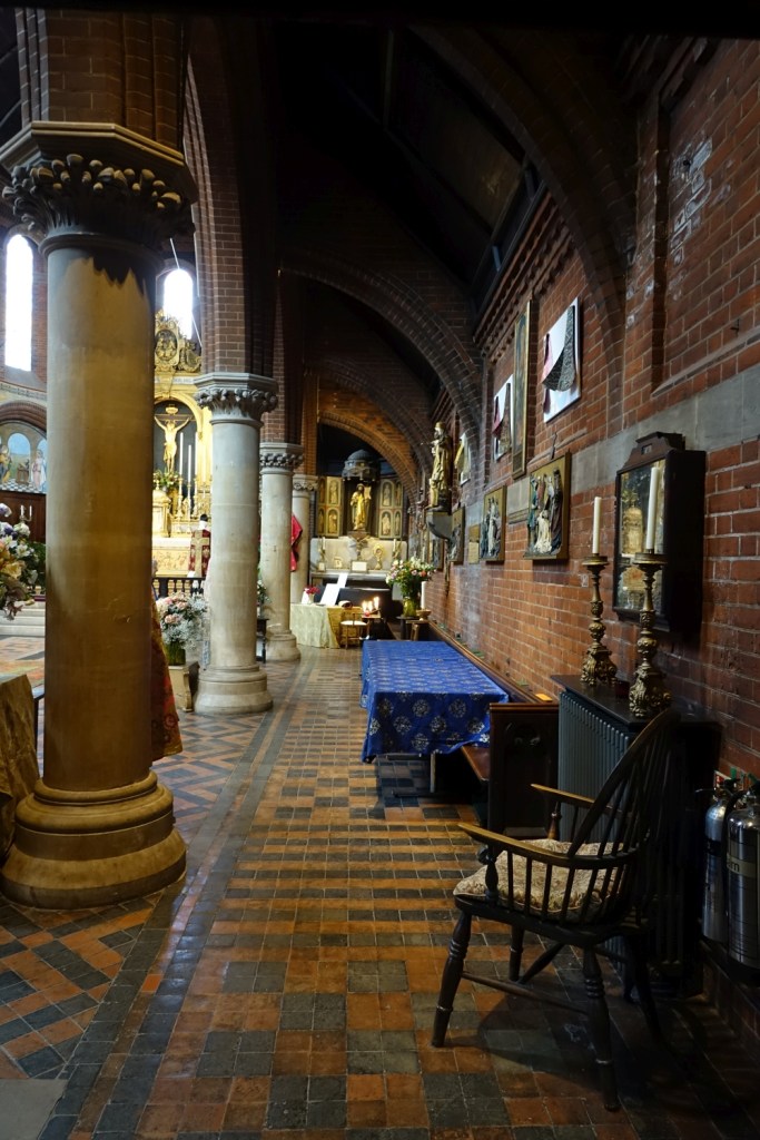 Its entrance is hidden away behind buildings, designed by R.J. Withers in 1873-74. The porch was added by H.S, Goodhart-Rendell 1925-28. It is a centre of high church Anglicanism. These images were taken during an exhibition of vestments and most of the nave seating had been removed.