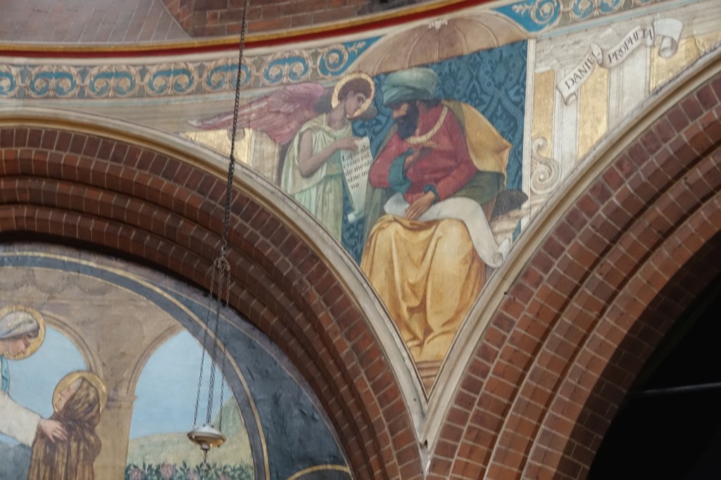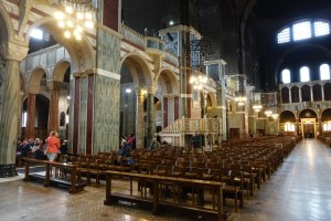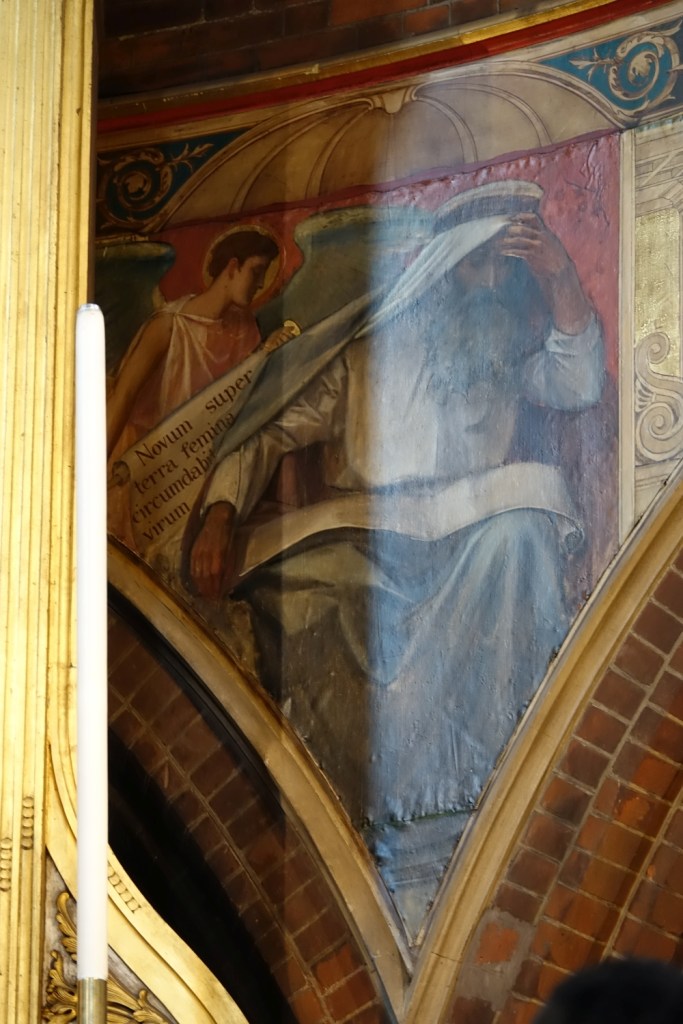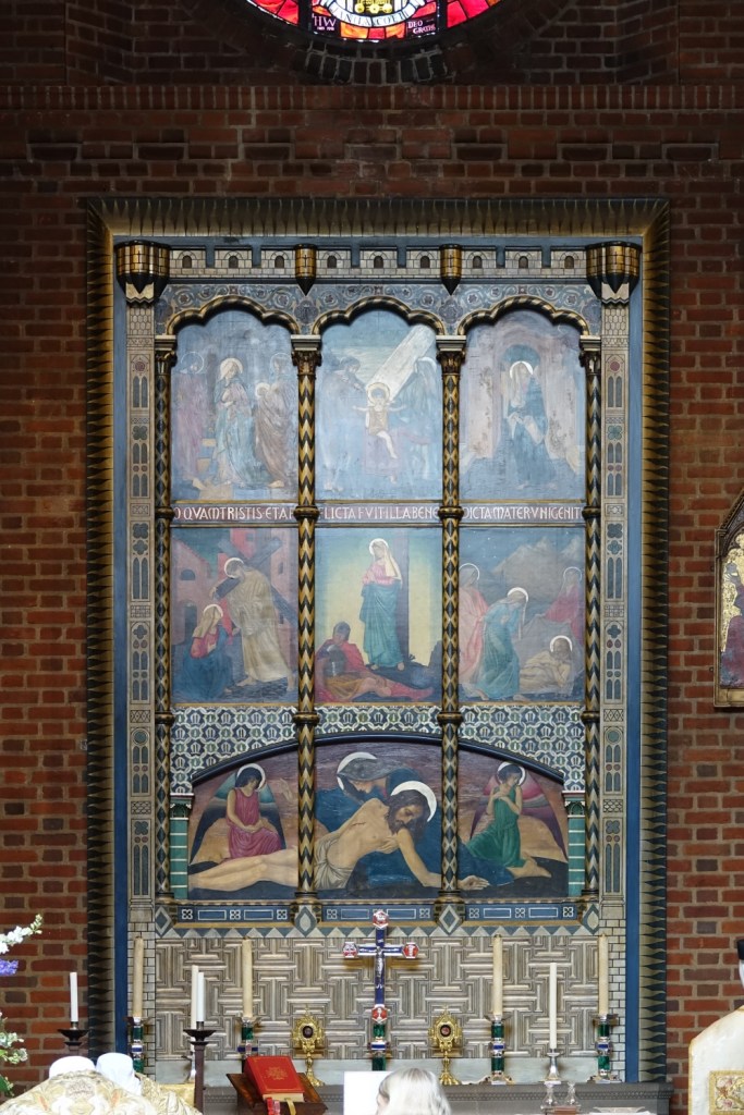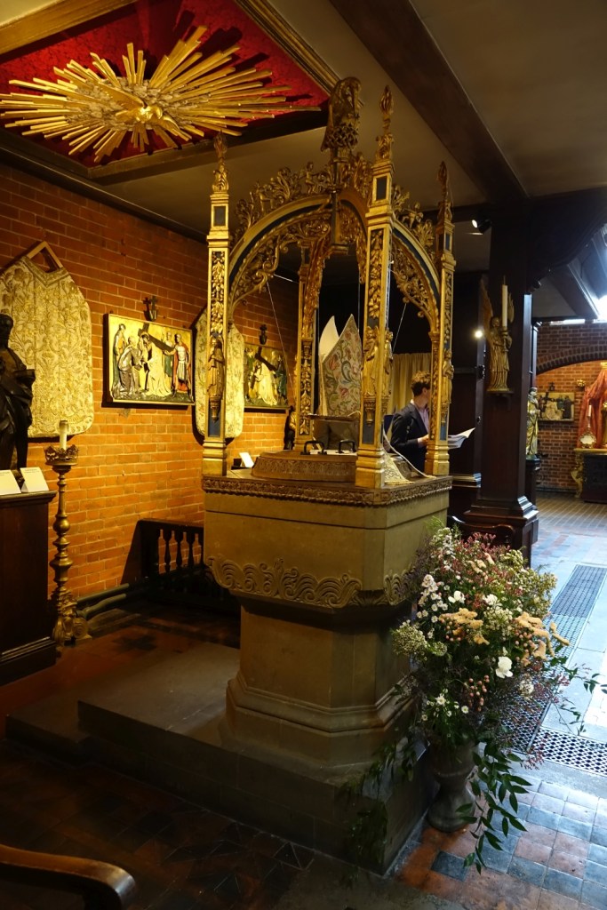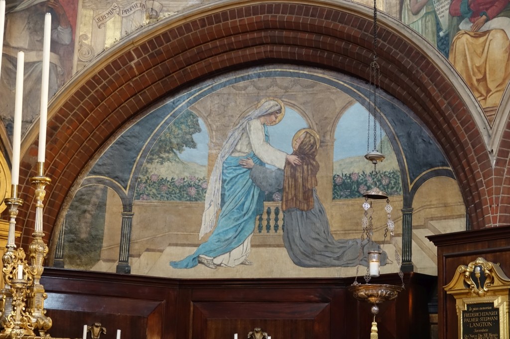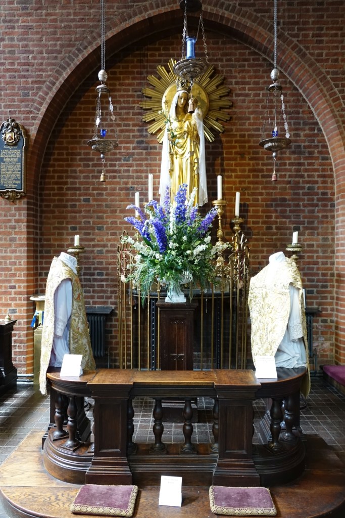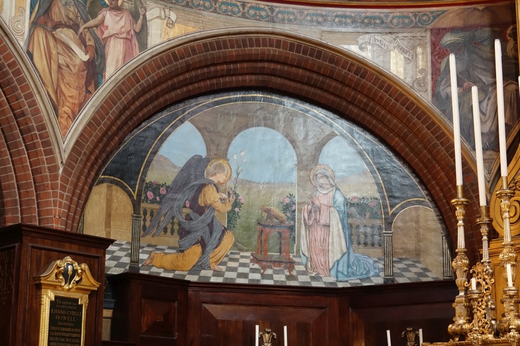 Its entrance is hidden away behind buildings, designed by R.J. Withers in 1873-74. The porch was added by H.S, Goodhart-Rendell 1925-28. It is a centre of high church Anglicanism. These images were taken during an exhibition of vestments and most of the nave seating had been removed.