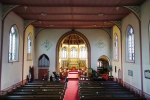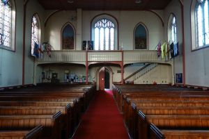On Green Lanes the main road through the suburb, it was originally by J.S. Alder dating from 1906-07, but apart from the tower and west end, heavily rebuilt and reorientated after a fire in 1978.