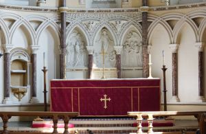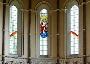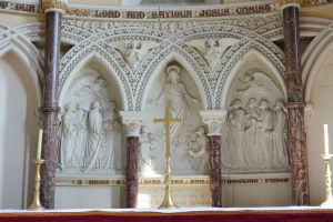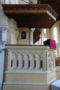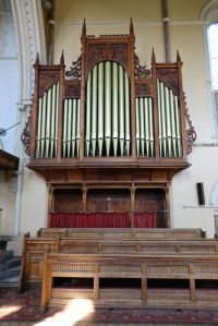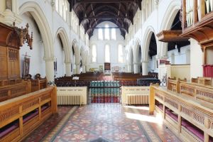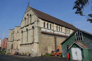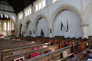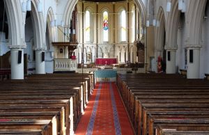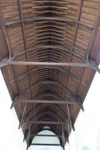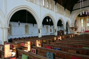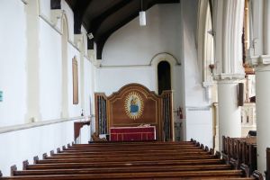 From the street, one sees the east end of a church which was added in 1888-89 by W.O. Milne to a church by Charles Bacon from 1817. However, a fire in 1969 reduced the church to the tower and a shell. It was rebuilt in 1971-72 to designs by John Phillips to produce a wide, open space with a side chapel next to the former east end. Many monuments from the previous church (and its predecessor) survived the fire and are mounted around the walls.