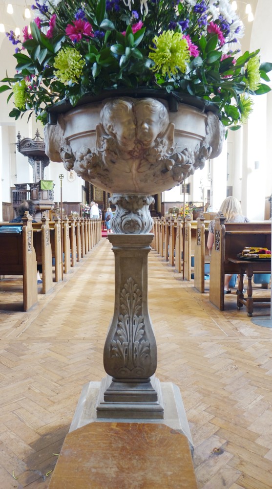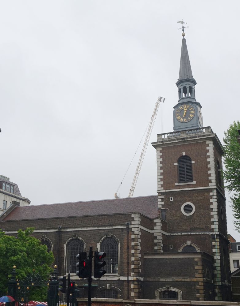 The tower of All Hallows, Lombard Street in the City of London was erected here in 1938-1940 alongside a new church by Robert Atkinson. Many of the contents of that church of 1686-94 by Christopher Wren were also re used in the new church as were some from St Benet Gracechurch and St Dionis Backchurch. The interior is bedecked with flags of the nations in the 2015 Rugby Union World Cup as the church is only a short way from Twickenham stadium.