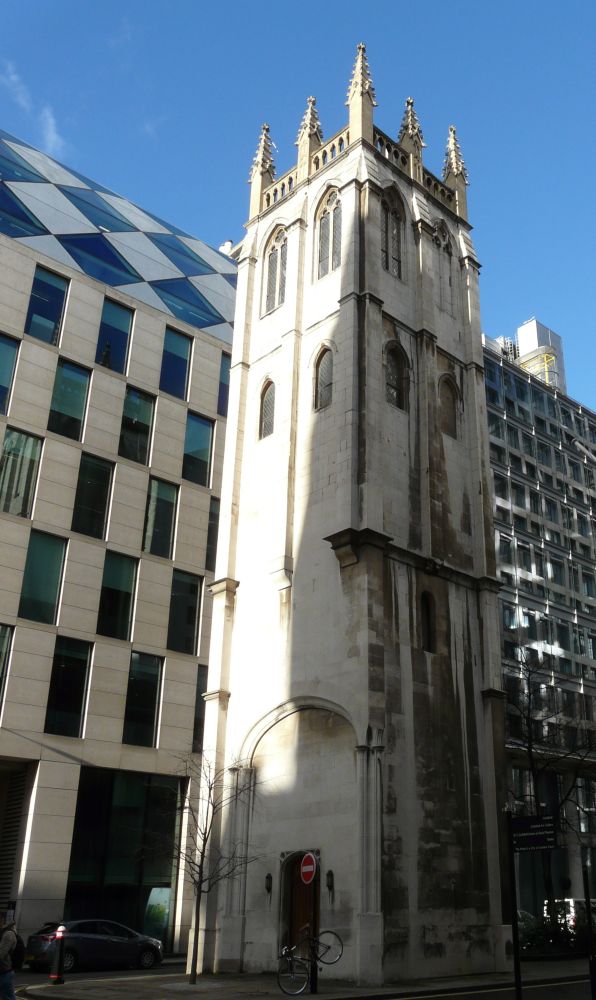 This is a tower of 1682-87, by Wren, of a church bombed in WW2 and demolished in 1955. The tower was converted into a house 1984-85 by Frederick Burn, Smith and Partners.