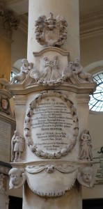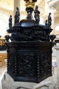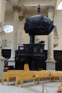 Sir Christopher Wren’s masterpiece and one of London’s symbols. Built after the Great fire had destroyed the much restored medieval cathedral. construction began in 1675 and was completed by 1711. In WW2 there was restoration by Godfrey Allen after bombing of the choir and north transept. There are many, mainly military, monuments from 1790 onwards in the nave (the Wellington monument is shown below) and transepts and many more to a wider variety of people in the crypt. Although Nelson and Wellington are interred there. The inside of the dome was painted by Sir James Thornhill between 1716-1720. At the crossing and east end mosaics dating from 1864 to 1904 were added to the ceilings, designed by William Blake Richmond and the spandrels by G.F, Watts and Alfred Stevens. The baldacchino over the altar dates from the post war restoration. The choir stalls and organ case were carved by Grinling Gibbons.